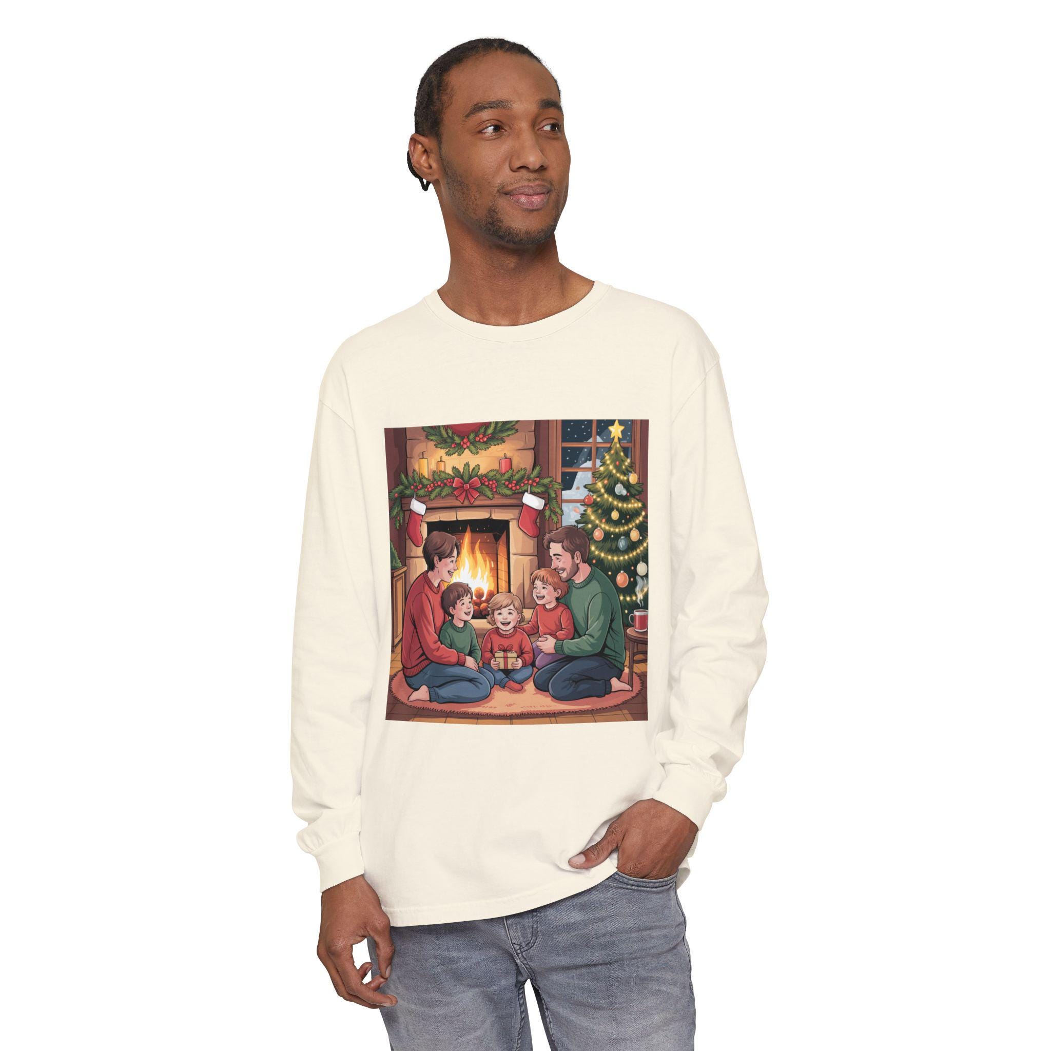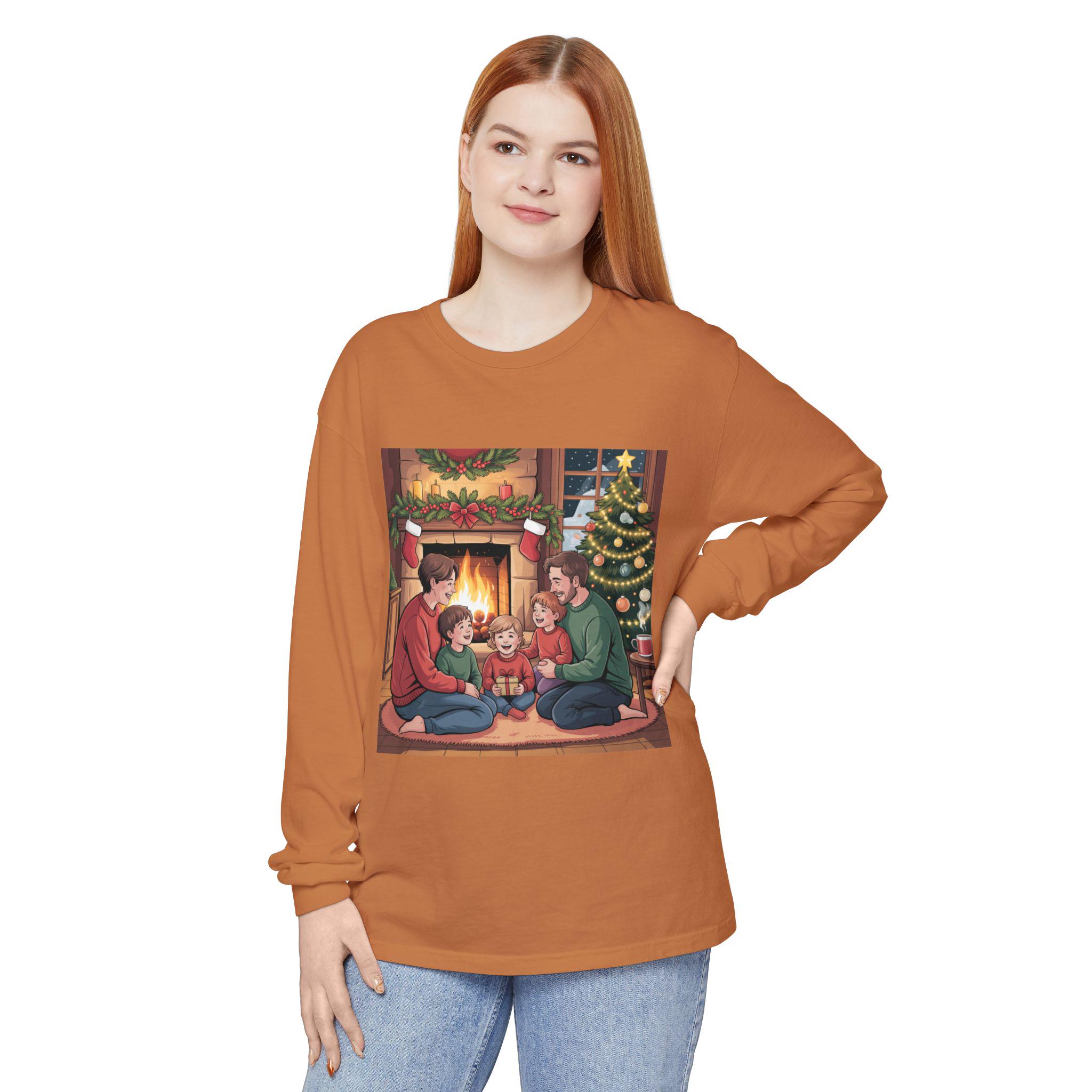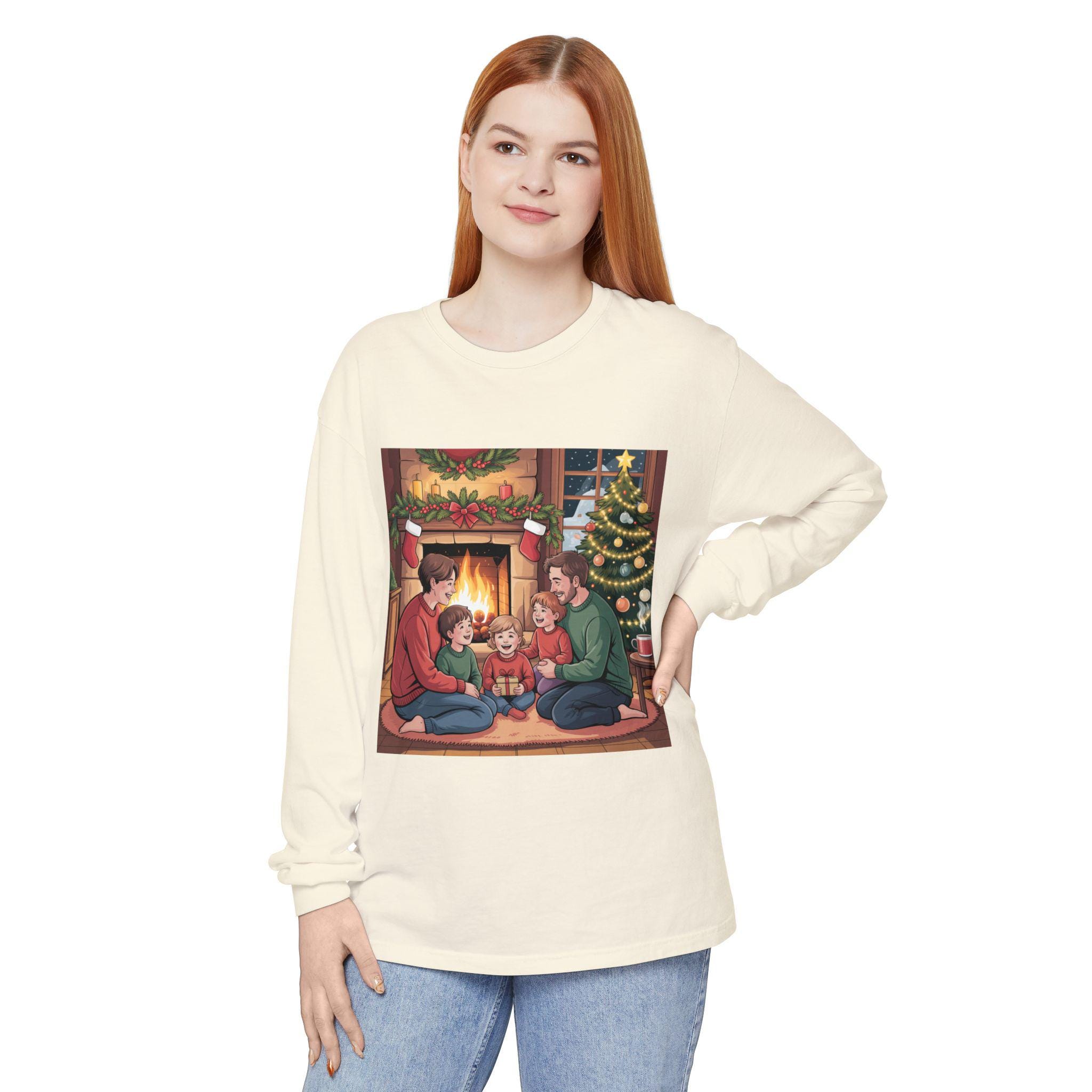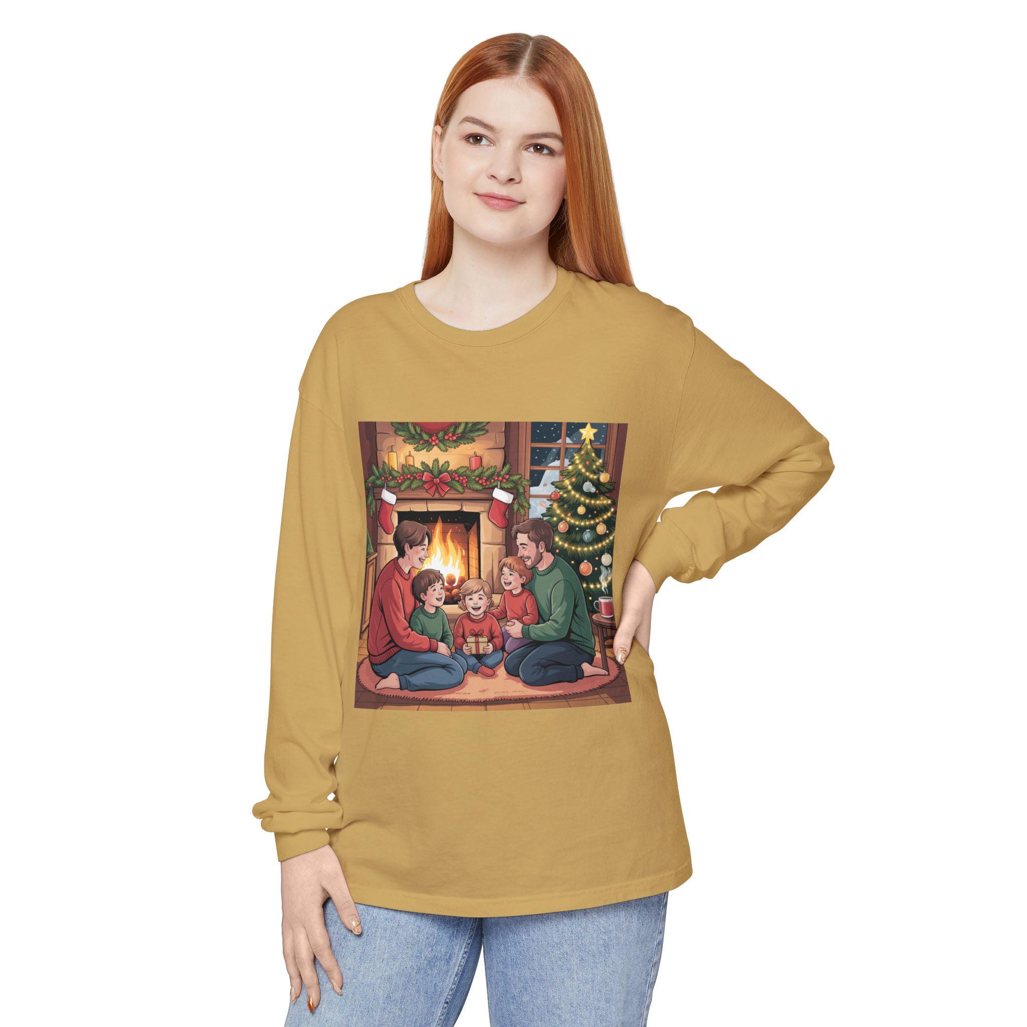 A festive Christmas family-themed long sleeve T-shirt in a unisex style, perfect for the holiday season. Made for adults, this garment-dyed T-shirt features double needle sleeve and bottom hems, ribbed-knit cuffs, neck and shoulder tape, and is made from 100% ring spun cotton.