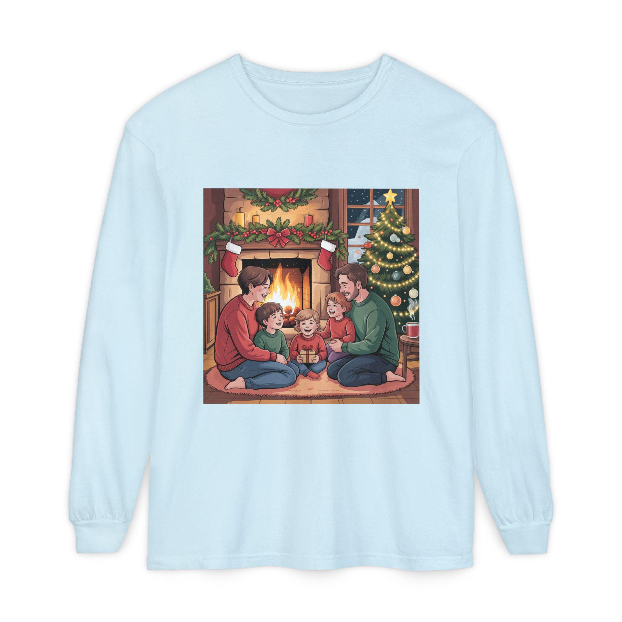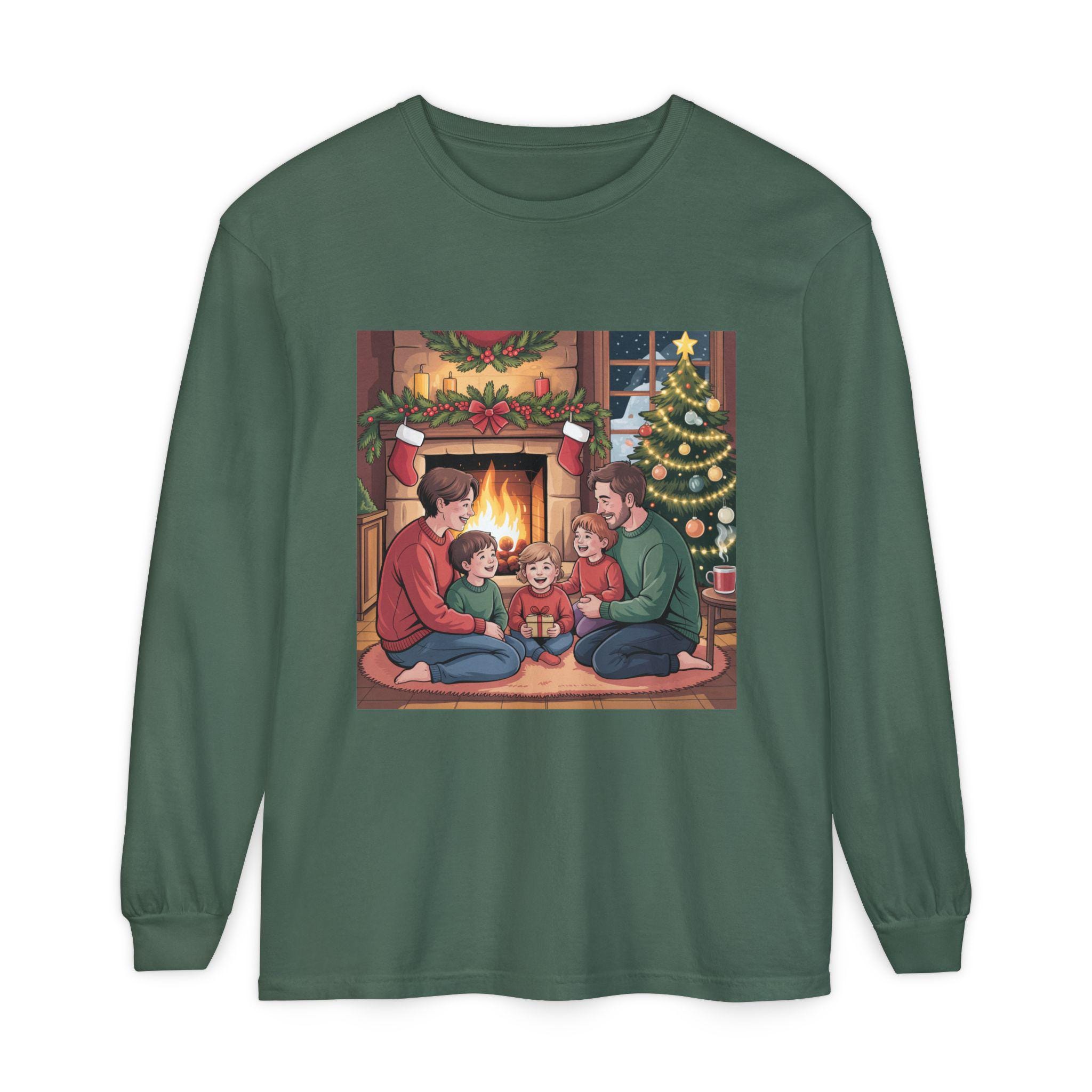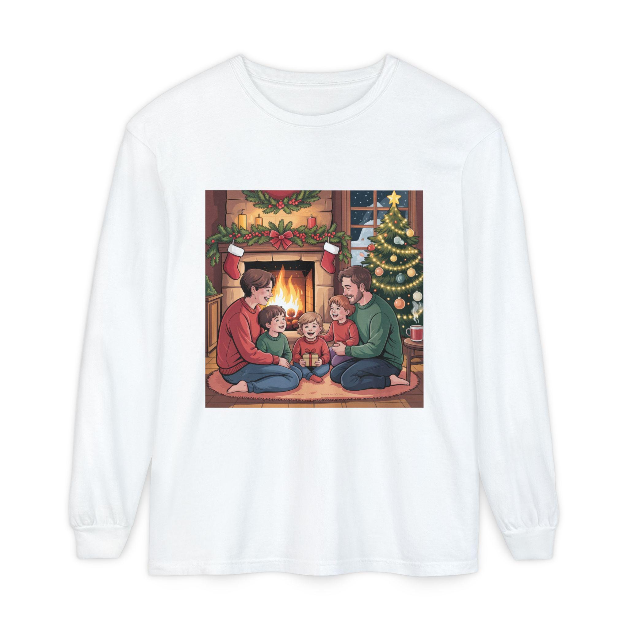 A festive Christmas family-themed long sleeve T-shirt in a unisex style, perfect for the holiday season. Made for adults, this garment-dyed T-shirt features double needle sleeve and bottom hems, ribbed-knit cuffs, neck and shoulder tape, and is made from 100% ring spun cotton.