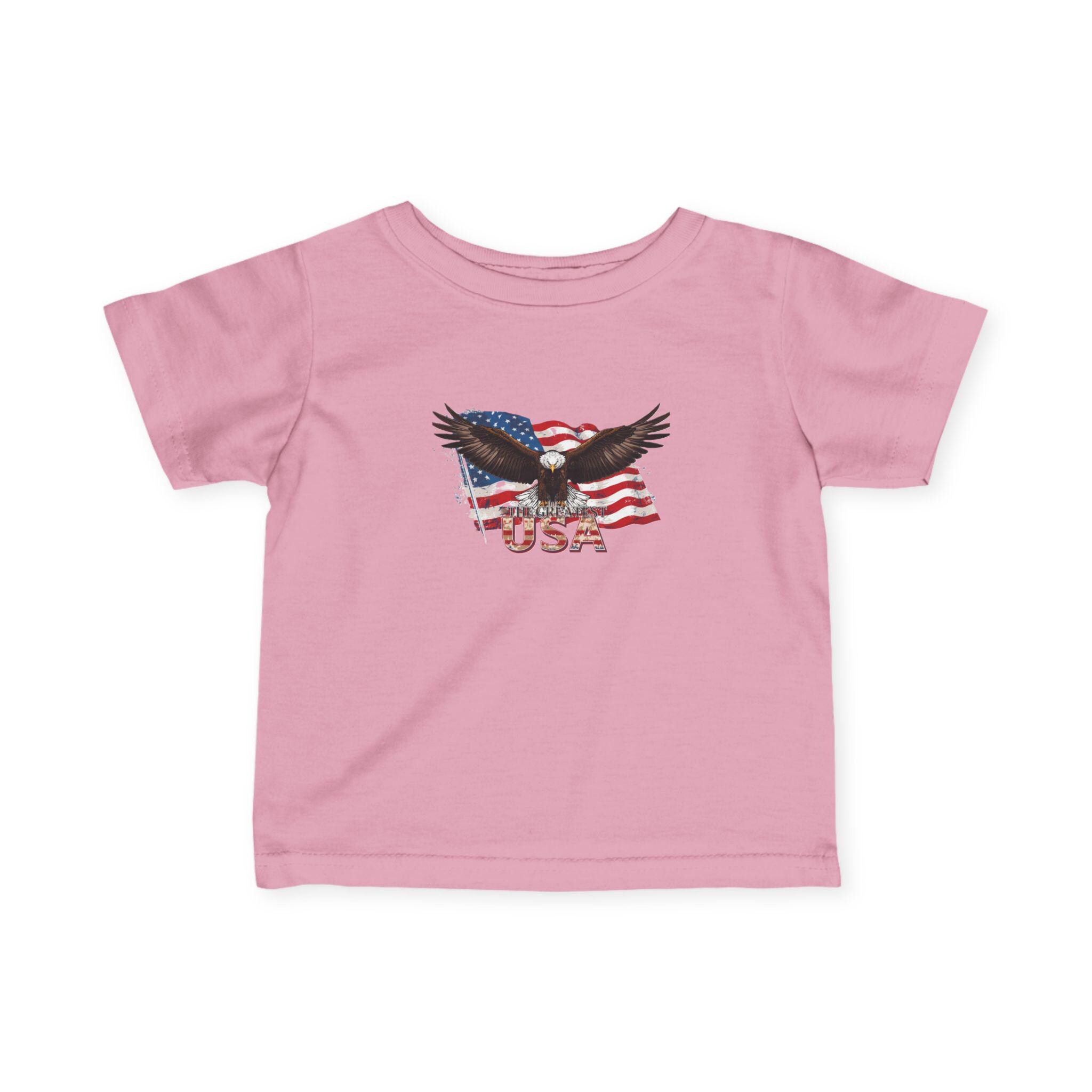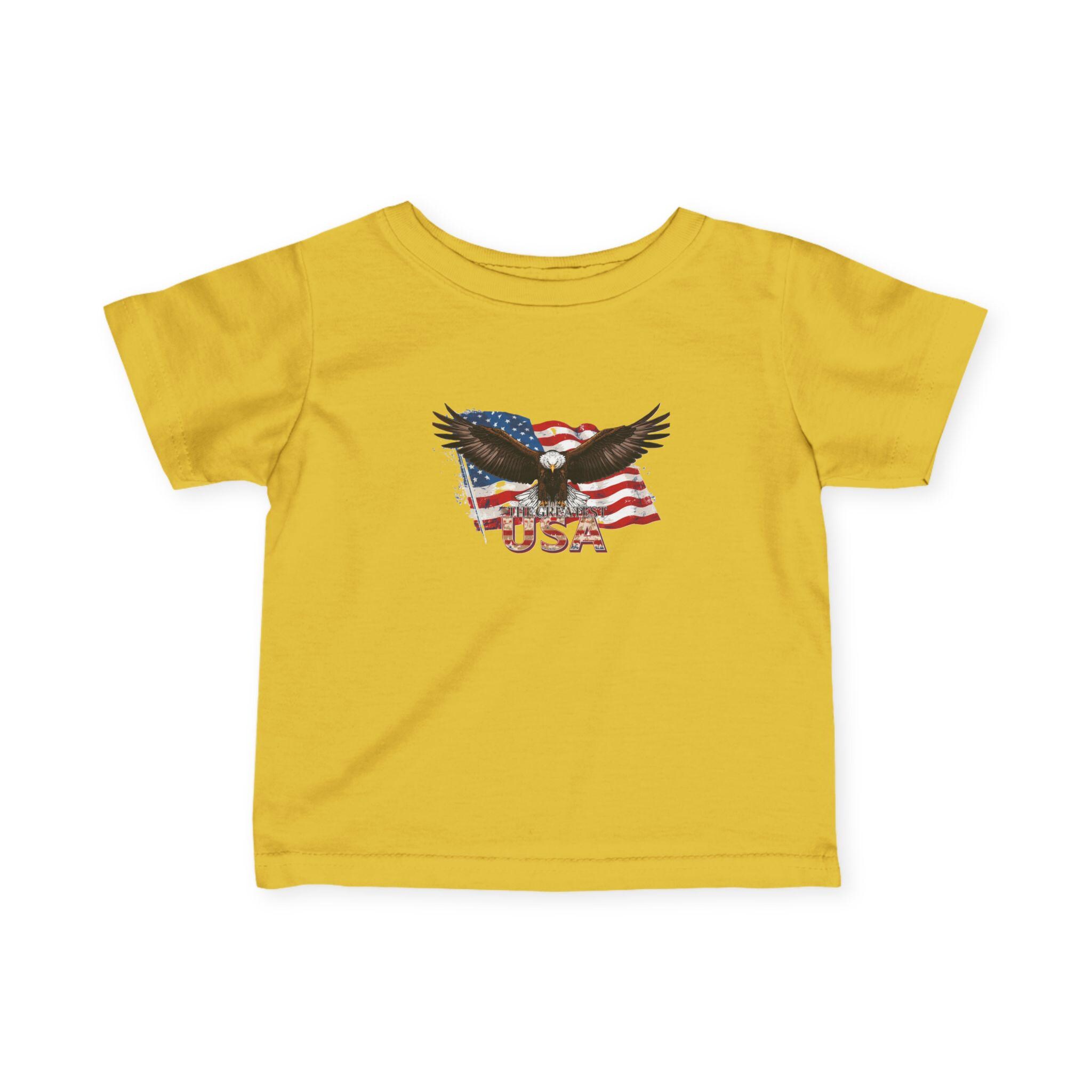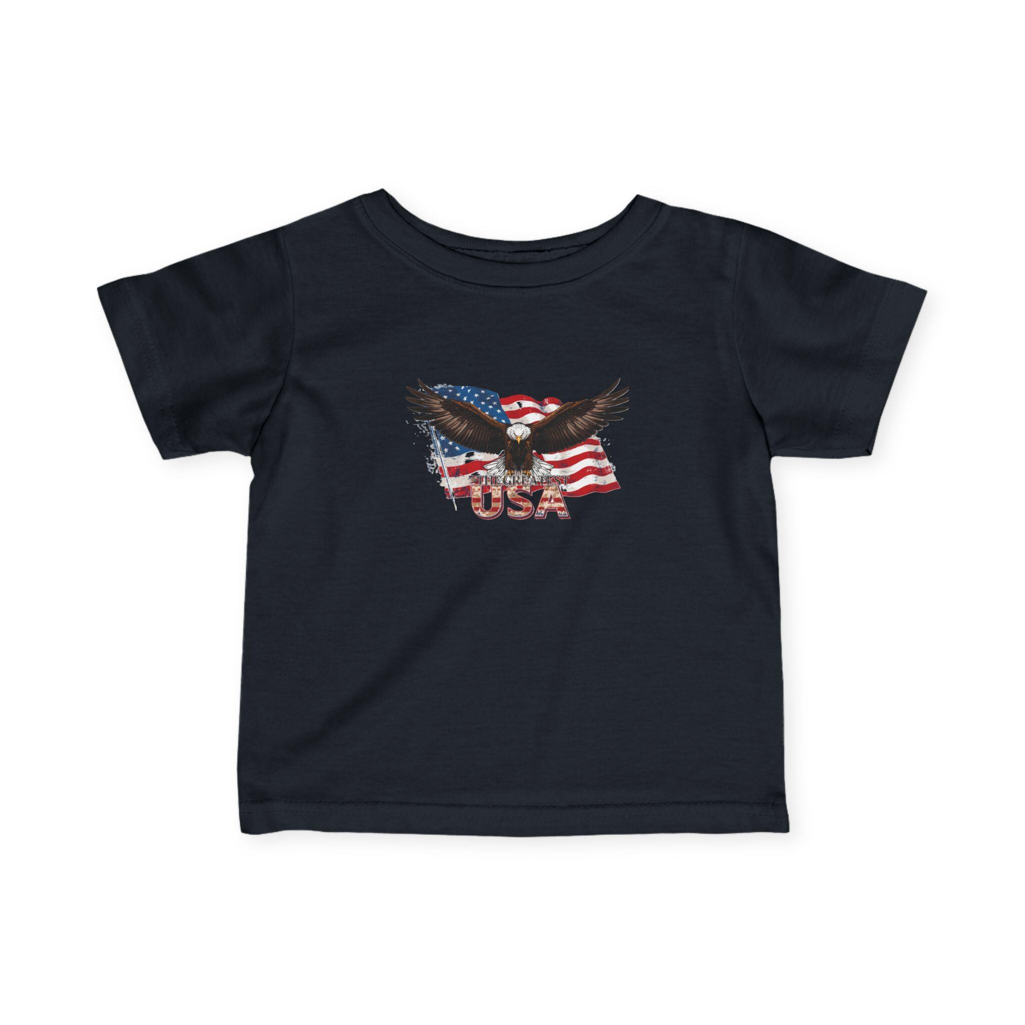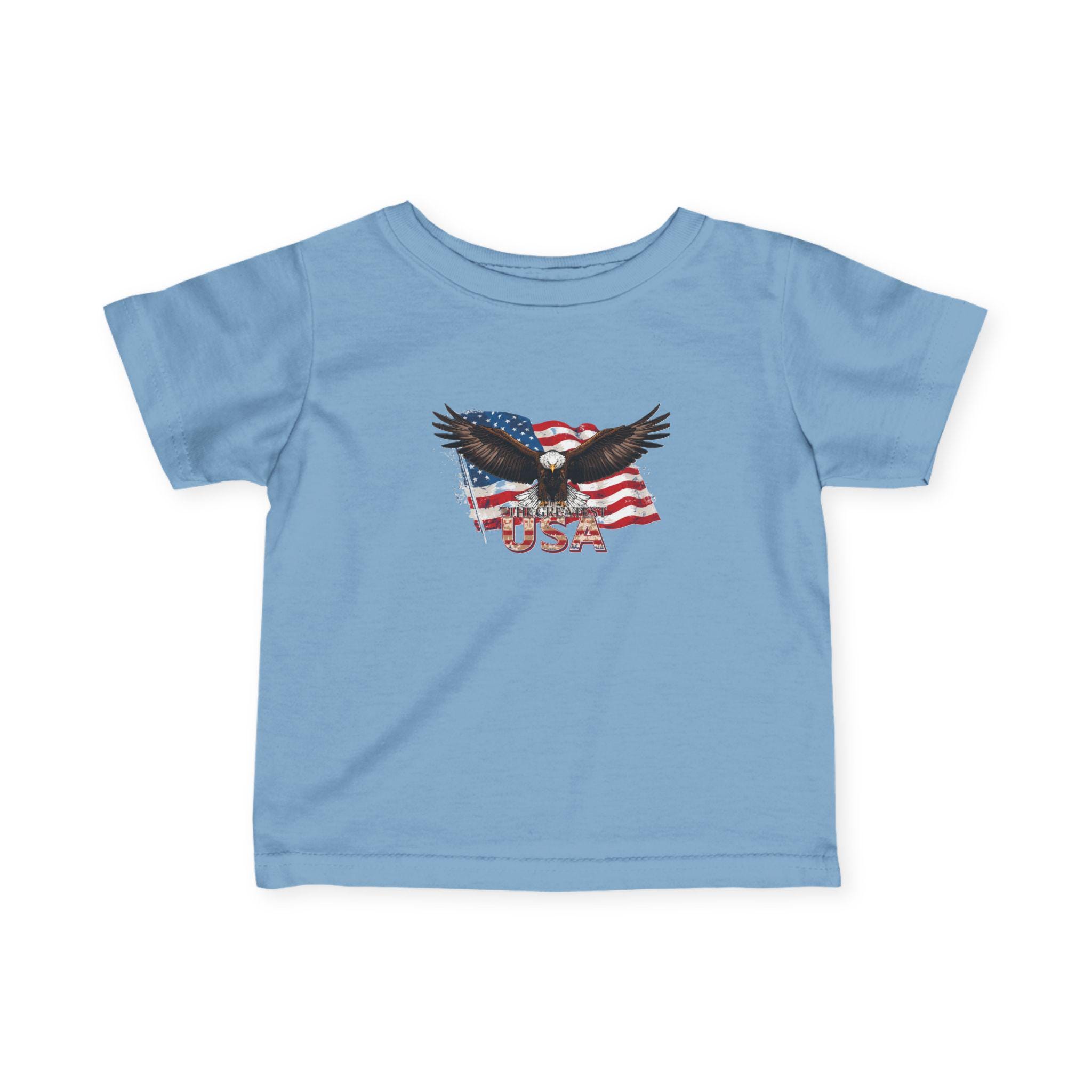 Introduce your little ones to a world of comfort and style with this adorable Infant Fine Jersey Tee. Crafted from ultra-soft fabric, this tee is designed for all-day play and adventure. Its classic fit ensures a relaxed and comfortable feel, while the ribbed knit collar maintains its shape wash after wash. With a vibrant design featuring an eagle and the USA flag, this tee embodies a spirited vibe, perfect for celebrating freedom and patriotism. Whether it's an Independence Day barbecue, a family gathering, or just a casual day out, this shirt fits seamlessly into your child's wardrobe. Ideal for infants and toddlers, it makes a thoughtful gift for baby showers or birthdays. This tee will not only make your child feel great but also showcase their budding personality with pride!