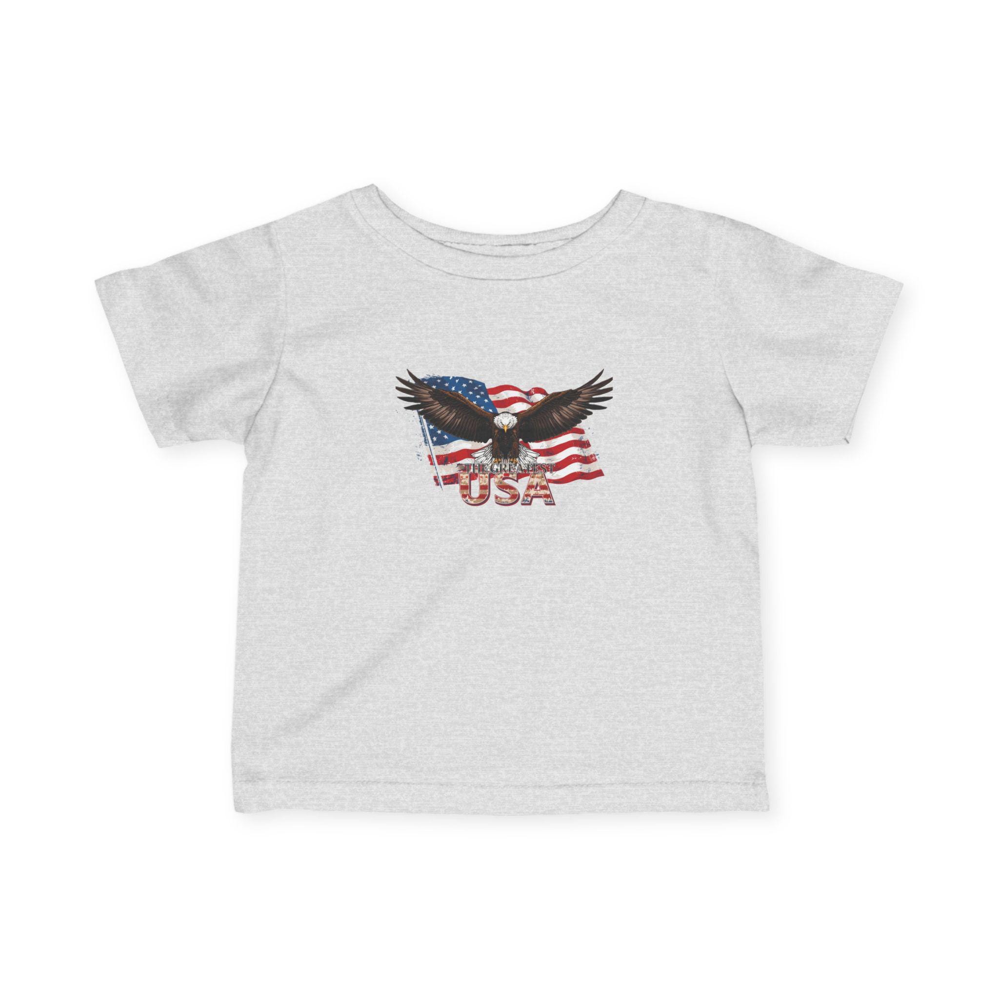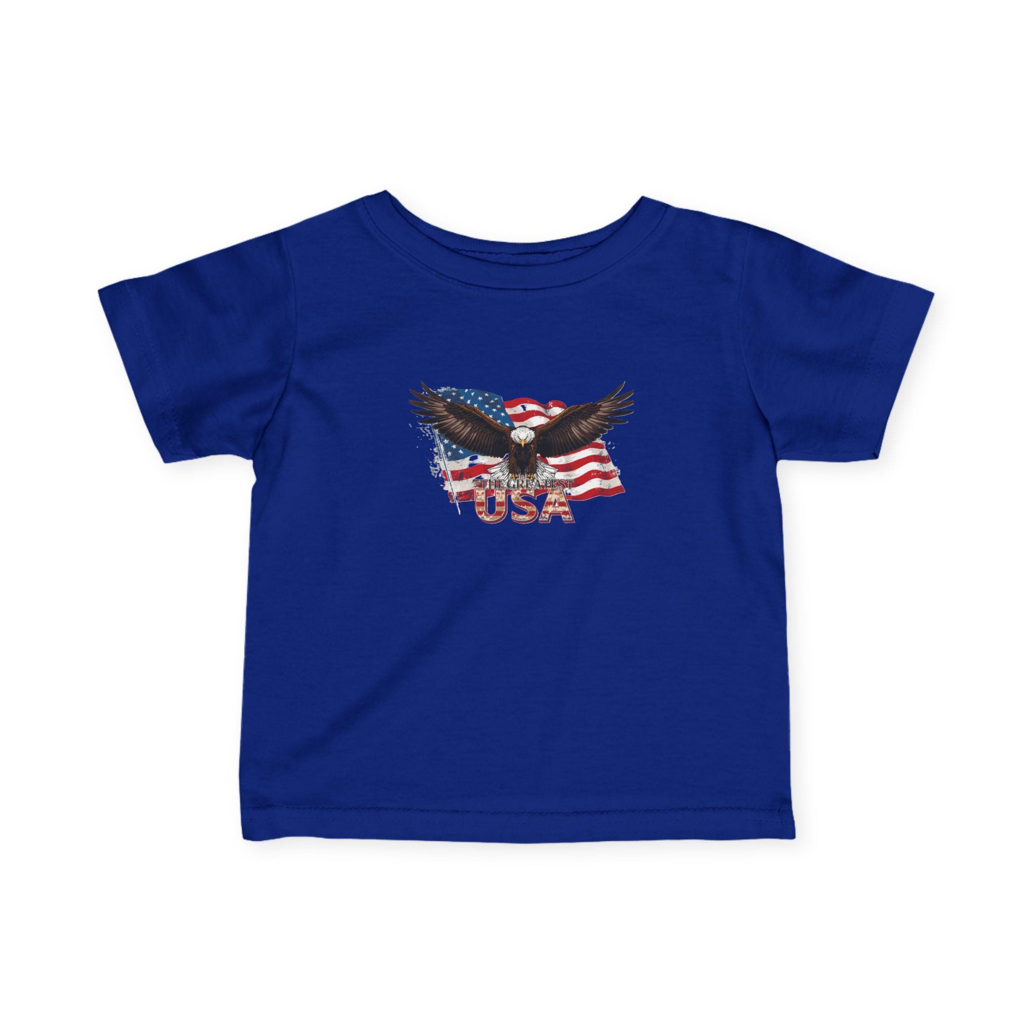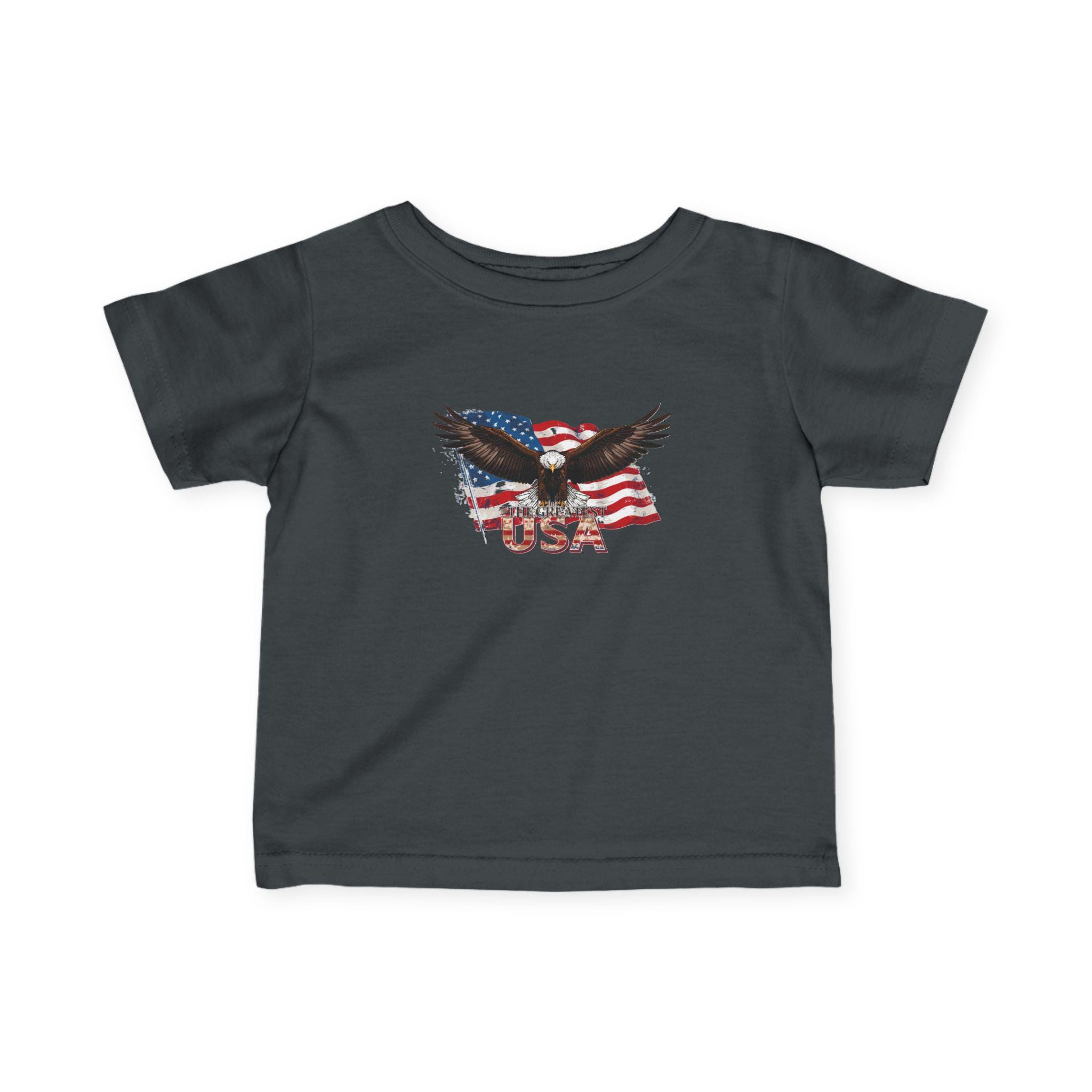 Introduce your little ones to a world of comfort and style with this adorable Infant Fine Jersey Tee. Crafted from ultra-soft fabric, this tee is designed for all-day play and adventure. Its classic fit ensures a relaxed and comfortable feel, while the ribbed knit collar maintains its shape wash after wash. With a vibrant design featuring an eagle and the USA flag, this tee embodies a spirited vibe, perfect for celebrating freedom and patriotism. Whether it's an Independence Day barbecue, a family gathering, or just a casual day out, this shirt fits seamlessly into your child's wardrobe. Ideal for infants and toddlers, it makes a thoughtful gift for baby showers or birthdays. This tee will not only make your child feel great but also showcase their budding personality with pride!