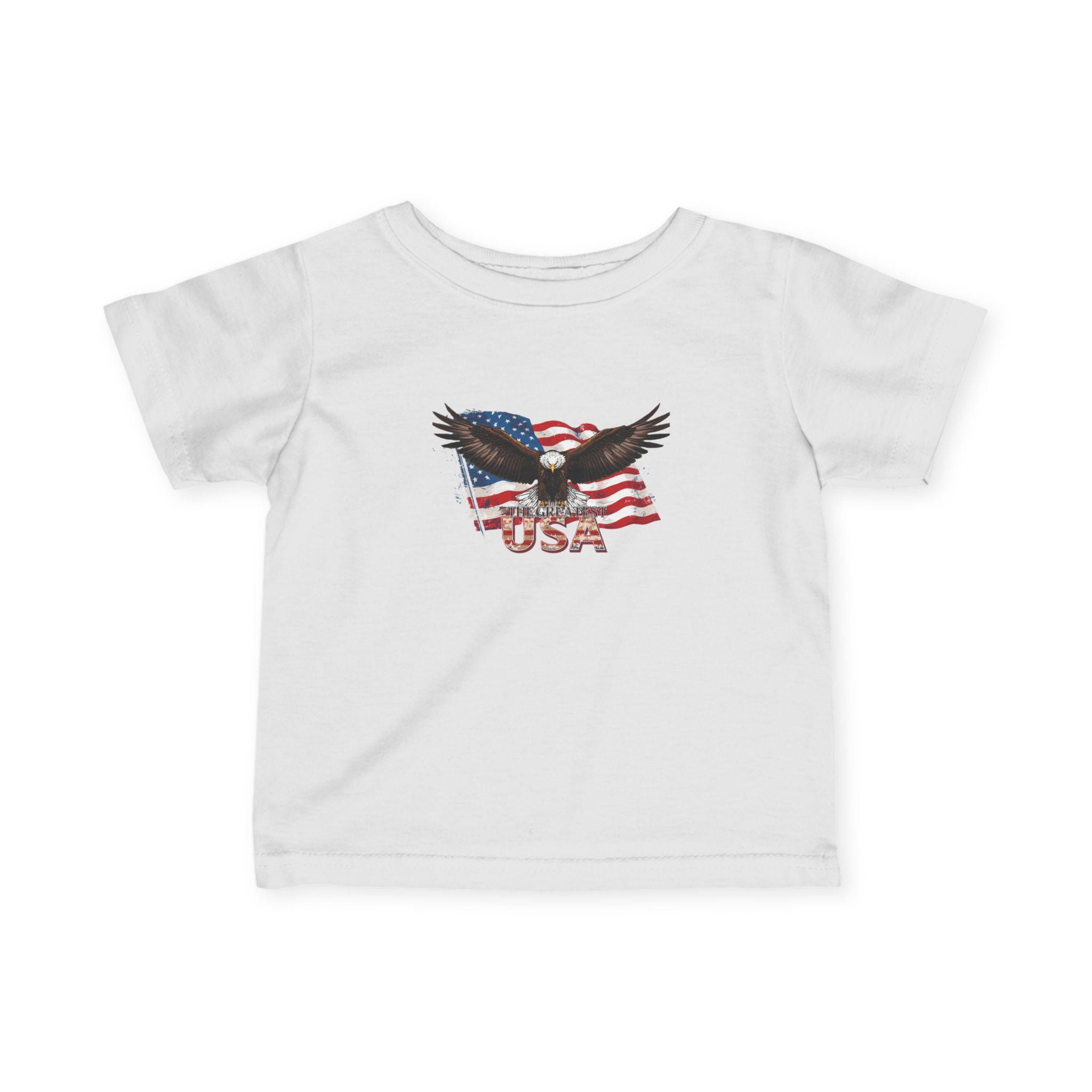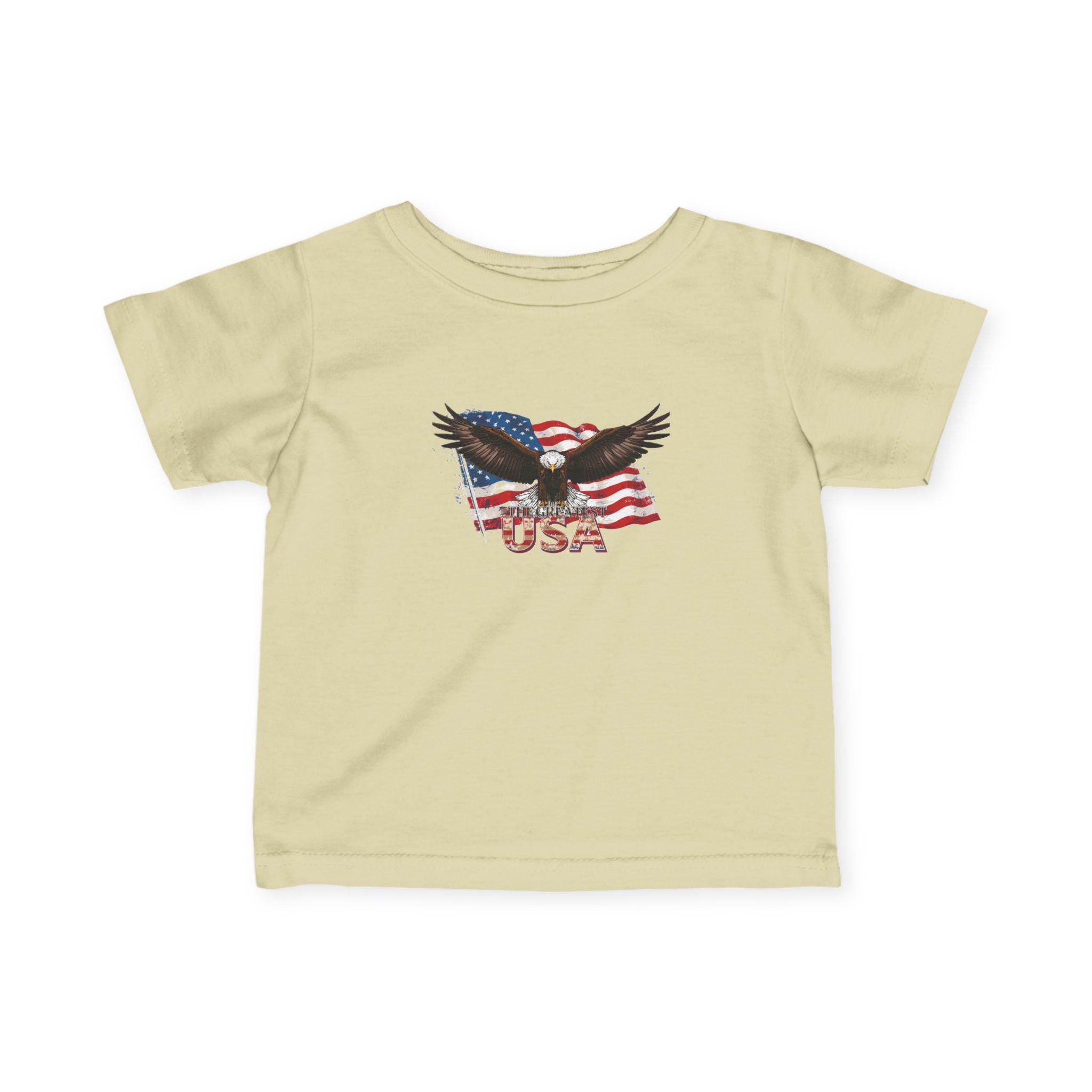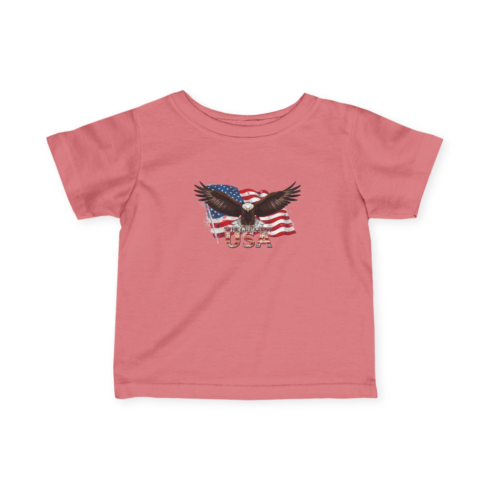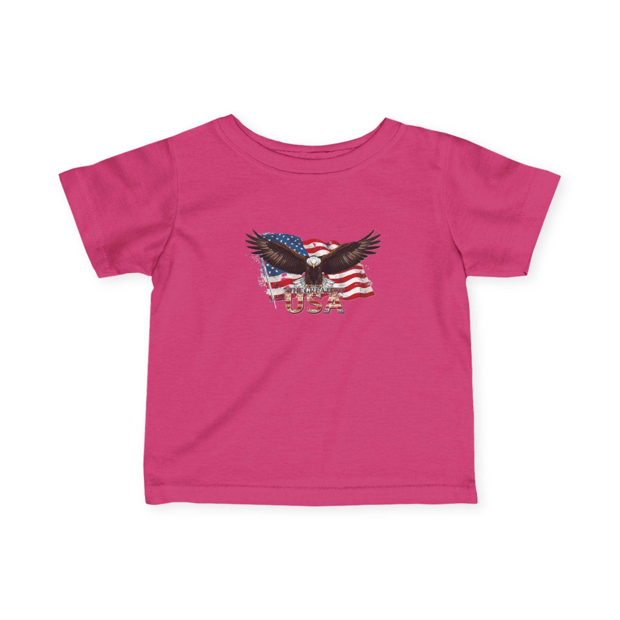 Introduce your little ones to a world of comfort and style with this adorable Infant Fine Jersey Tee. Crafted from ultra-soft fabric, this tee is designed for all-day play and adventure. Its classic fit ensures a relaxed and comfortable feel, while the ribbed knit collar maintains its shape wash after wash. With a vibrant design featuring an eagle and the USA flag, this tee embodies a spirited vibe, perfect for celebrating freedom and patriotism. Whether it's an Independence Day barbecue, a family gathering, or just a casual day out, this shirt fits seamlessly into your child's wardrobe. Ideal for infants and toddlers, it makes a thoughtful gift for baby showers or birthdays. This tee will not only make your child feel great but also showcase their budding personality with pride!