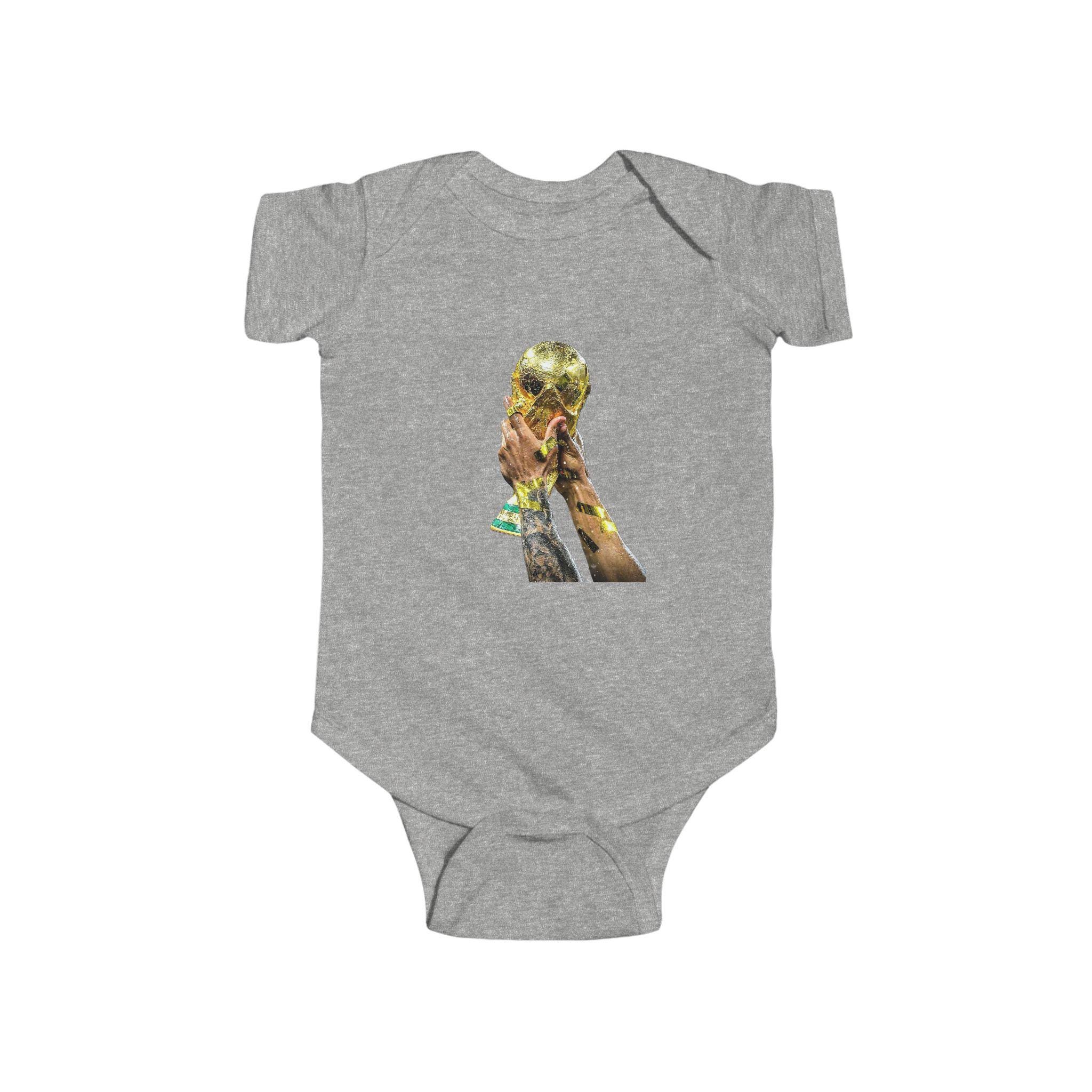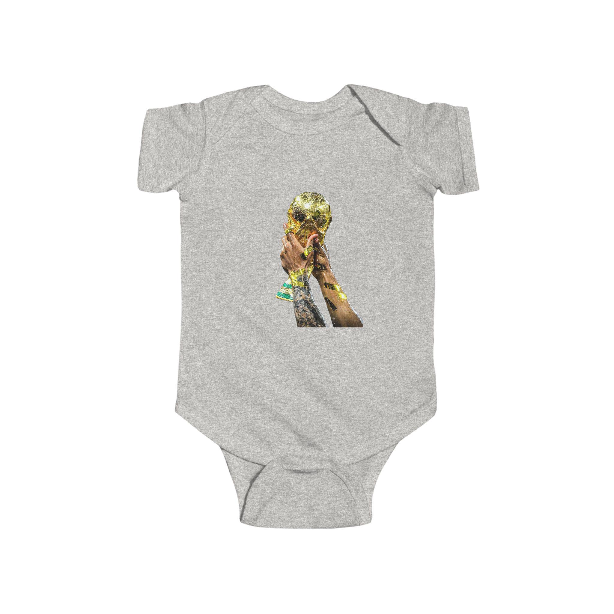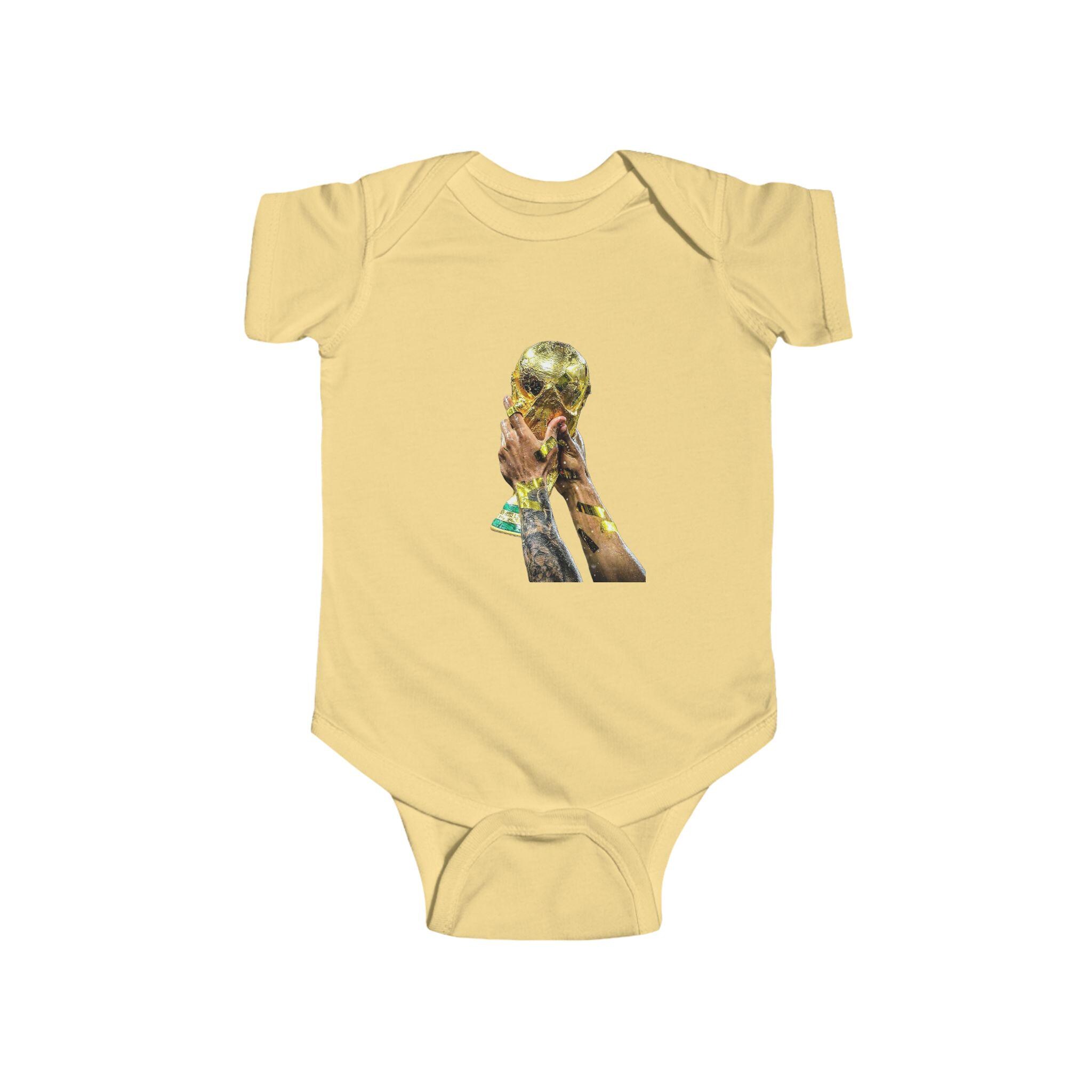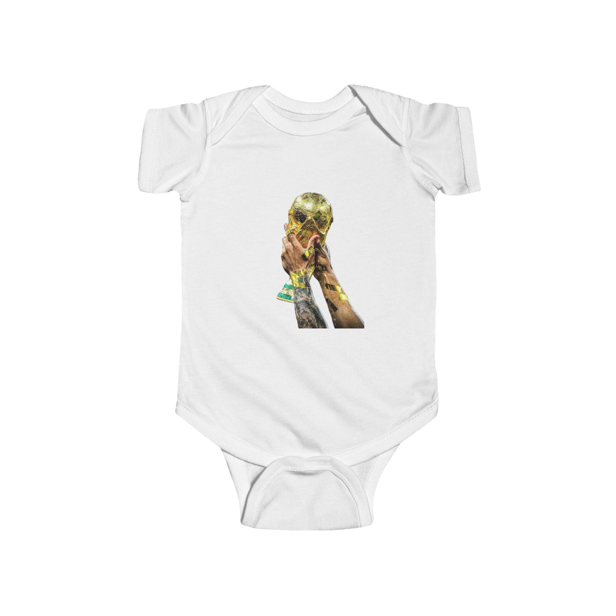 This World Cup Trophy Bodysuit is perfect for soccer fans celebrating a win or cheering on their favorite team. Made from high-quality fabric with ribbed knit binding and plastic snaps for easy dressing, this infant onesie is a must-have for young soccer enthusiasts.