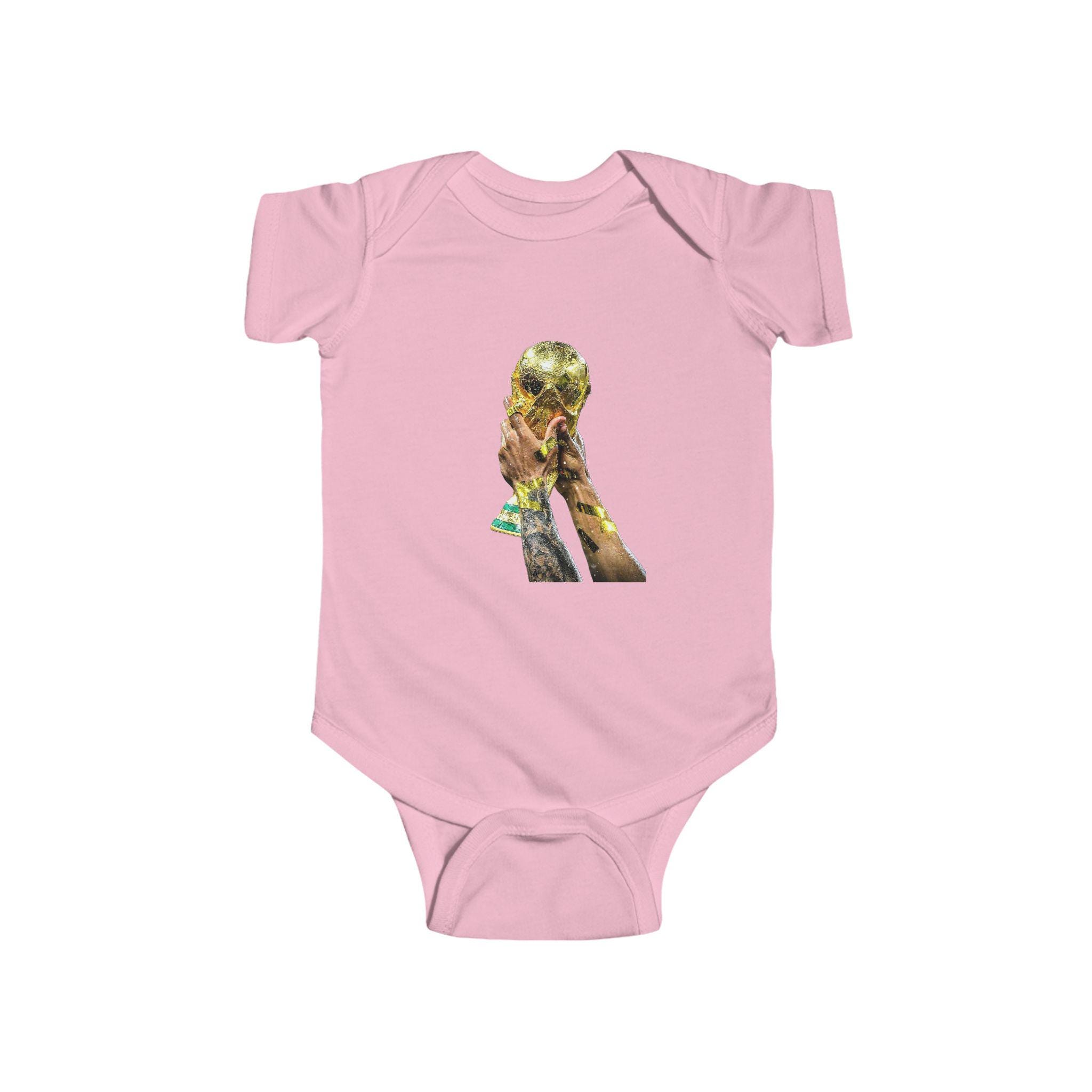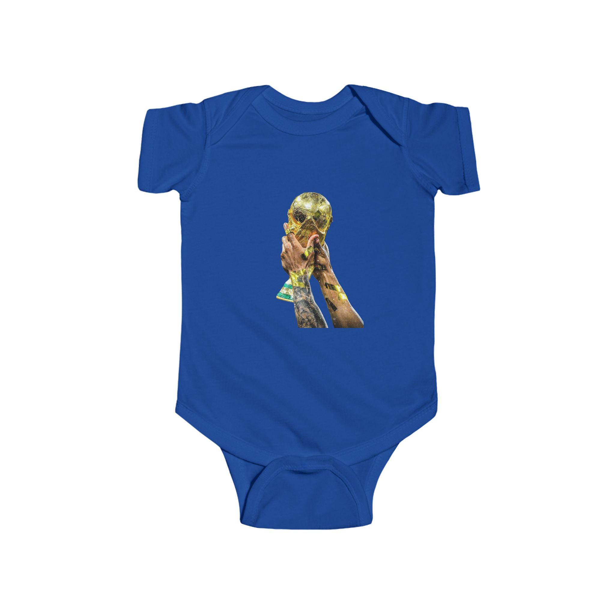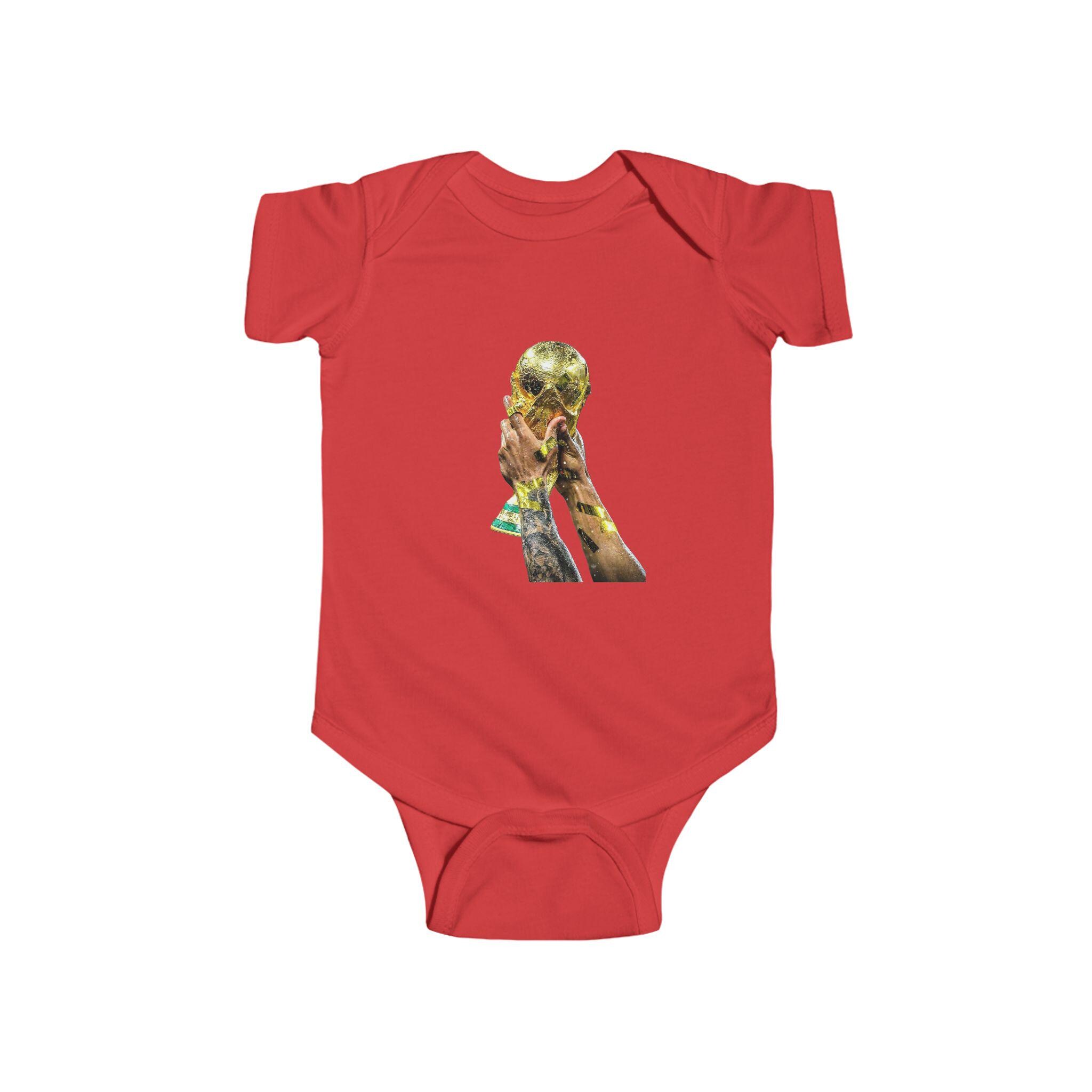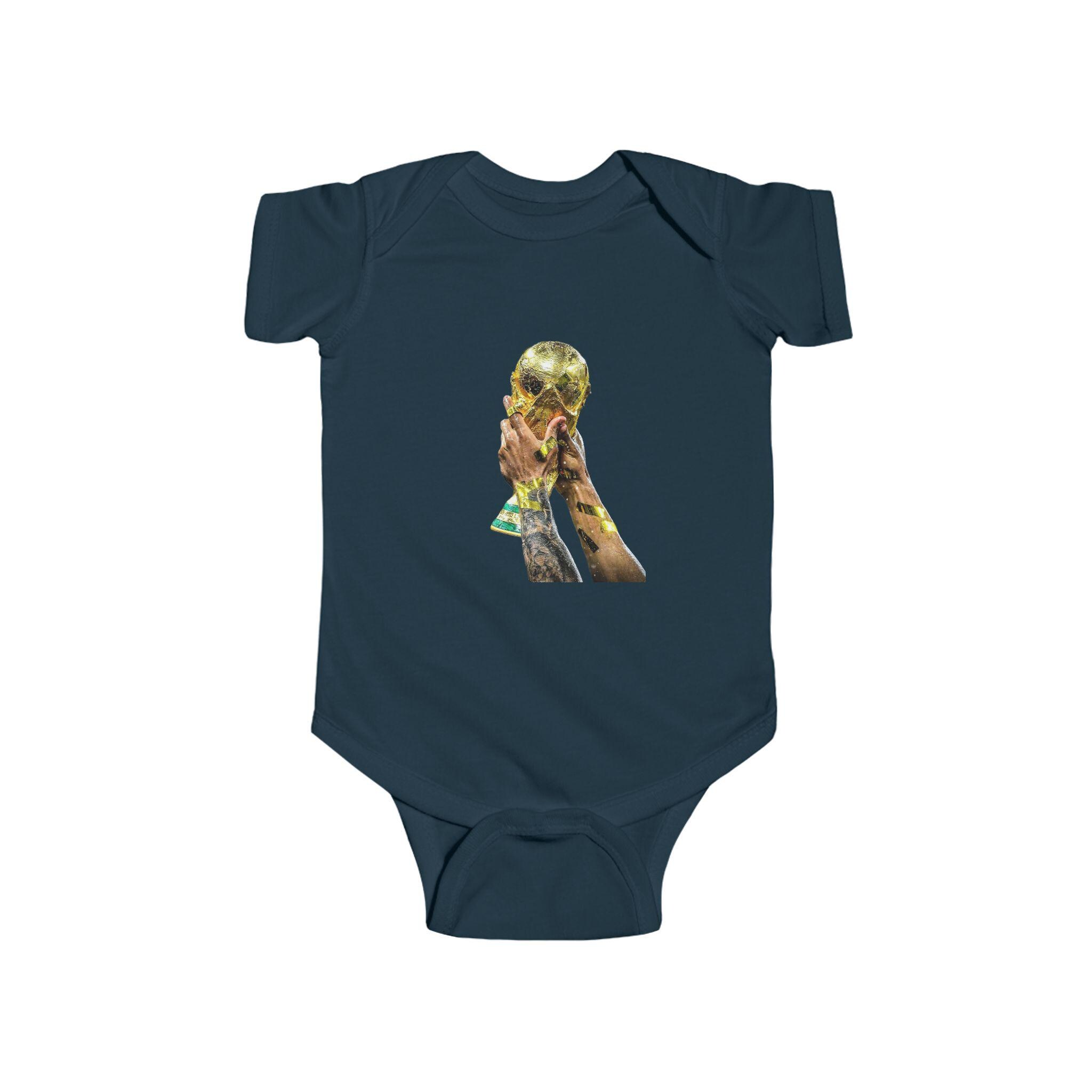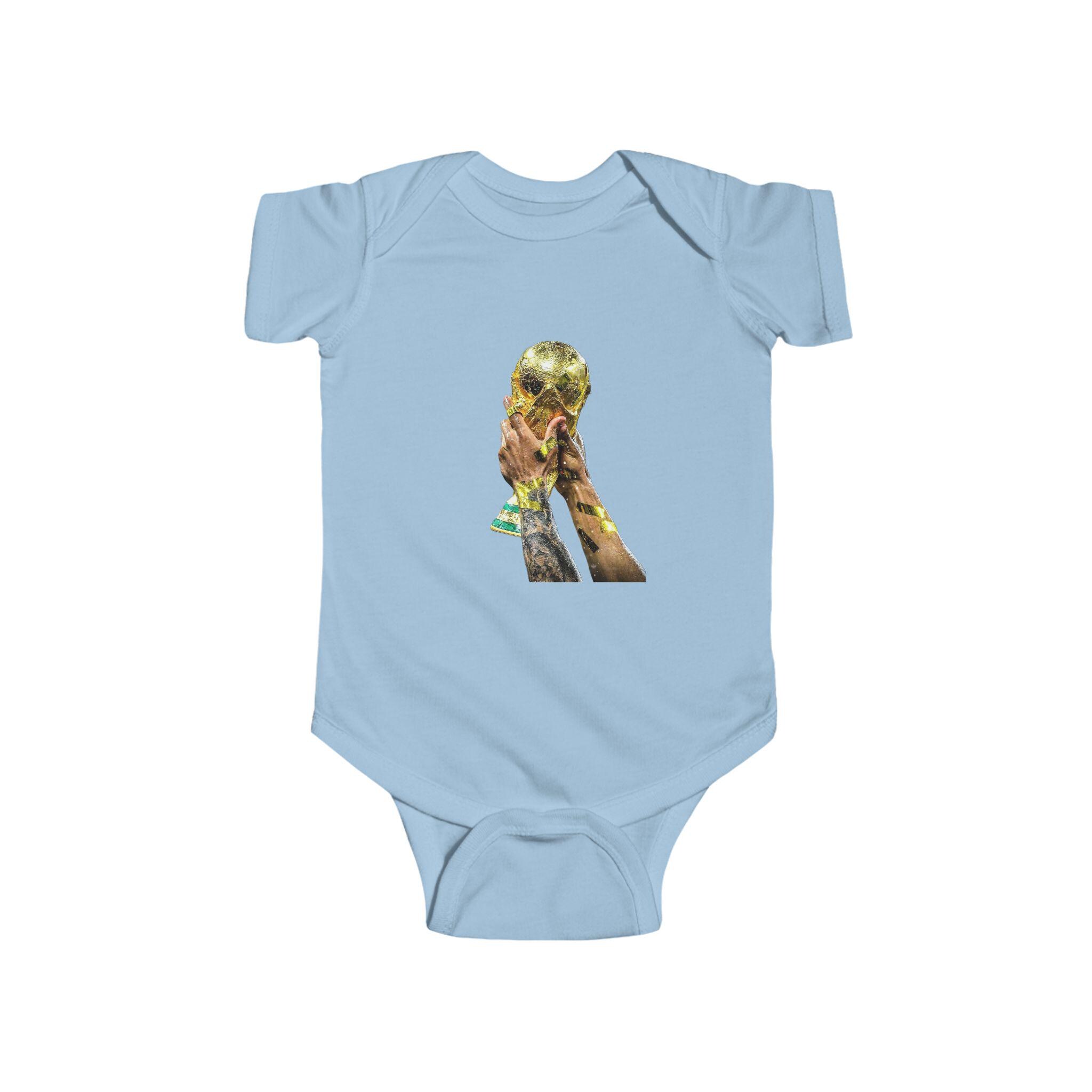 This World Cup Trophy Bodysuit is perfect for soccer fans celebrating a win or cheering on their favorite team. Made from high-quality fabric with ribbed knit binding and plastic snaps for easy dressing, this infant onesie is a must-have for young soccer enthusiasts.