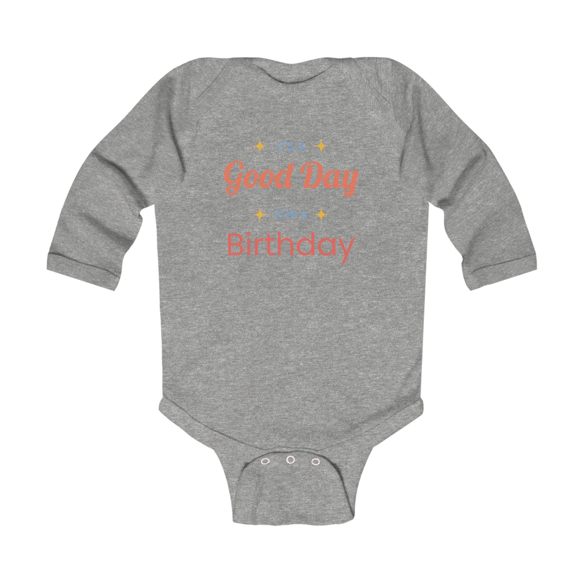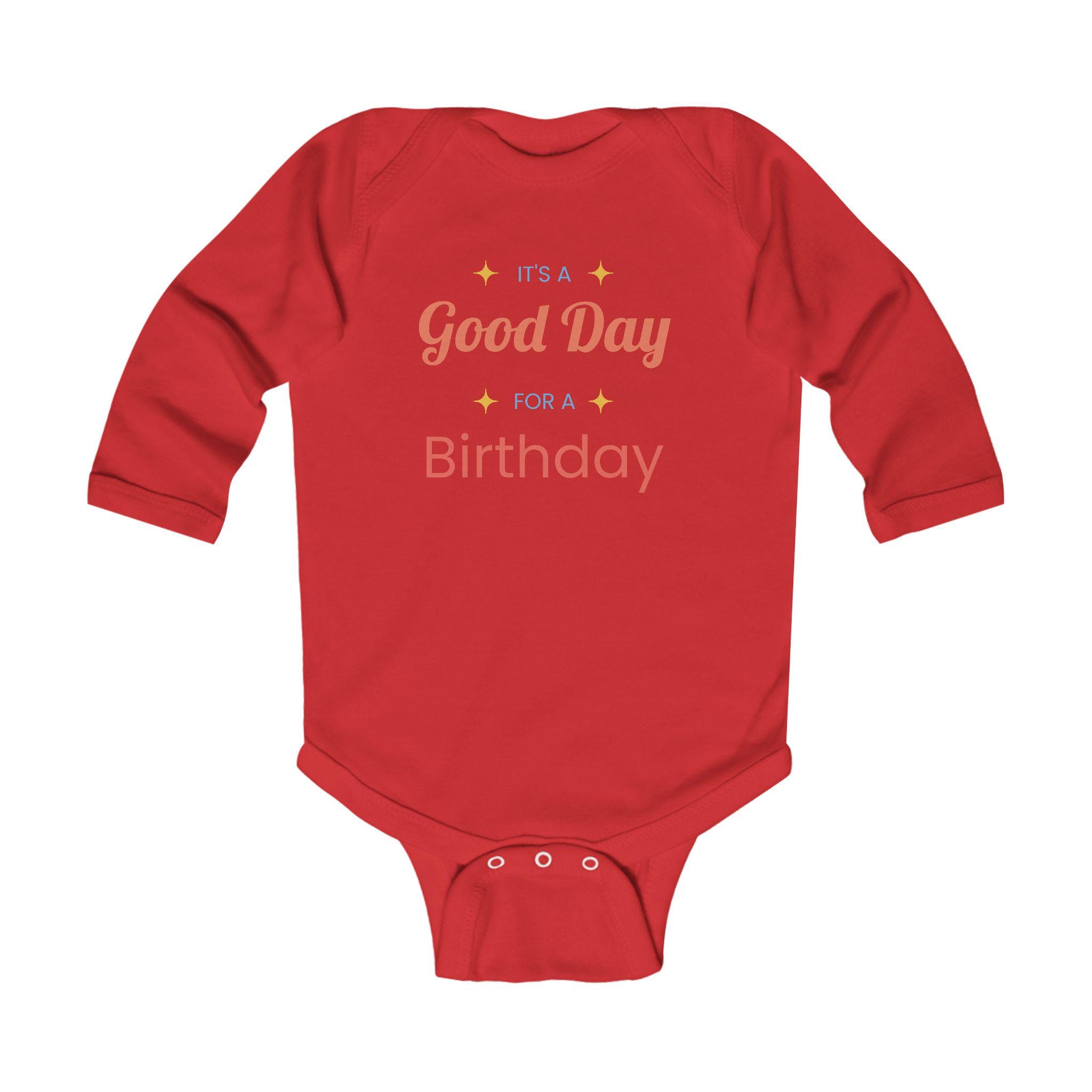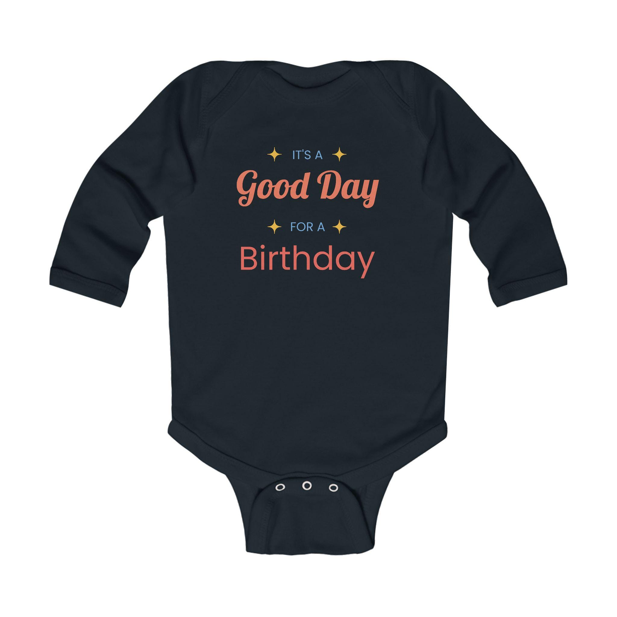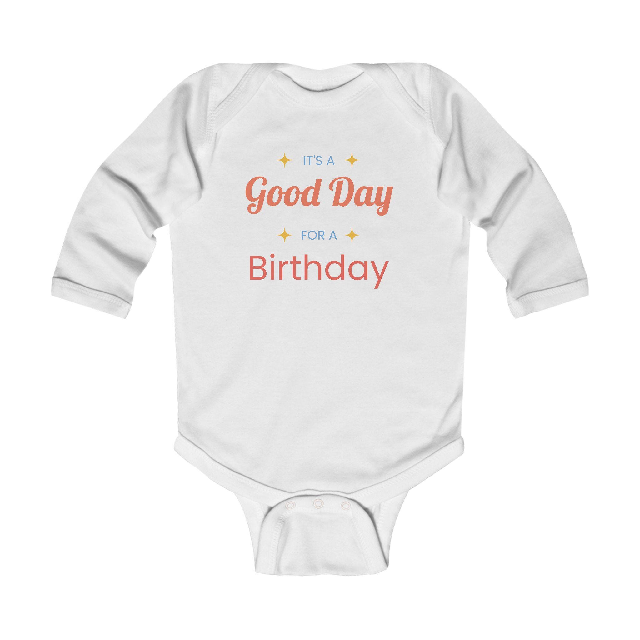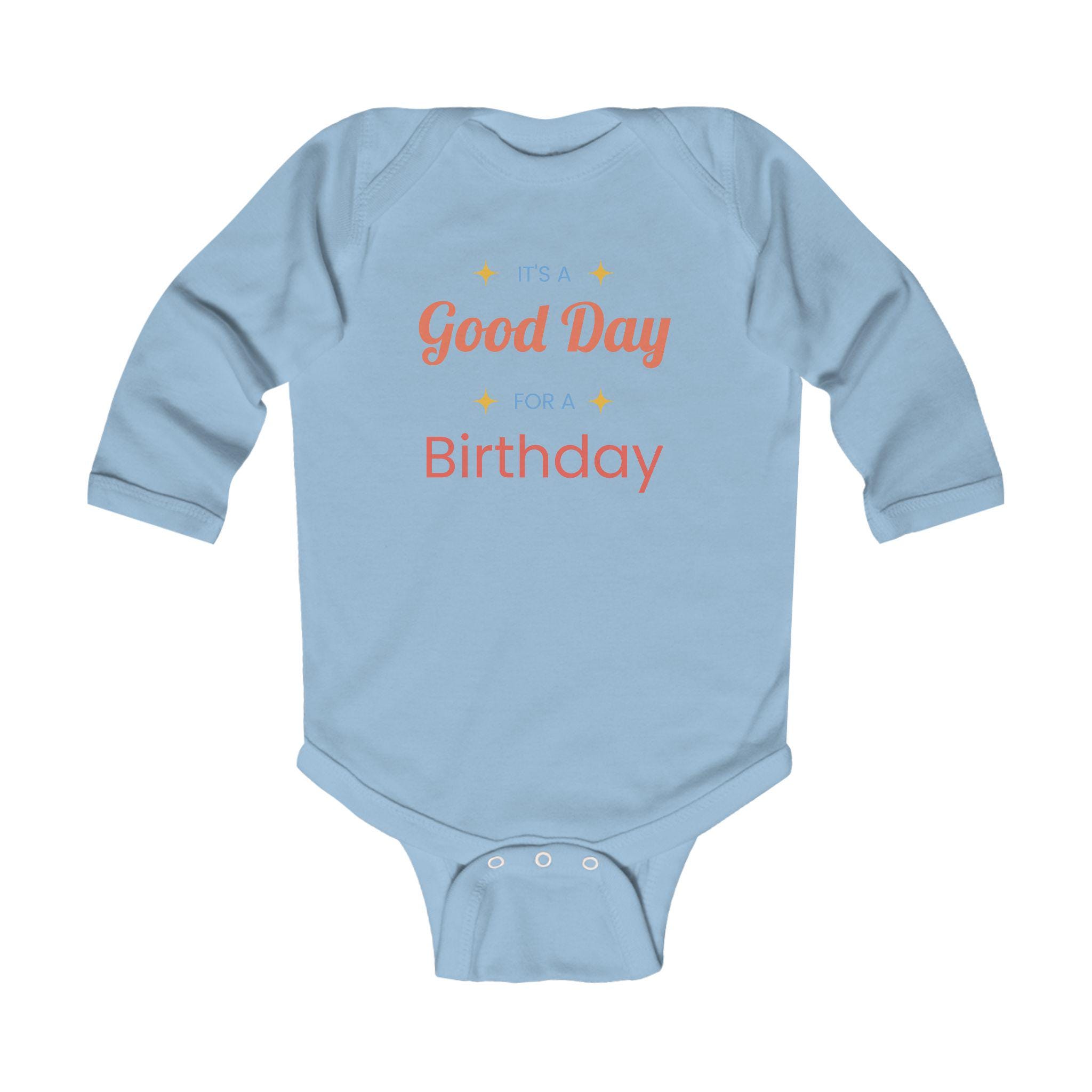 Soft, gentle, and full of birthday joy — this long-sleeve infant bodysuit wraps little ones in lightweight cotton while celebrating their special day. The sweet, retro-inspired lettering reads "It's a Good Day for a Birthday" in warm tones, bringing a cheerful pop without overwhelming the outfit. Ribbed knit binding and three secure snaps make dressing and diaper changes quick and comfortable. Breathable, light fabric keeps baby cozy during parties, photo sessions, or quiet cuddles at home. Thoughtful details like a tear-away label keep irritation to a minimum, so focus stays on smiling, cake-smudged faces and memory-making moments.