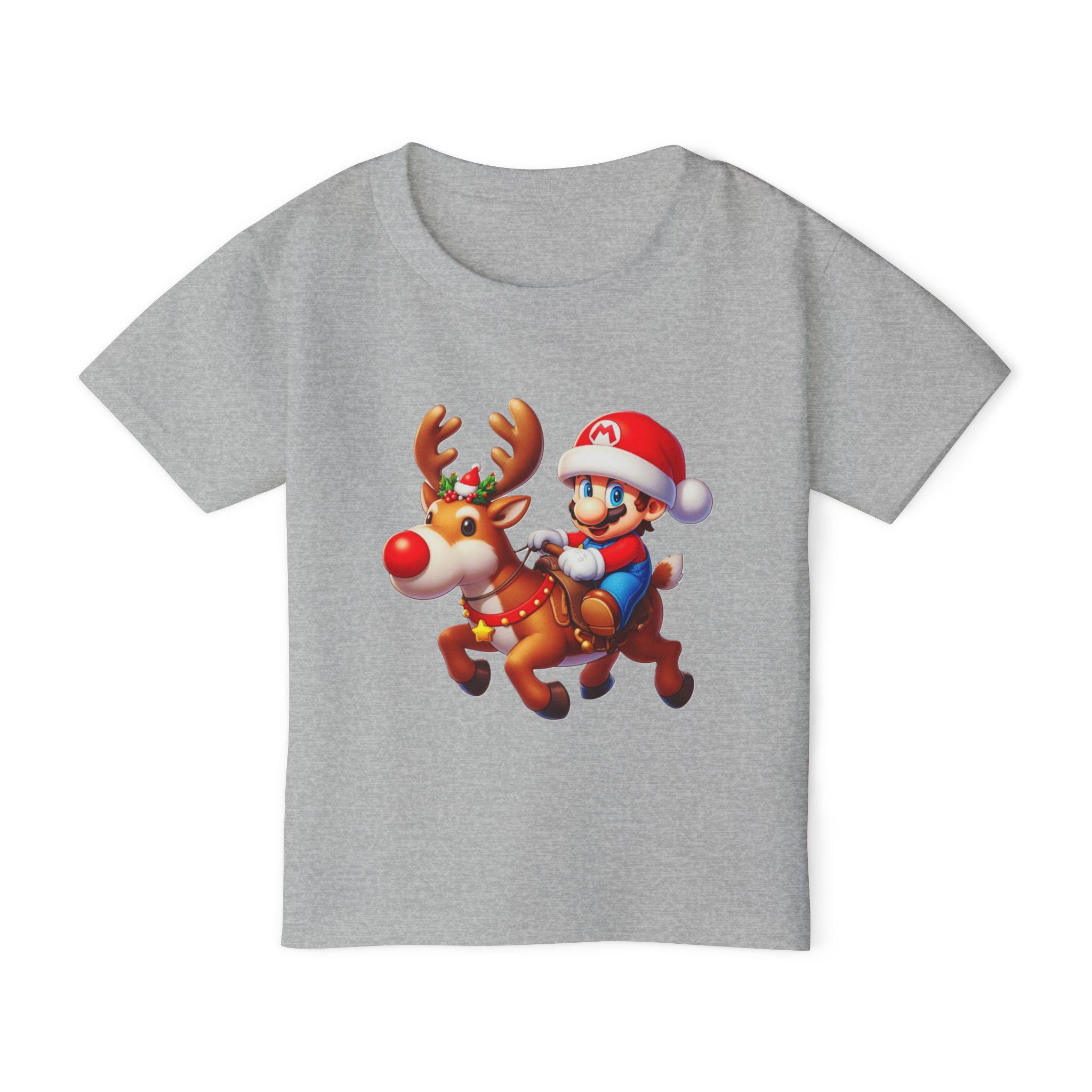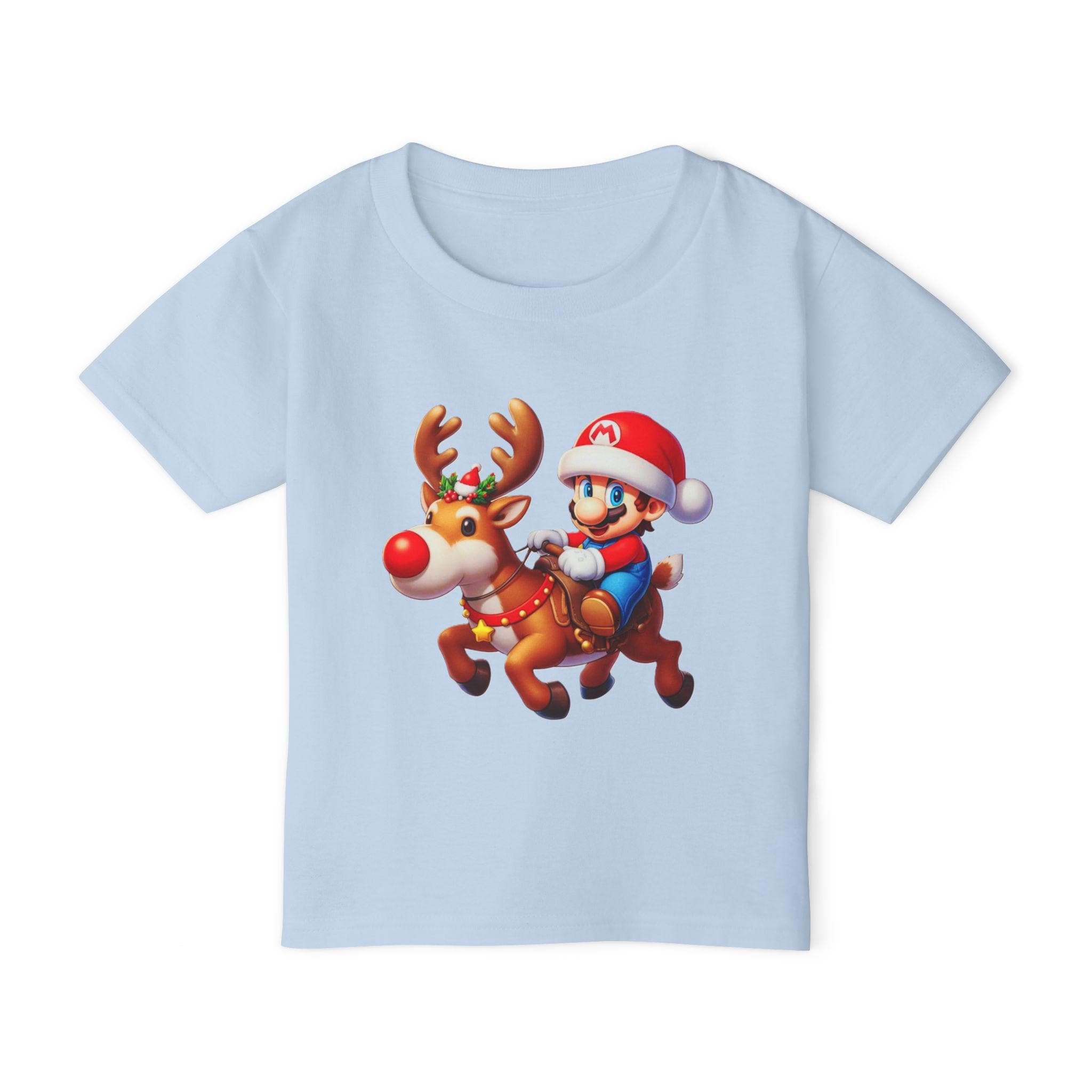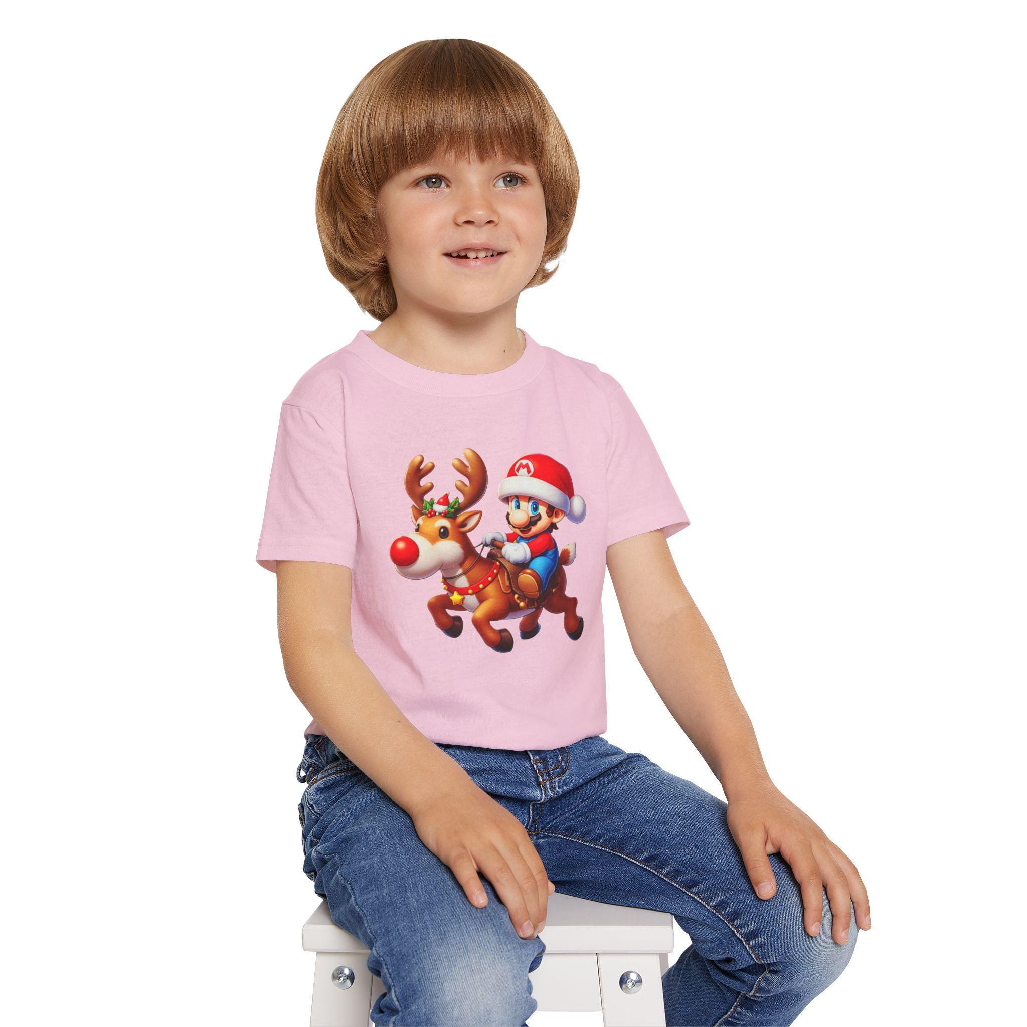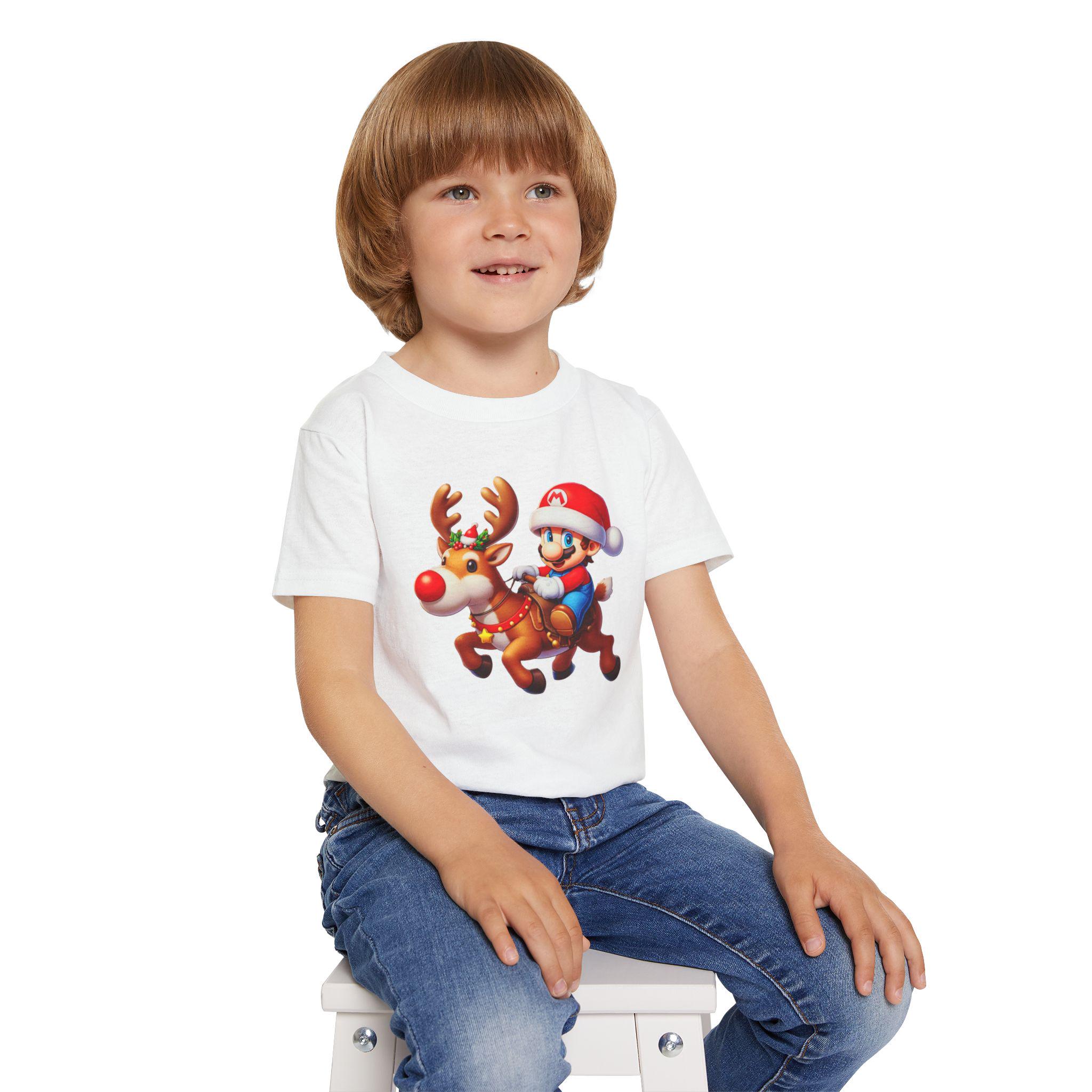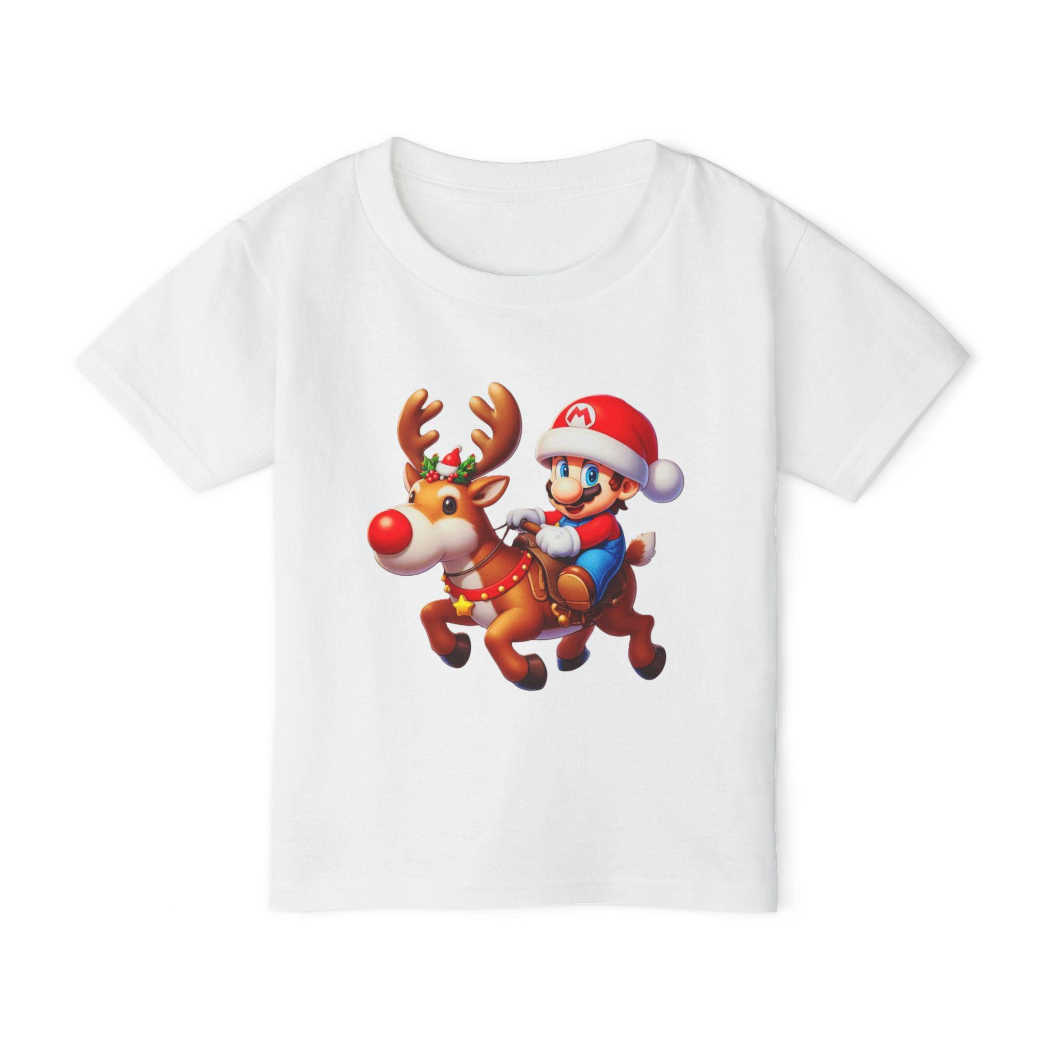 Get your little one in the festive spirit with this Santa Hat Video Game Plumber Riding Reindeer Toddler T-shirt. Perfect for Christmas celebrations, this tee will bring joy to any kid's holiday wardrobe. Ideal for young video game enthusiasts and fans of holiday fun.