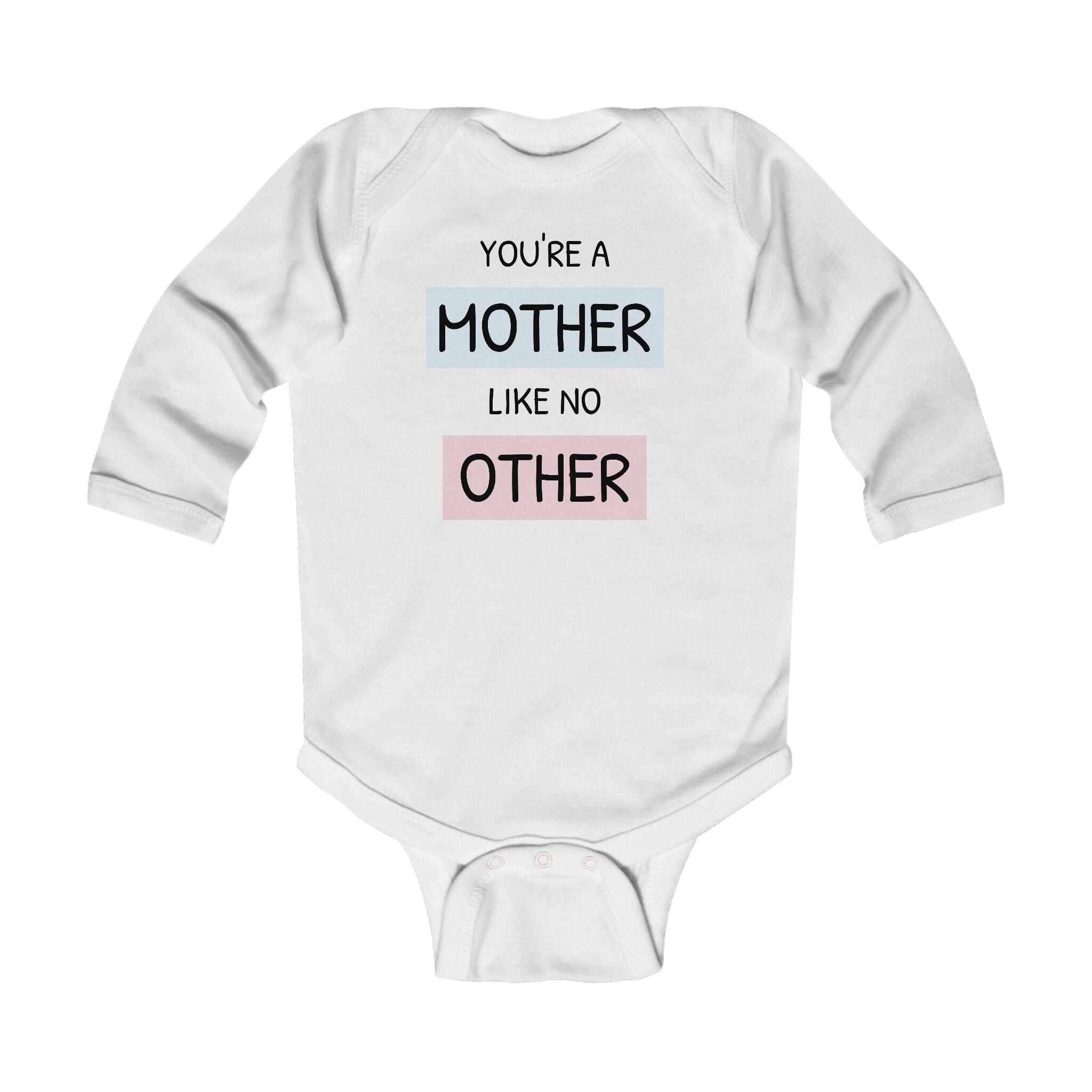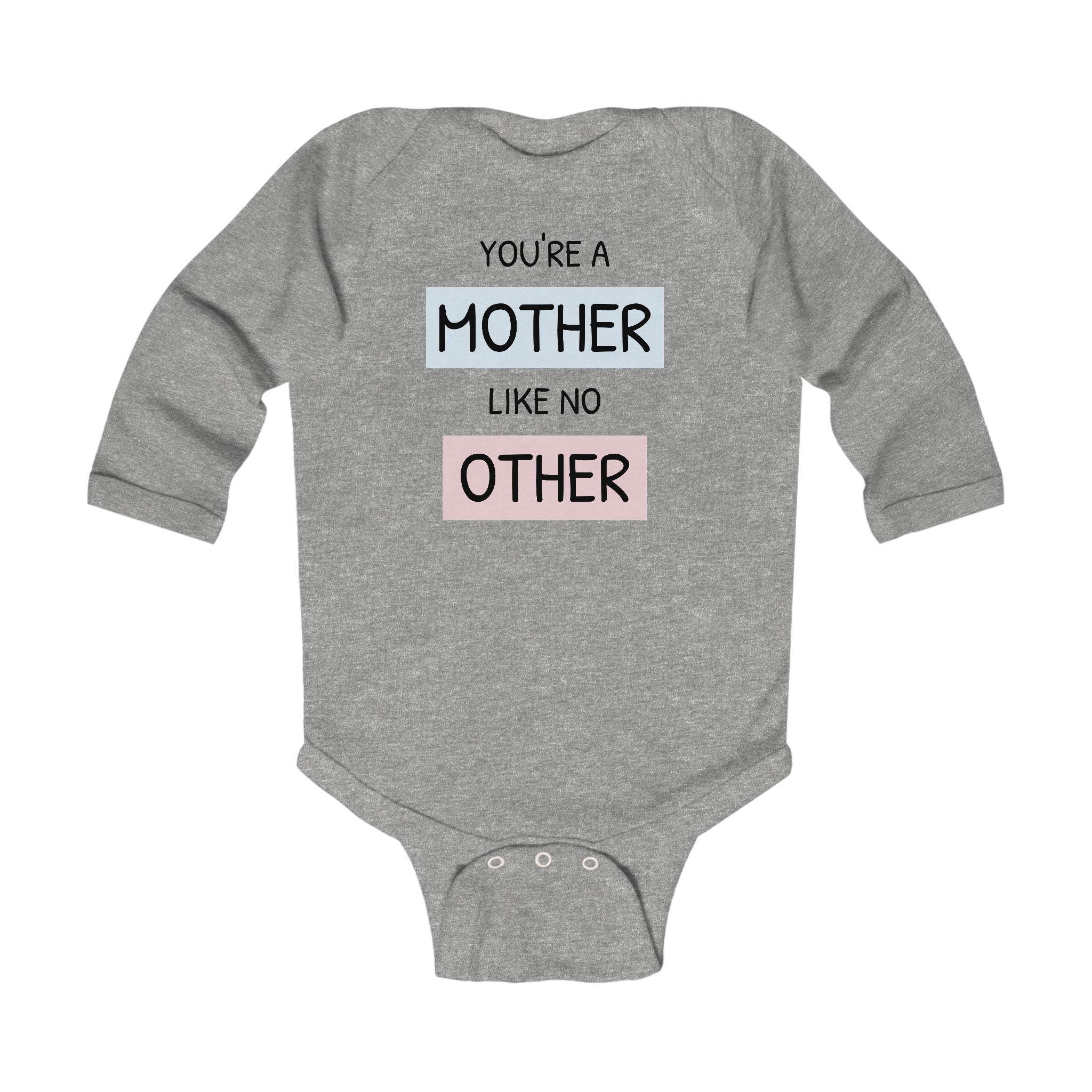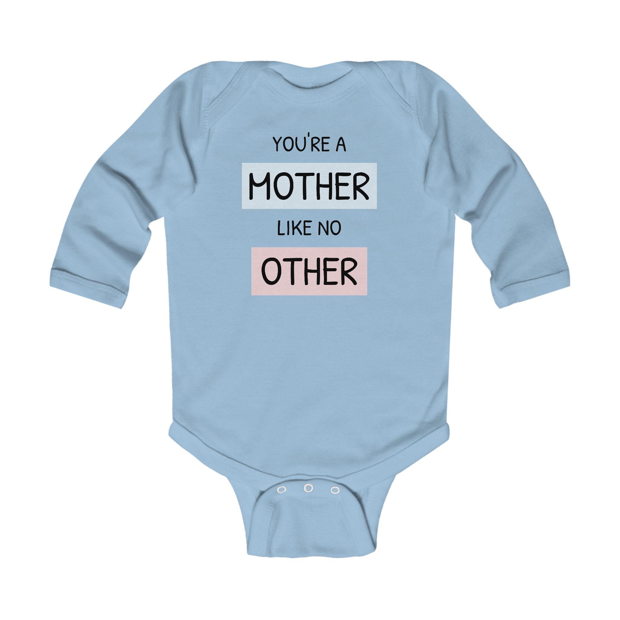 Soft, long-sleeved infant bodysuit with a gentle message that reads “You're a mother like no other.” The clean, minimalist graphic uses muted pastel blocks to keep the design sweet and subtle. Light-weight cotton and a classic fit let little ones move easily while the ribbed knit binding at the neck and cuffs prevents irritation. Practical three-snap closure at the crotch and a tear-away label make dressing and changing fuss-free. This onesie settles into quiet, everyday moments — morning cuddles, naps on the couch, or sleepy stroller walks — and quietly celebrates the bond between baby and parent.