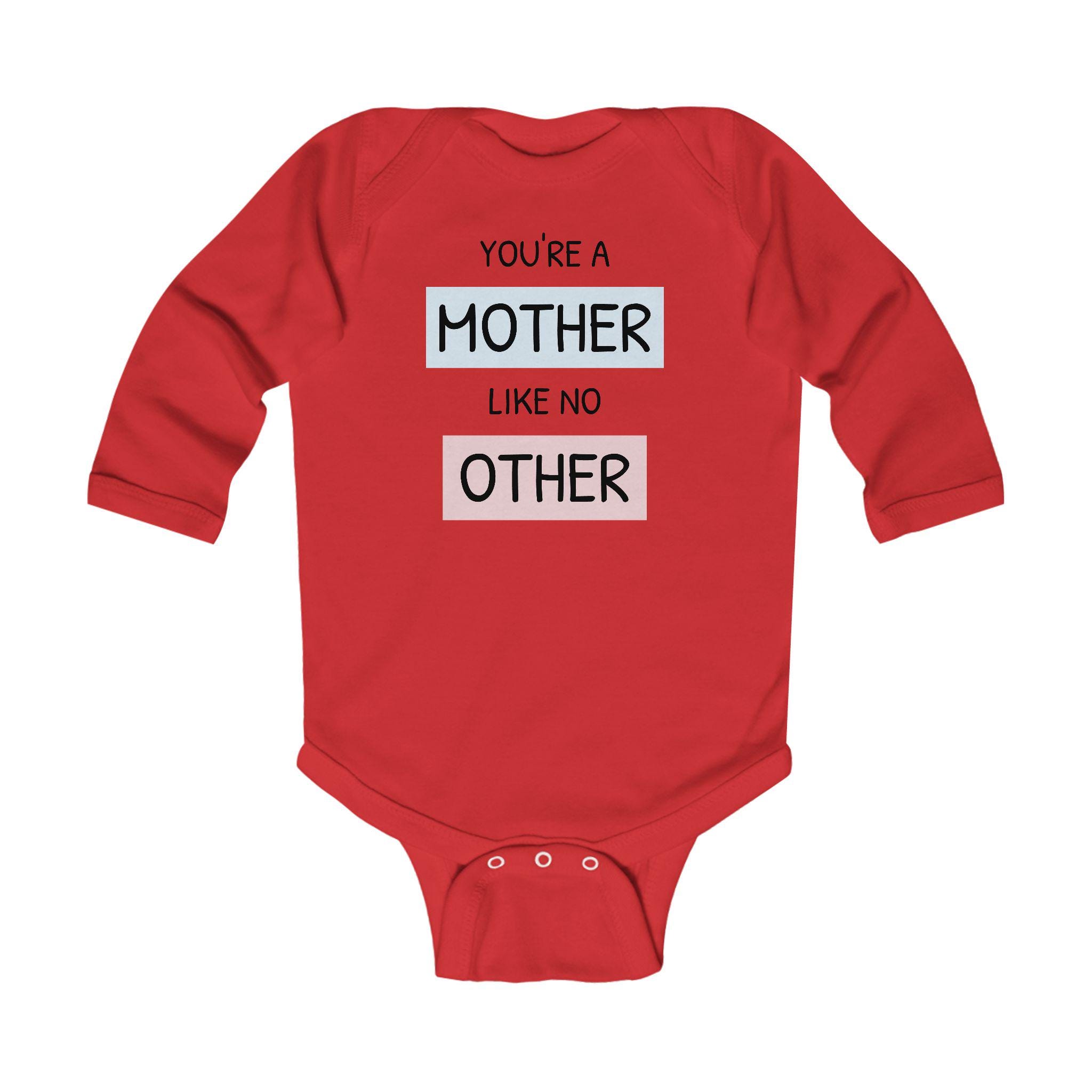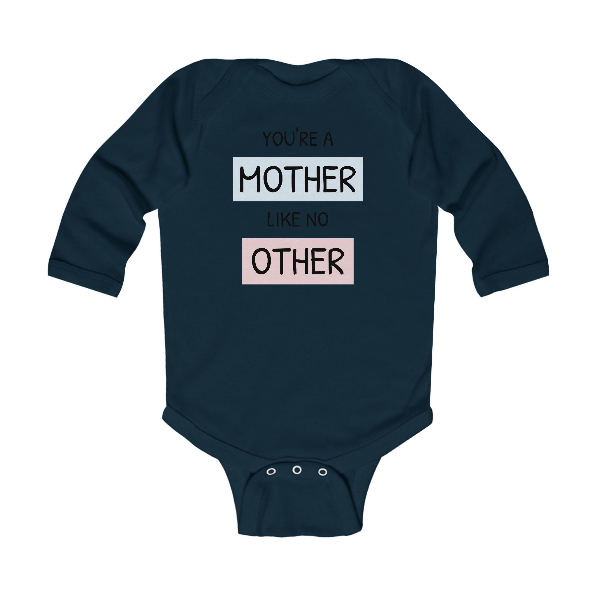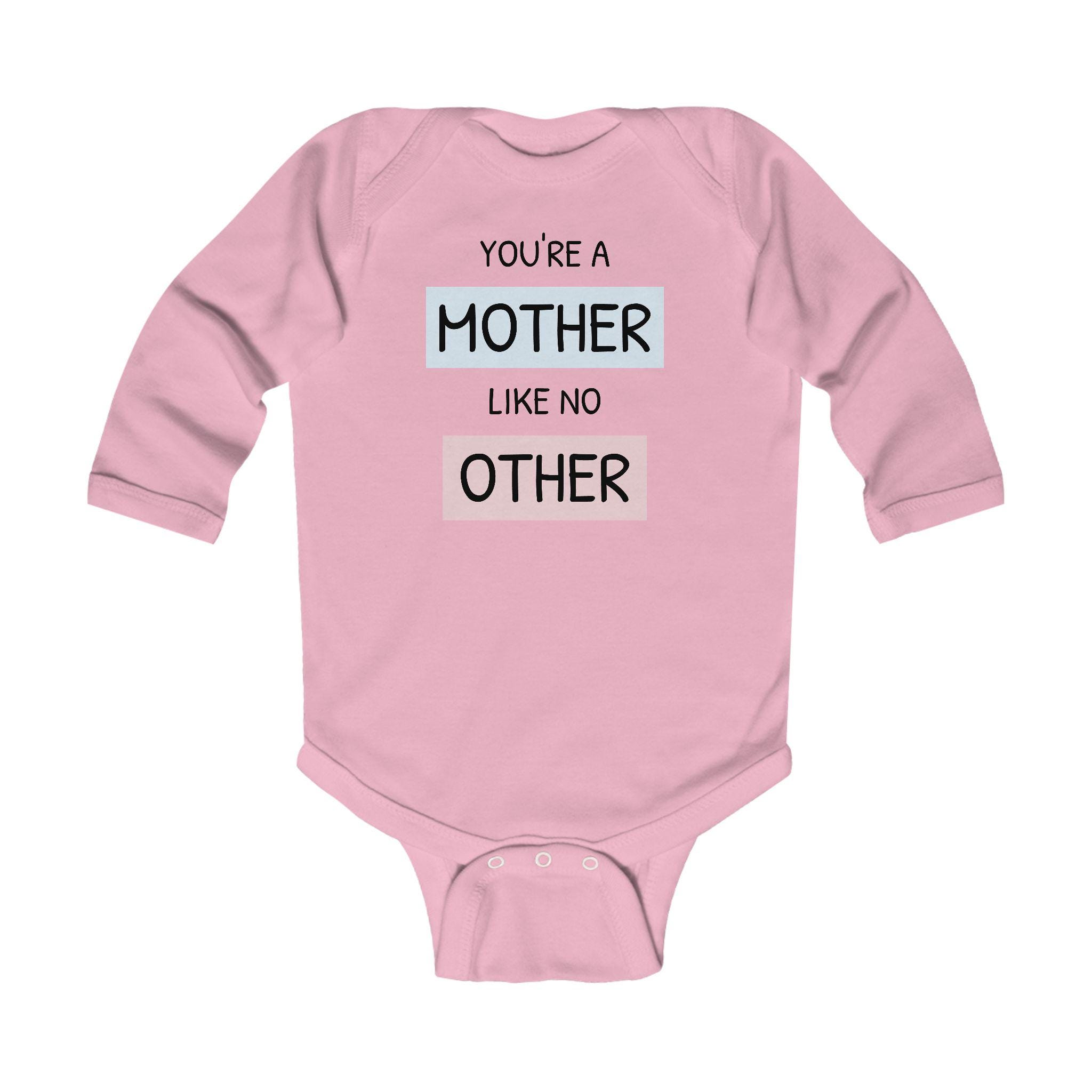 Soft, long-sleeved infant bodysuit with a gentle message that reads “You're a mother like no other.” The clean, minimalist graphic uses muted pastel blocks to keep the design sweet and subtle. Light-weight cotton and a classic fit let little ones move easily while the ribbed knit binding at the neck and cuffs prevents irritation. Practical three-snap closure at the crotch and a tear-away label make dressing and changing fuss-free. This onesie settles into quiet, everyday moments — morning cuddles, naps on the couch, or sleepy stroller walks — and quietly celebrates the bond between baby and parent.