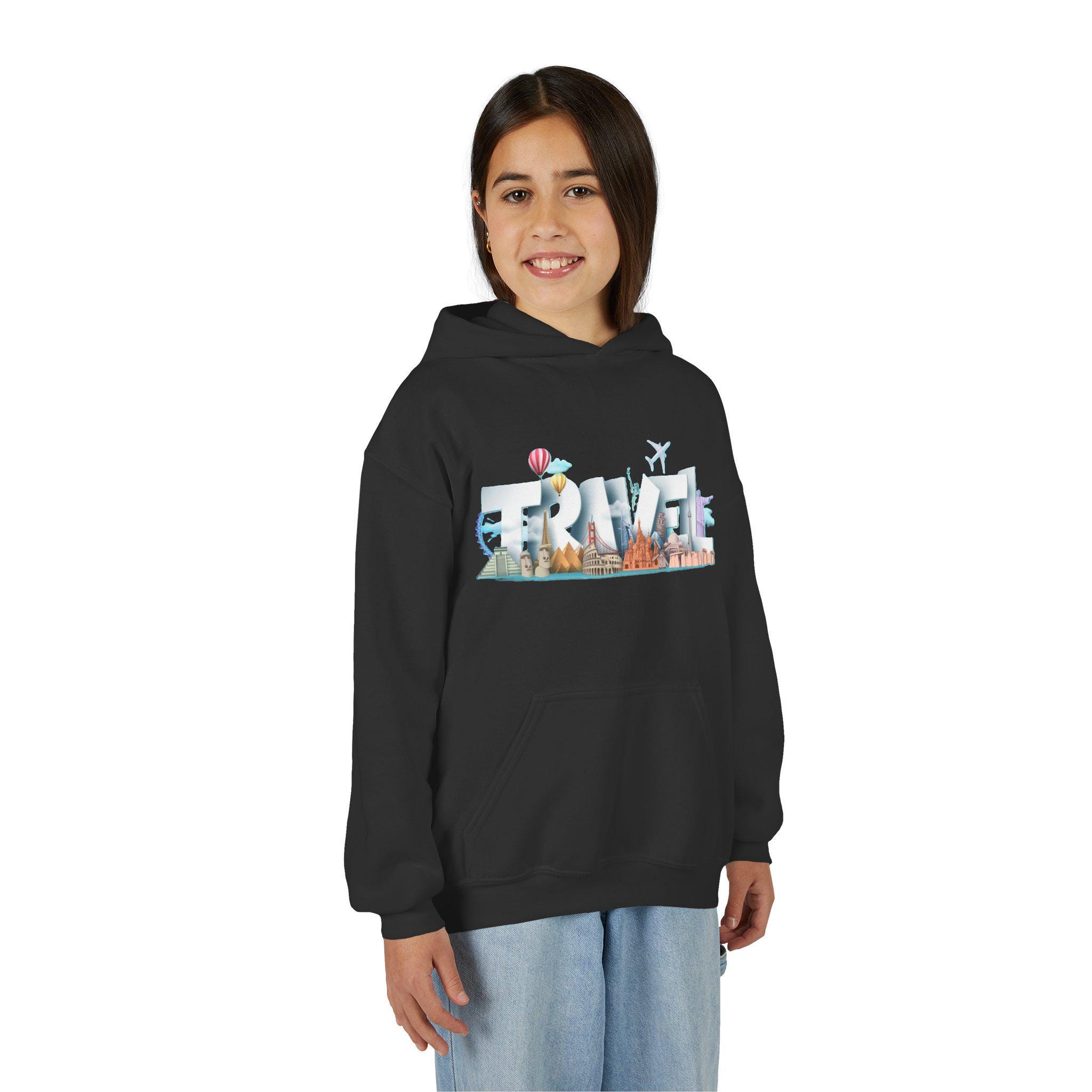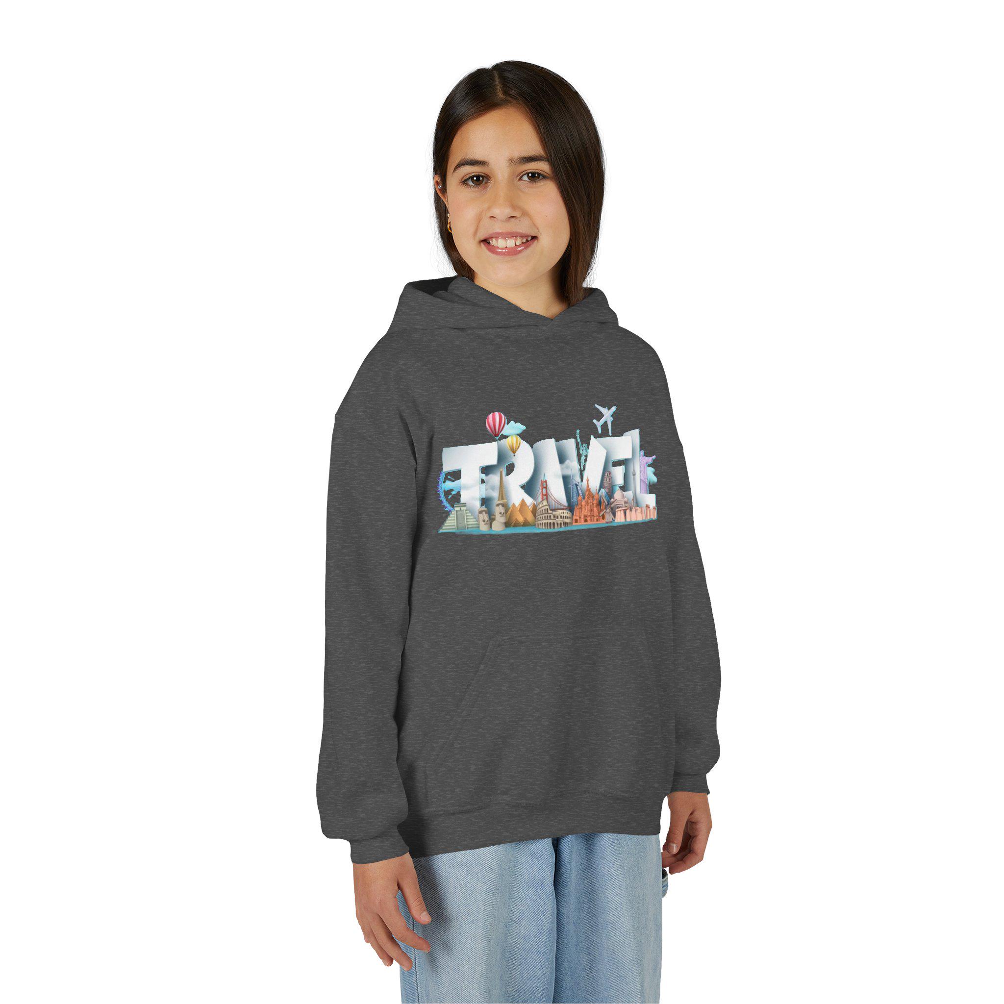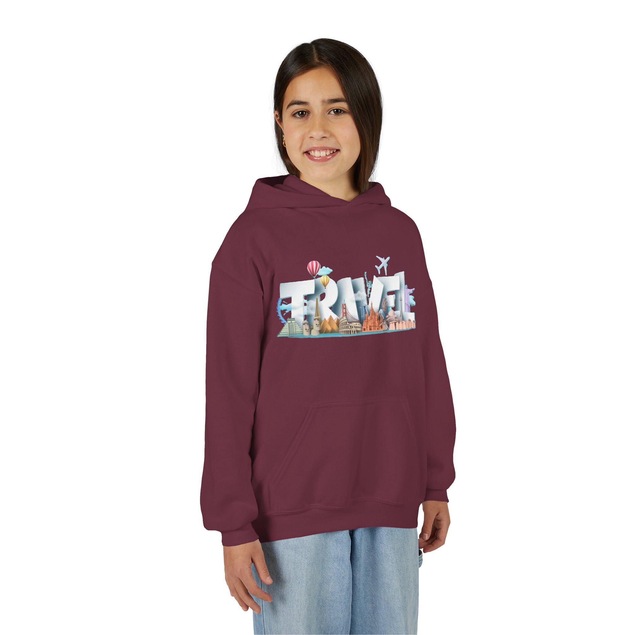 Soft, cozy, and quietly adventurous — this youth hoodie brings a little world of travel to everyday wear. A crisp white fleece canvas frames a dreamy, miniature skyline across the chest: tiny hot air balloons, distant mountains and city silhouettes that invite curiosity and daydreams. The roomy kangaroo pocket keeps small hands warm and gives kids a place to tuck snacks or treasures. Medium-weight fabric and a regular fit make it comfy for school mornings, weekend explorations, or layered evenings around a campfire. Durable stitching, stable necktape, and printed wrist details hold up to play while the option for embroidered chest accents adds a personalized touch.