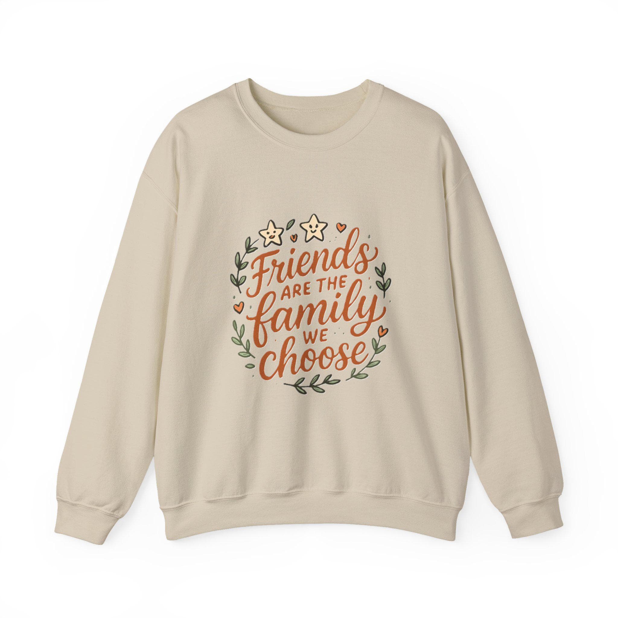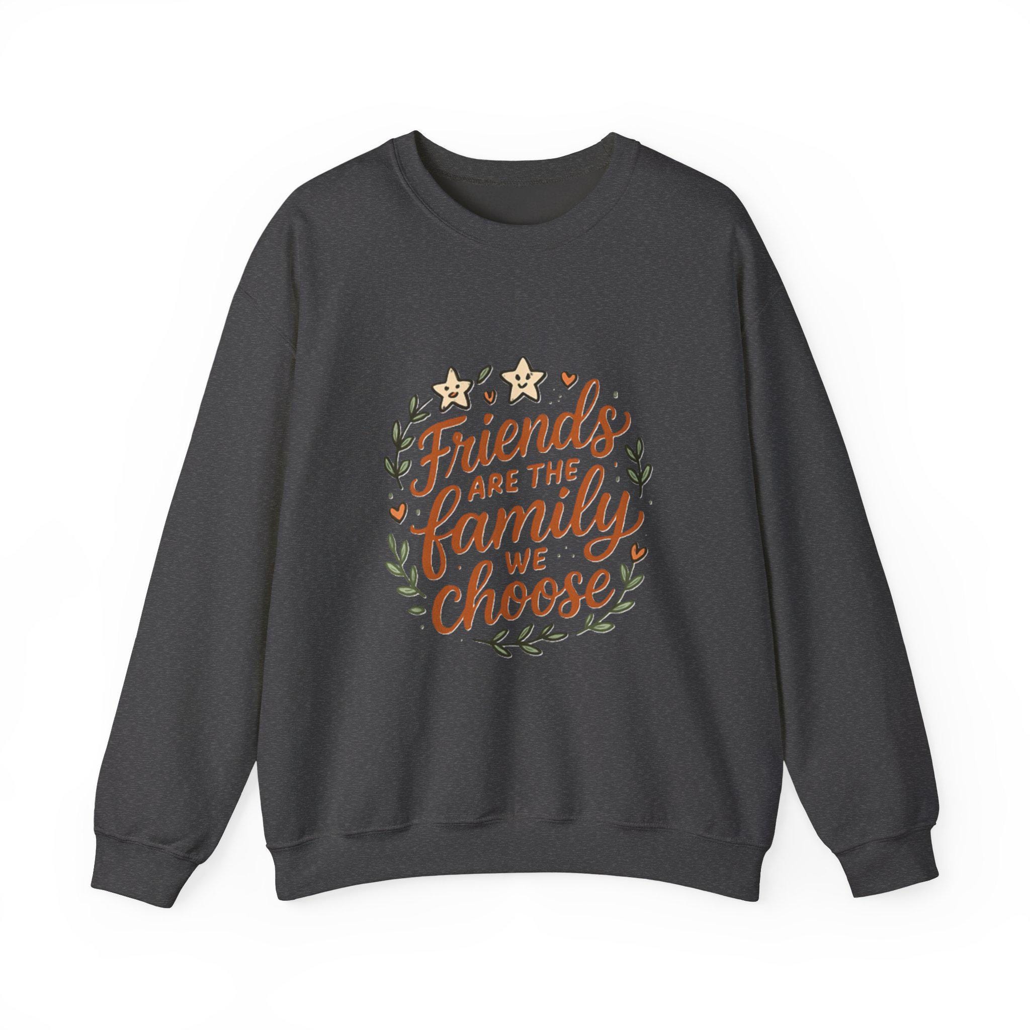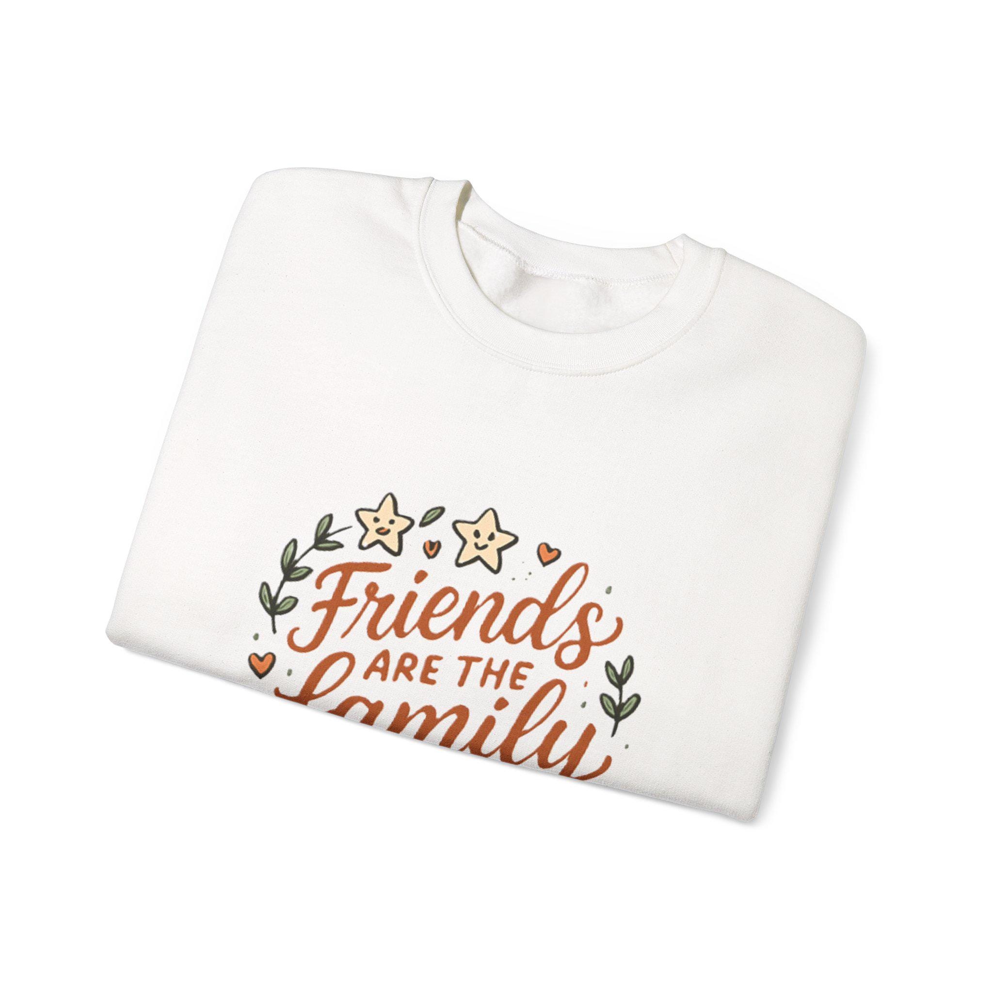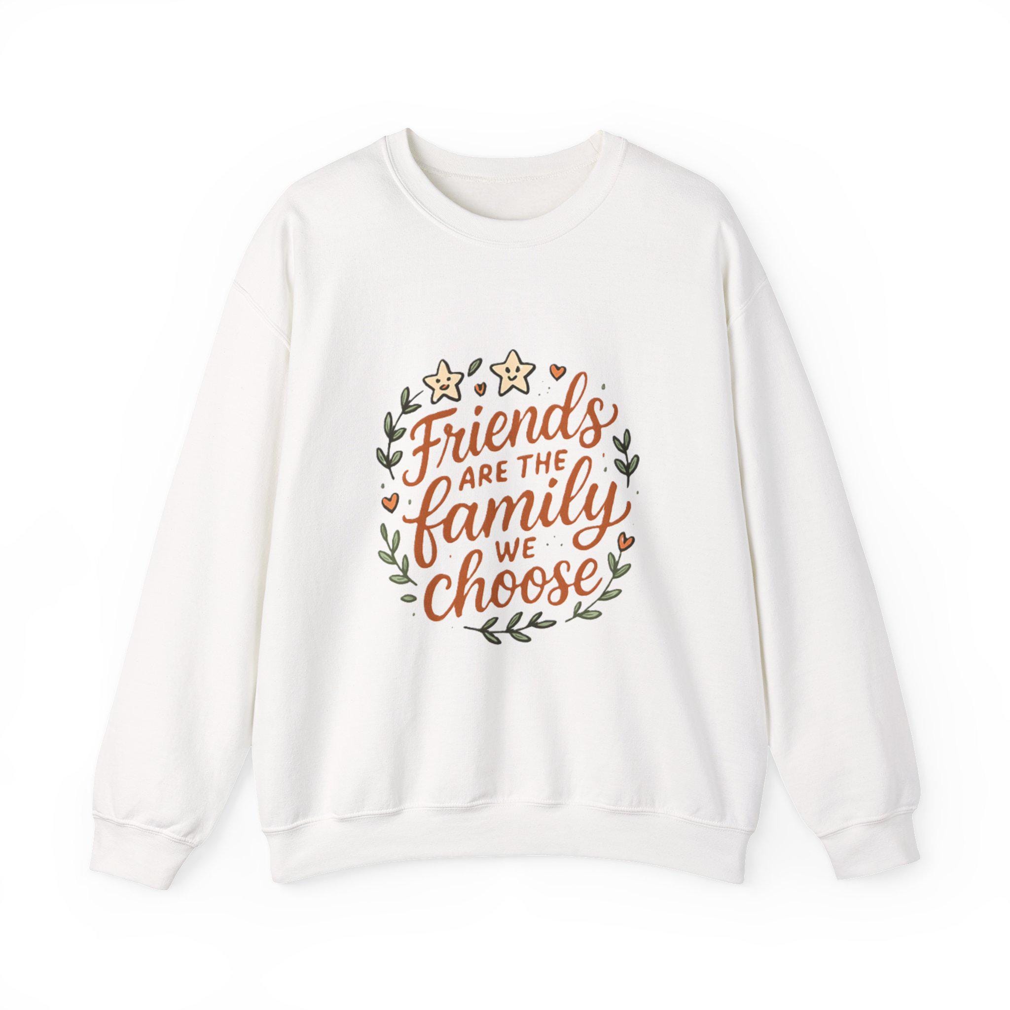 Soft, roomy, and quietly sentimental — this crewneck wraps you in comfort while carrying a warm message. The white sweatshirt features a hand-lettered floral wreath reading “Friends are the family we choose,” embroidered/printed in gentle earth tones. Wear it to cozy up on coffee porch mornings, bring it to casual friend gatherings, or pull it on after a long day when you want something that feels familiar and kind. The medium-heavy cotton-poly blend holds its shape, the ribbed collar and cuffs sit comfortably without pinch, and the clean, seam-free body keeps the silhouette smooth. It's an everyday piece that reads like a familiar note from someone who gets you.