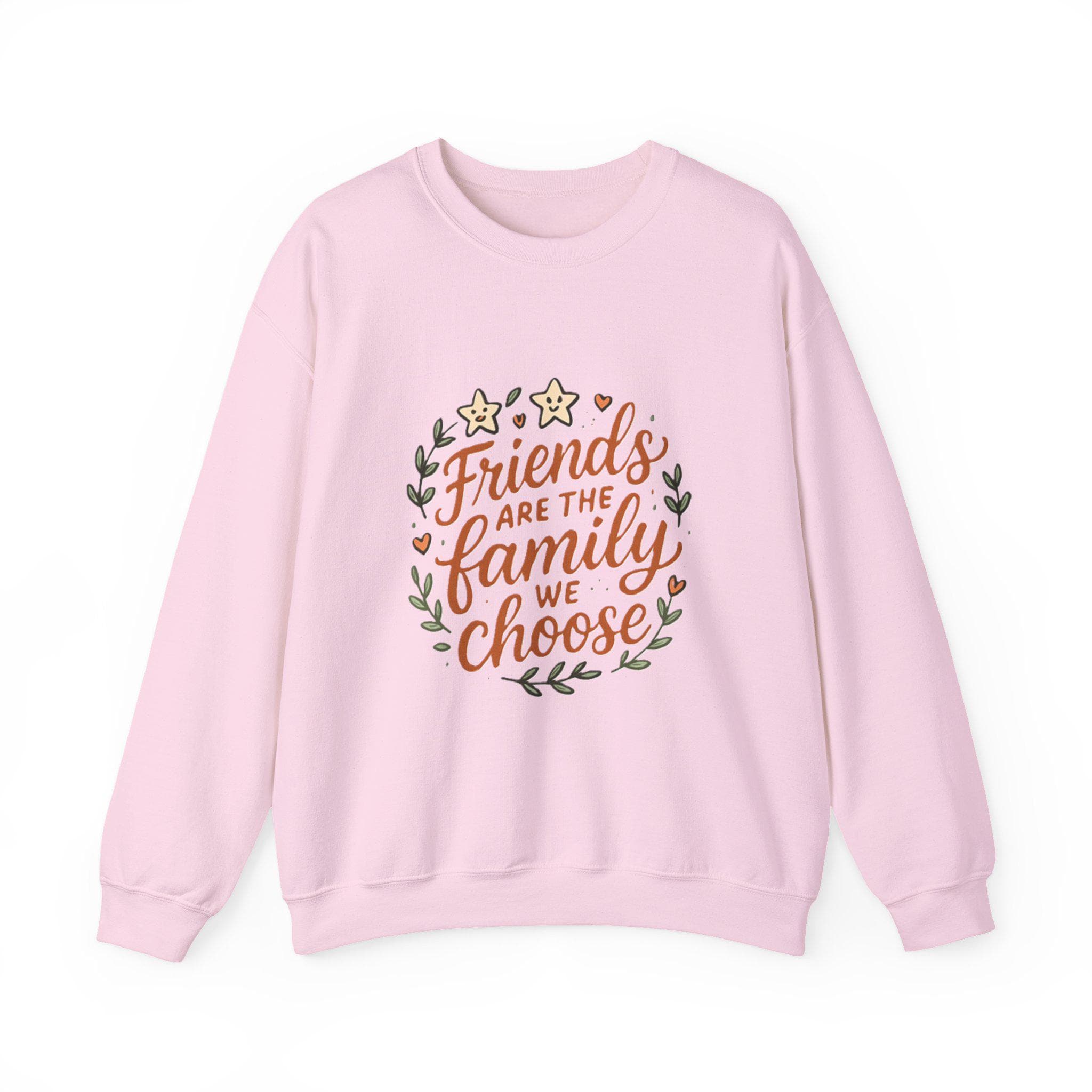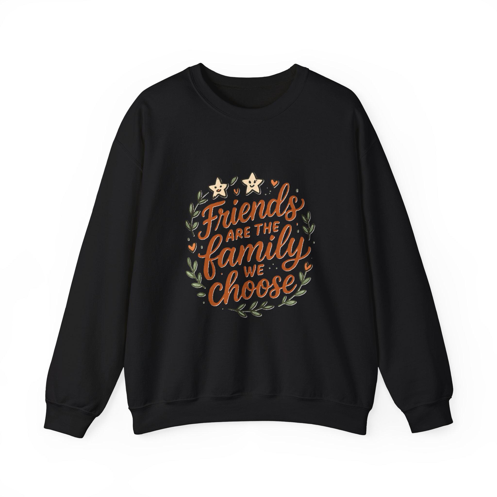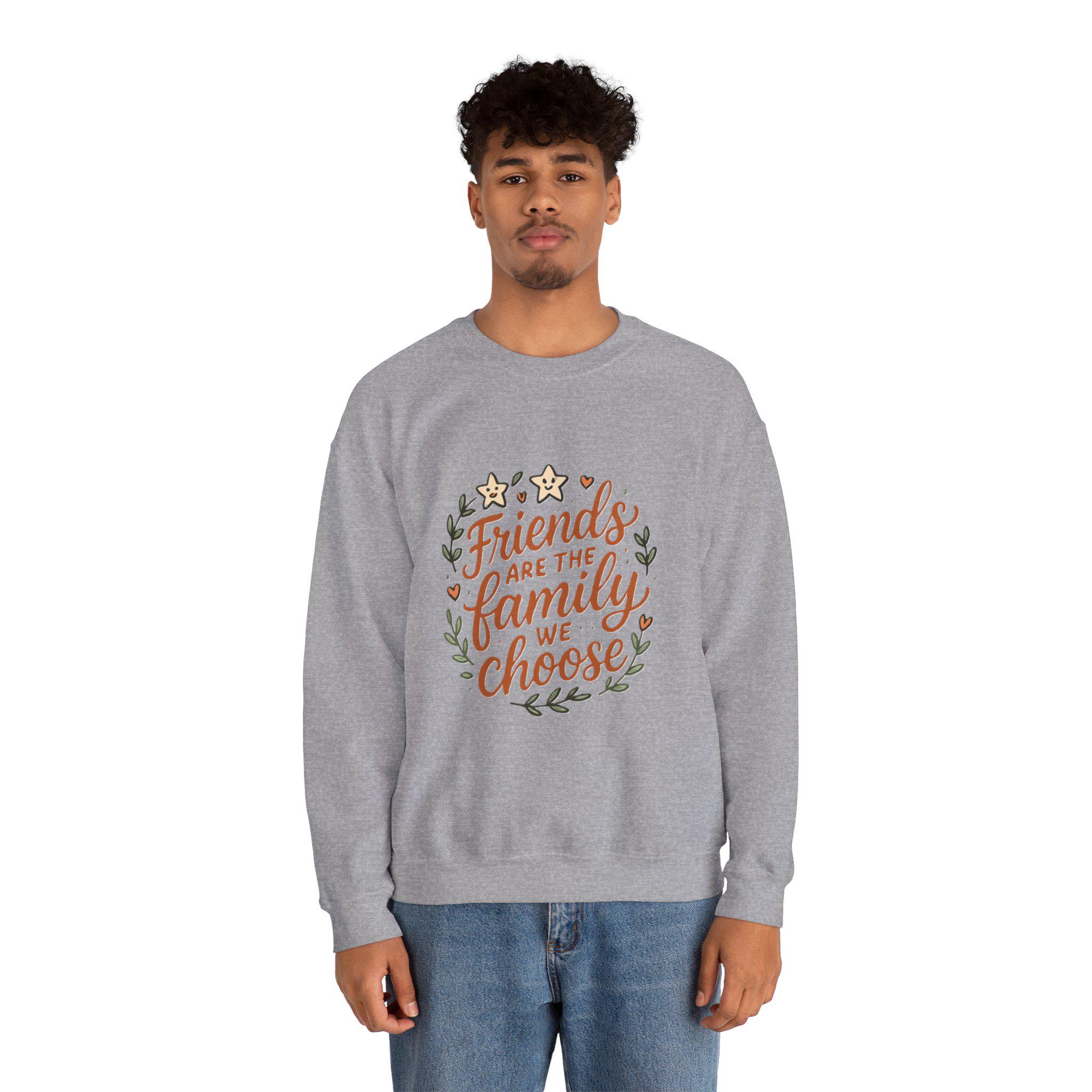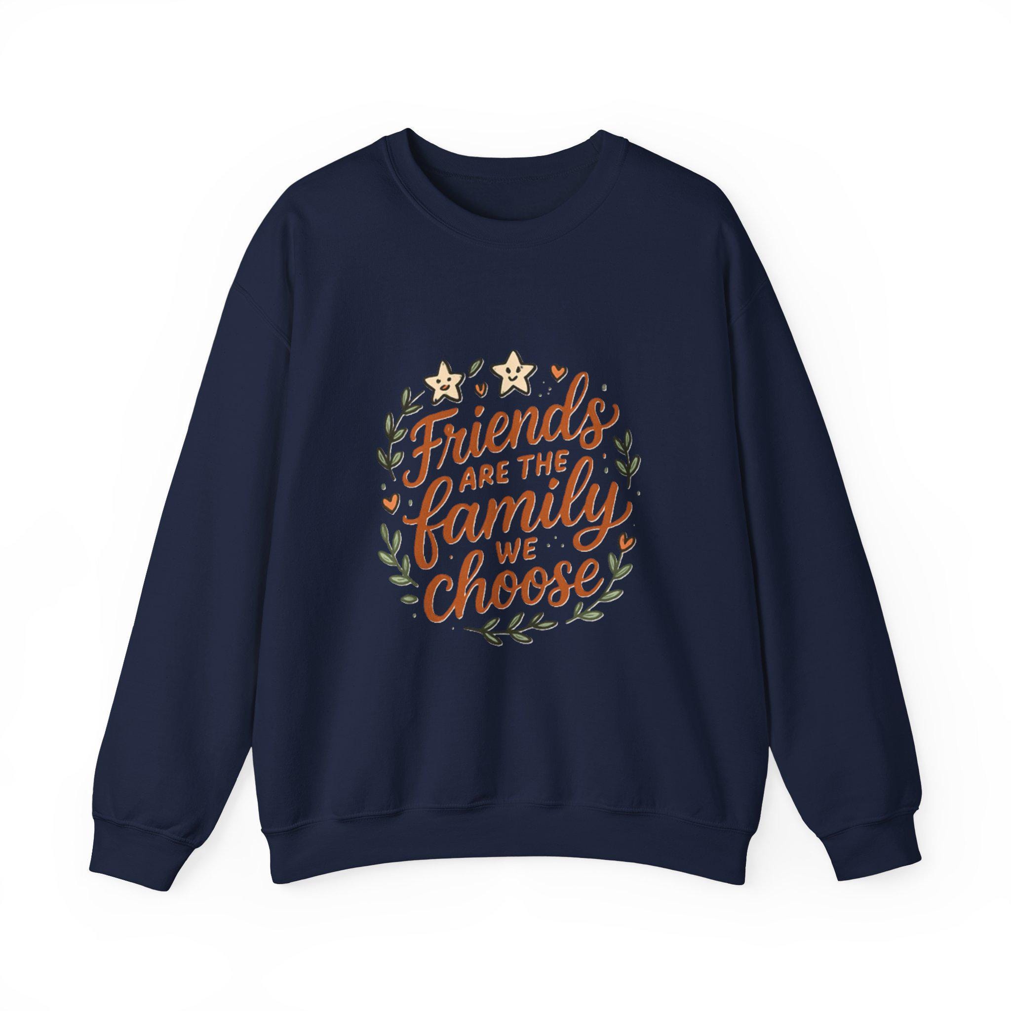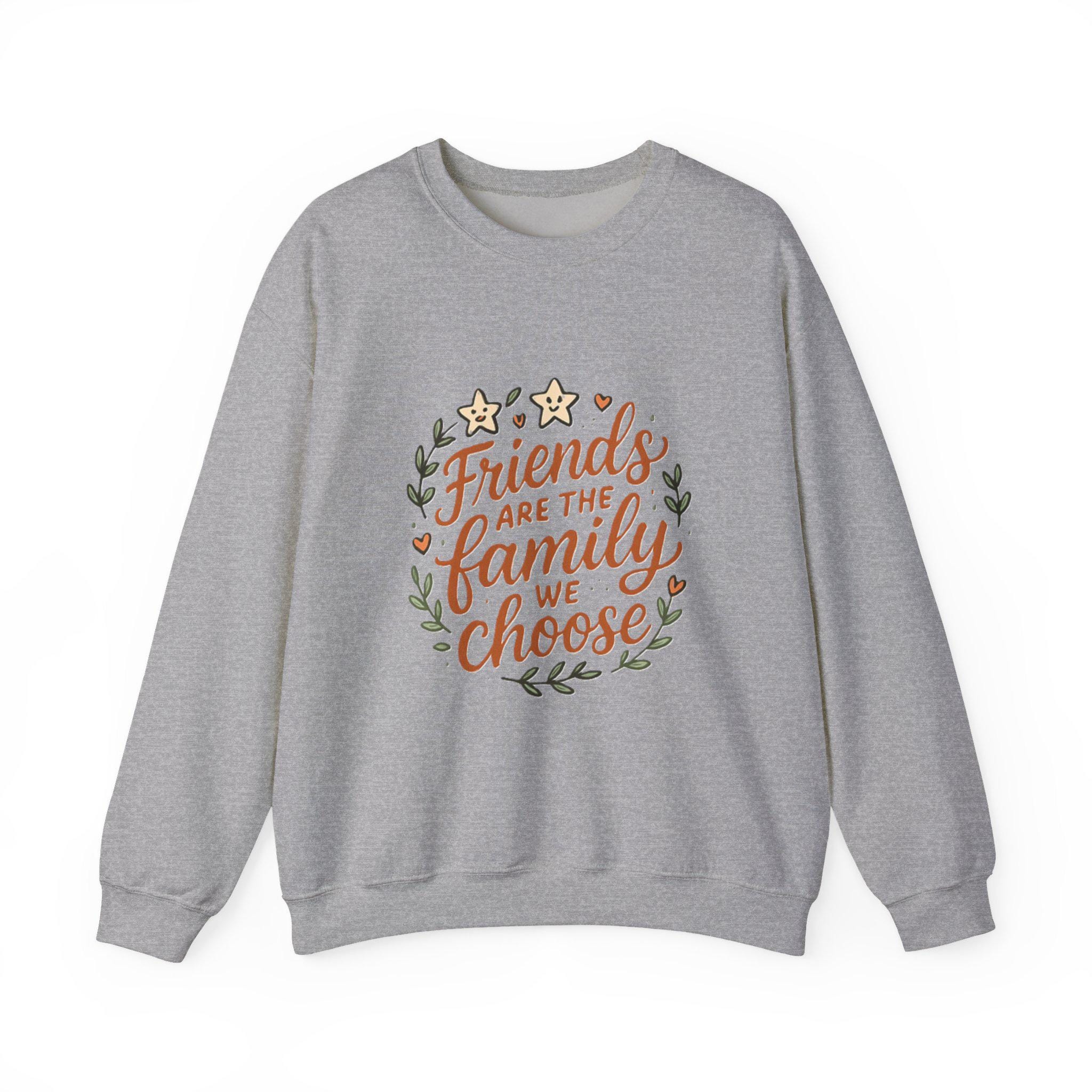 Soft, roomy, and quietly sentimental — this crewneck wraps you in comfort while carrying a warm message. The white sweatshirt features a hand-lettered floral wreath reading “Friends are the family we choose,” embroidered/printed in gentle earth tones. Wear it to cozy up on coffee porch mornings, bring it to casual friend gatherings, or pull it on after a long day when you want something that feels familiar and kind. The medium-heavy cotton-poly blend holds its shape, the ribbed collar and cuffs sit comfortably without pinch, and the clean, seam-free body keeps the silhouette smooth. It's an everyday piece that reads like a familiar note from someone who gets you.