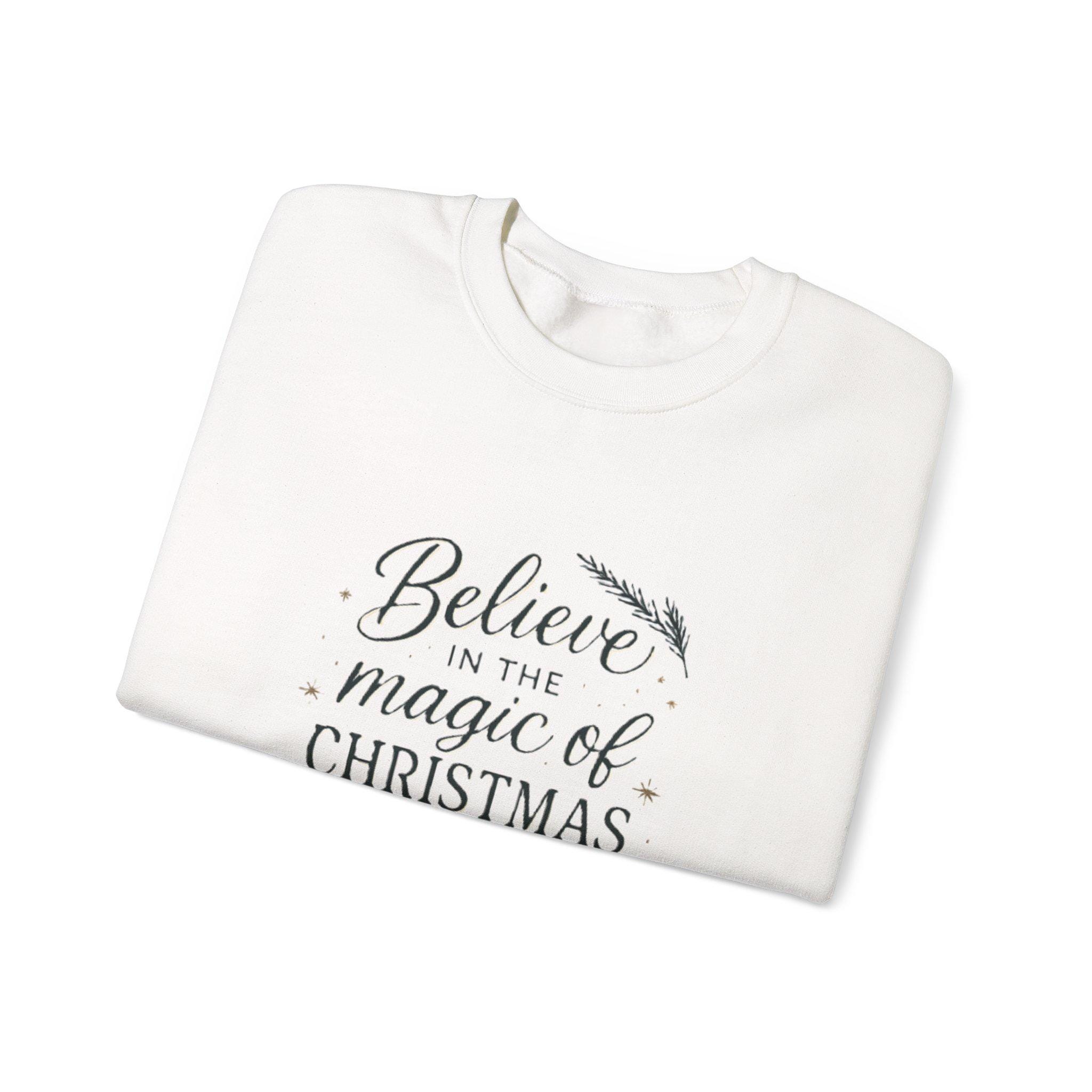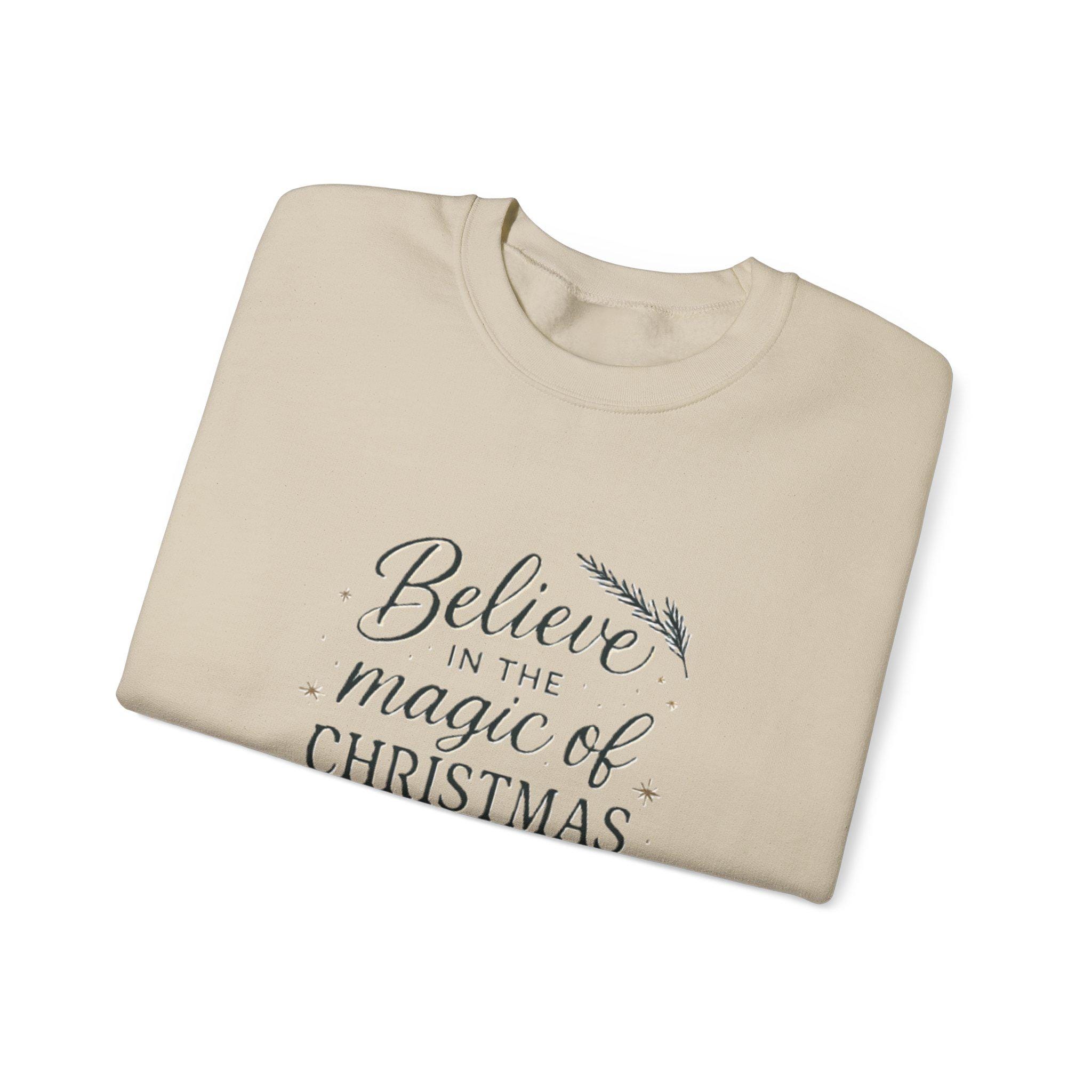 Soft, cozy, and quietly festive — this crewneck wraps you in the calm of a traditional holiday evening. The gentle cream fabric is a warm backdrop for a hand-lettered message that reads: “Believe in the magic of Christmas — peace, joy and goodwill — home for the holidays.” Subtle foliage accents and a muted palette keep the design understated and timeless. Wear it while sipping hot cocoa by the window, stringing lights with family, or lingering over slow morning coffee on a chilly winter day. The relaxed fit and durable construction mean it's comfortable for lazy holiday mornings and sturdy enough for seasonal gatherings that last all afternoon. Thoughtful details like a tear-away label and reinforced seams keep the focus on comfort and quiet celebration.