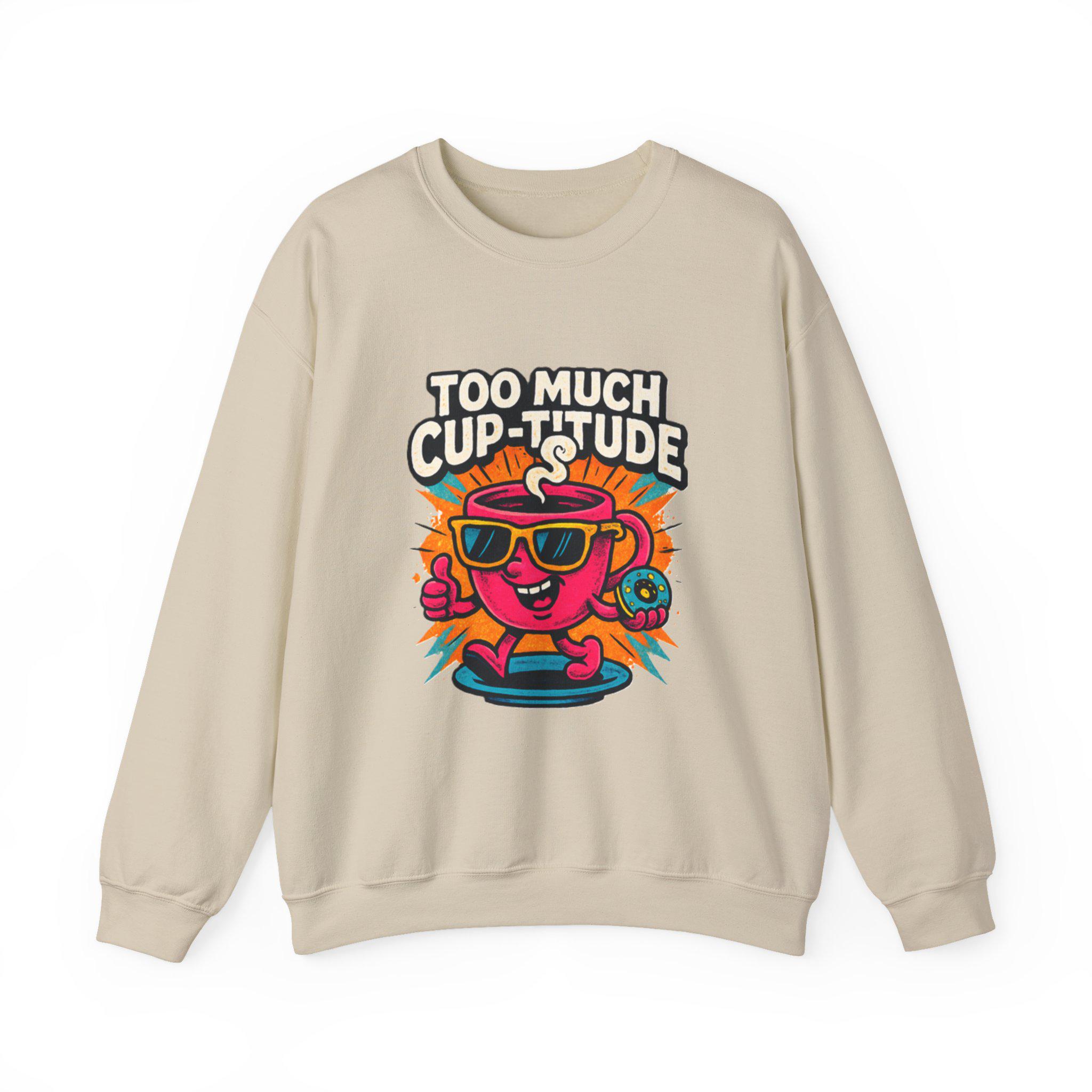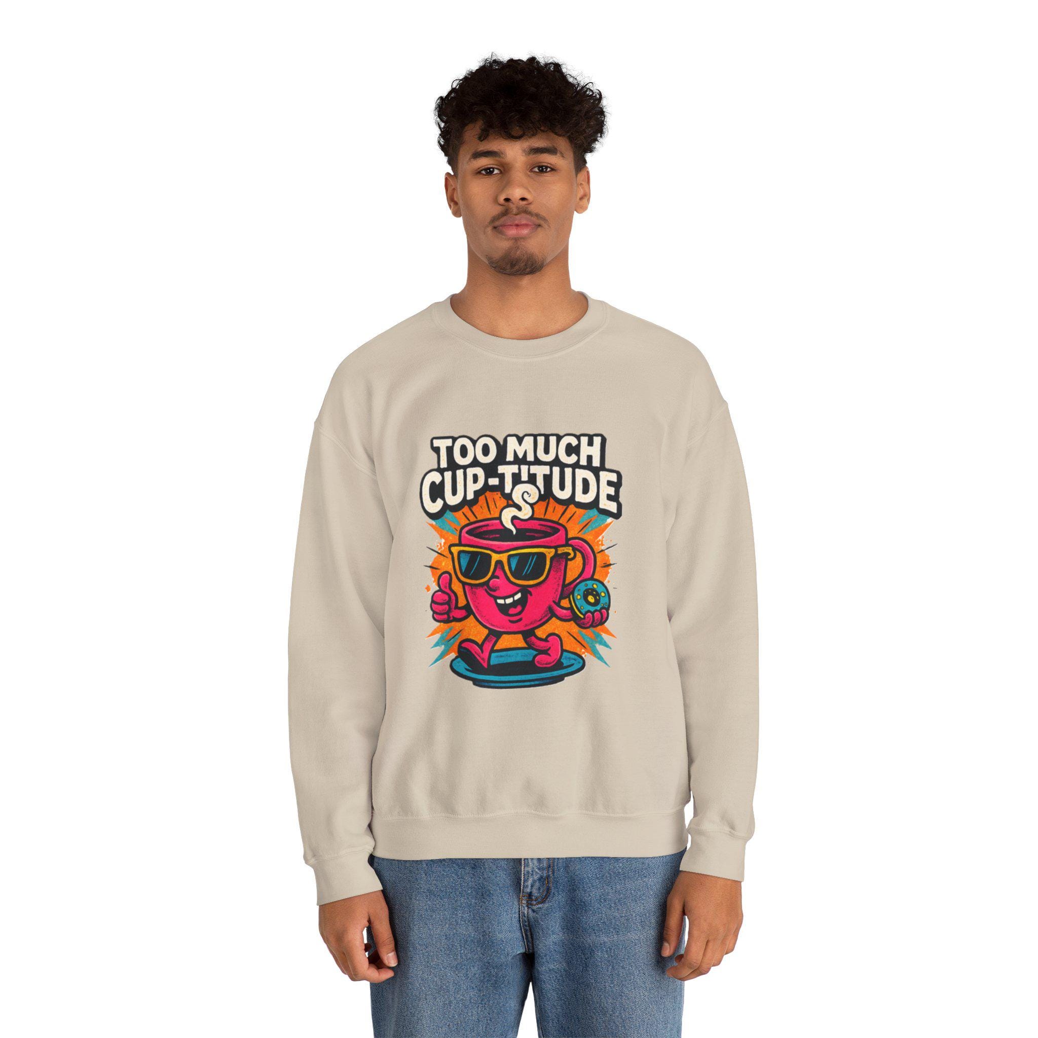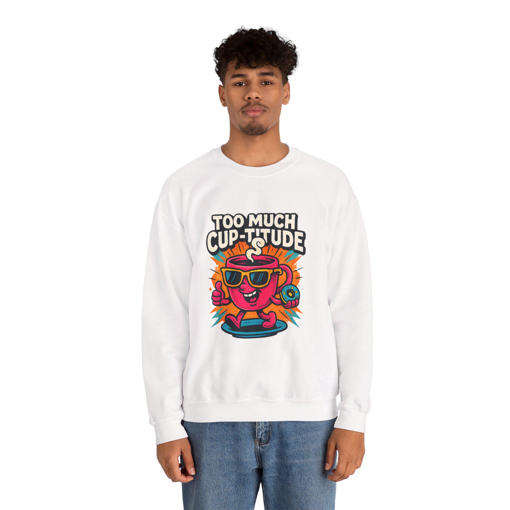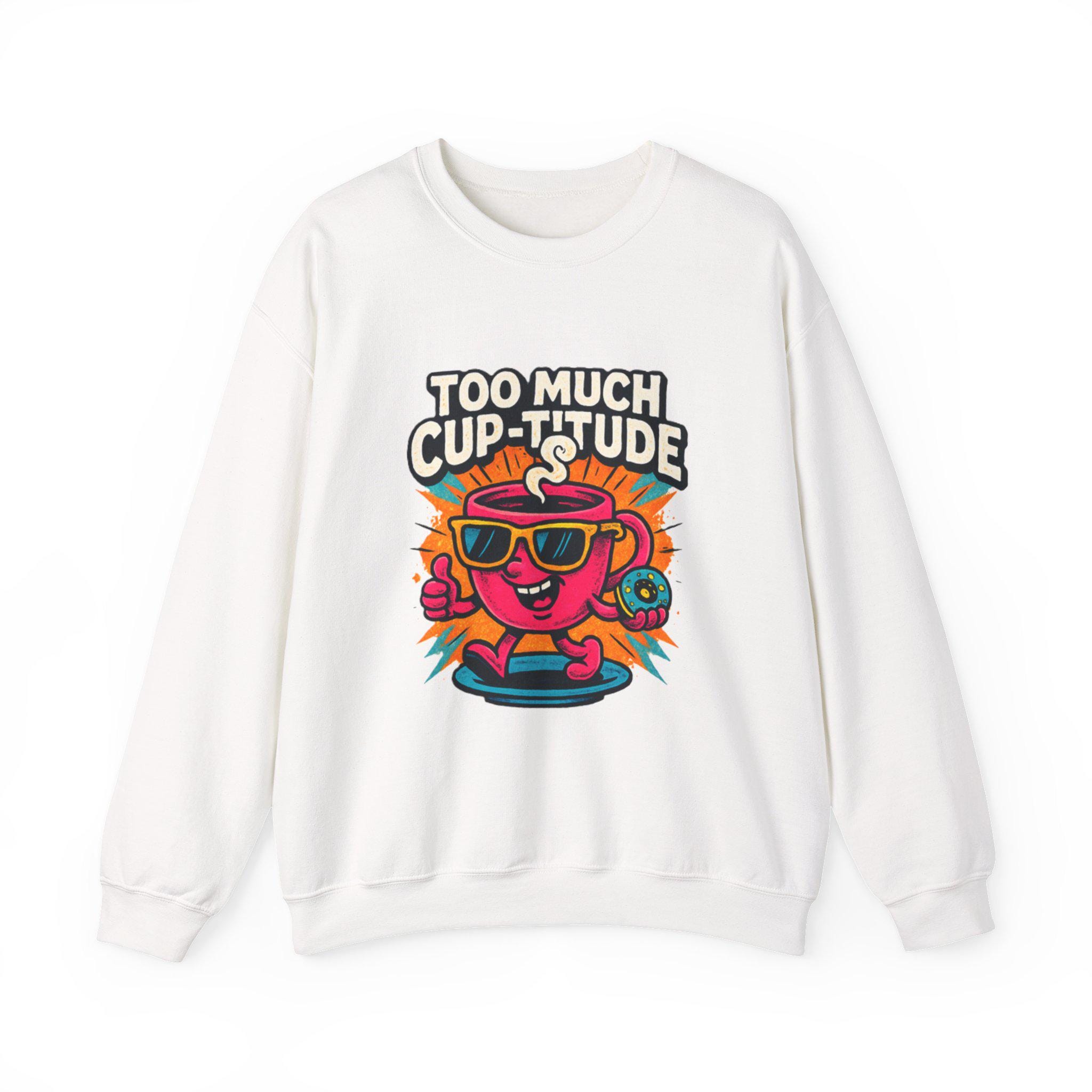 This cozy crewneck brings playful energy to everyday wear. The medium‑heavy cotton‑poly blend feels soft against the skin while holding its shape through wash after wash. A vibrant, retro cartoon print — a sunlit coffee cup wearing shades with the cheeky line “TOO MUCH CUP-TITUDE” — sits centered on the chest, adding bold color and personality to a clean white canvas. Built with tubular knit (no side seams) for a smooth silhouette and reinforced with double-needle stitching at stress points, the sweatshirt moves with you and lasts. Embroidered or printed label options and OEKO‑TEX certified dyes keep it comfortable and responsibly made. Wear it for slow mornings, road trips, or when you want to bring a little extra attitude to your coffee run.
