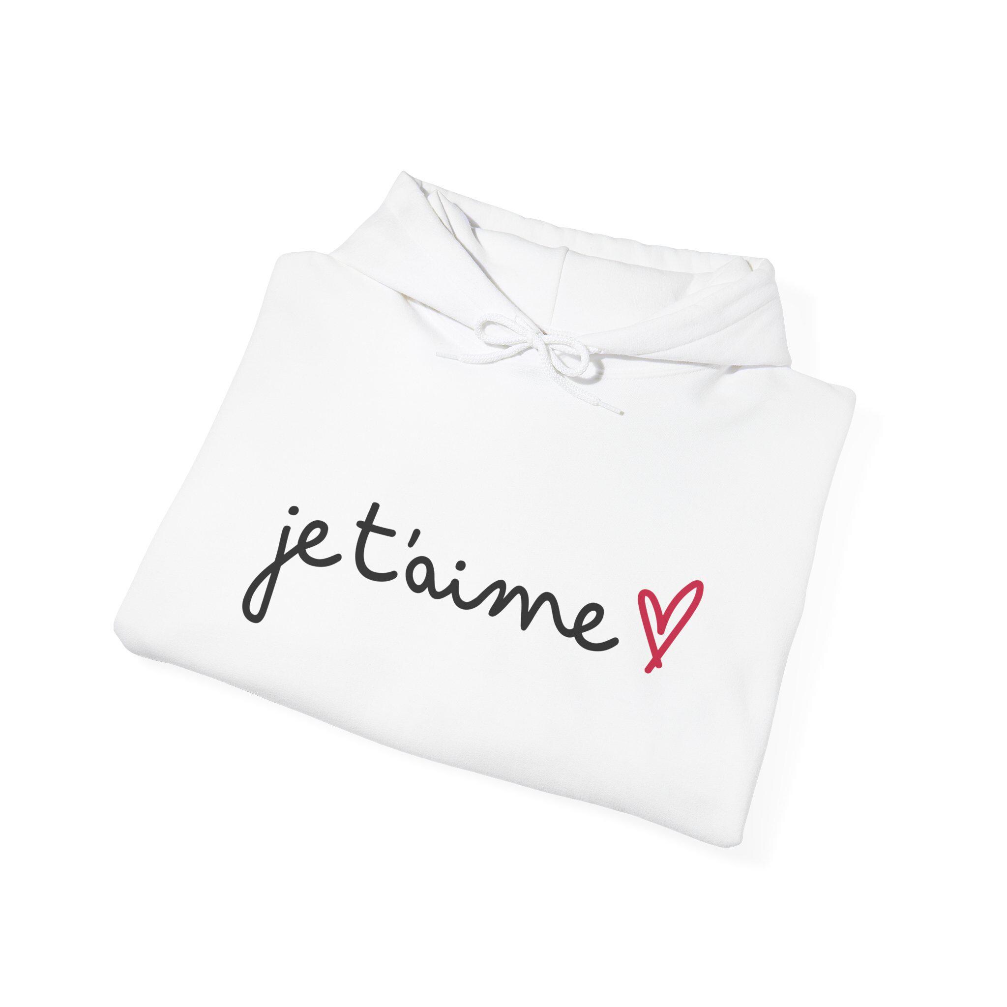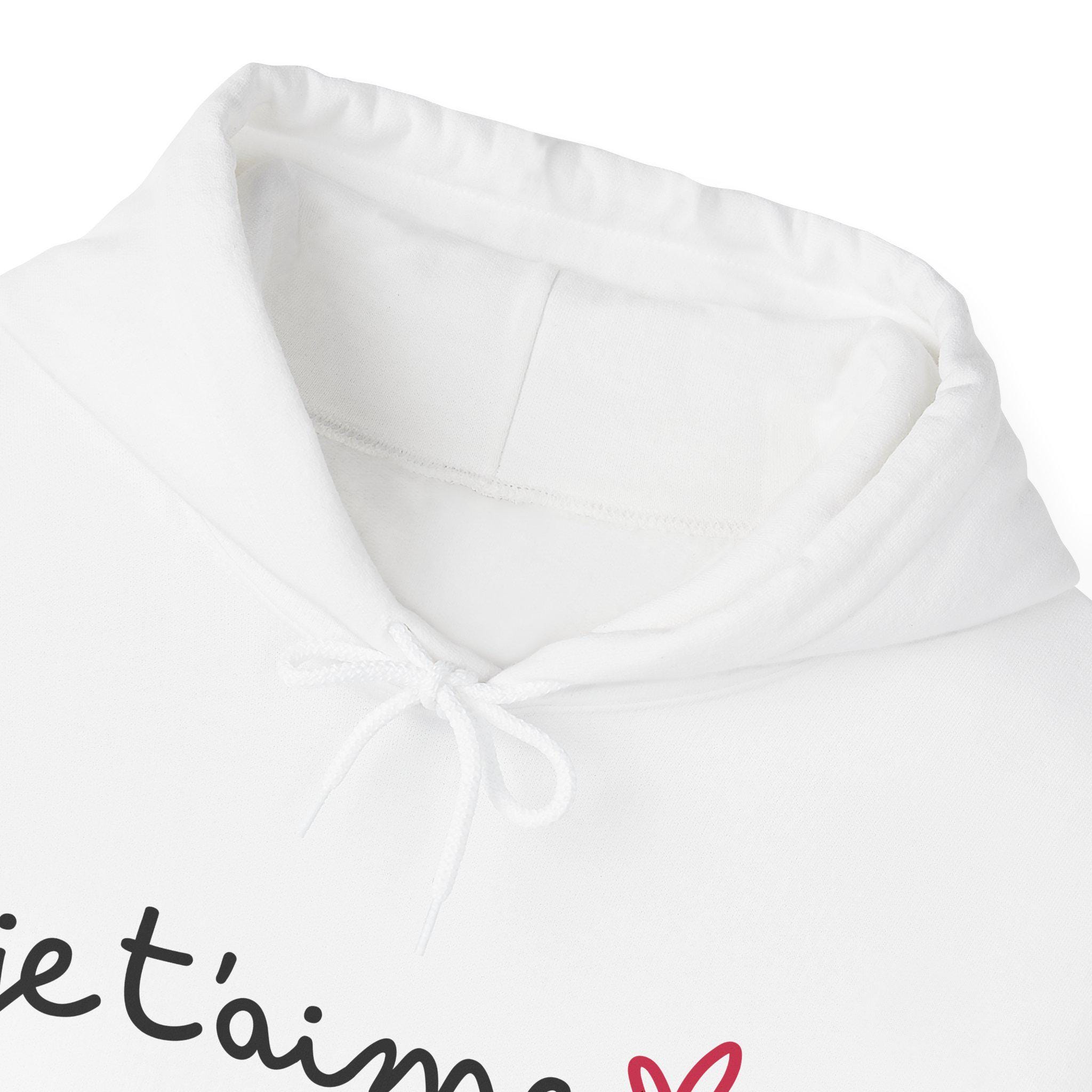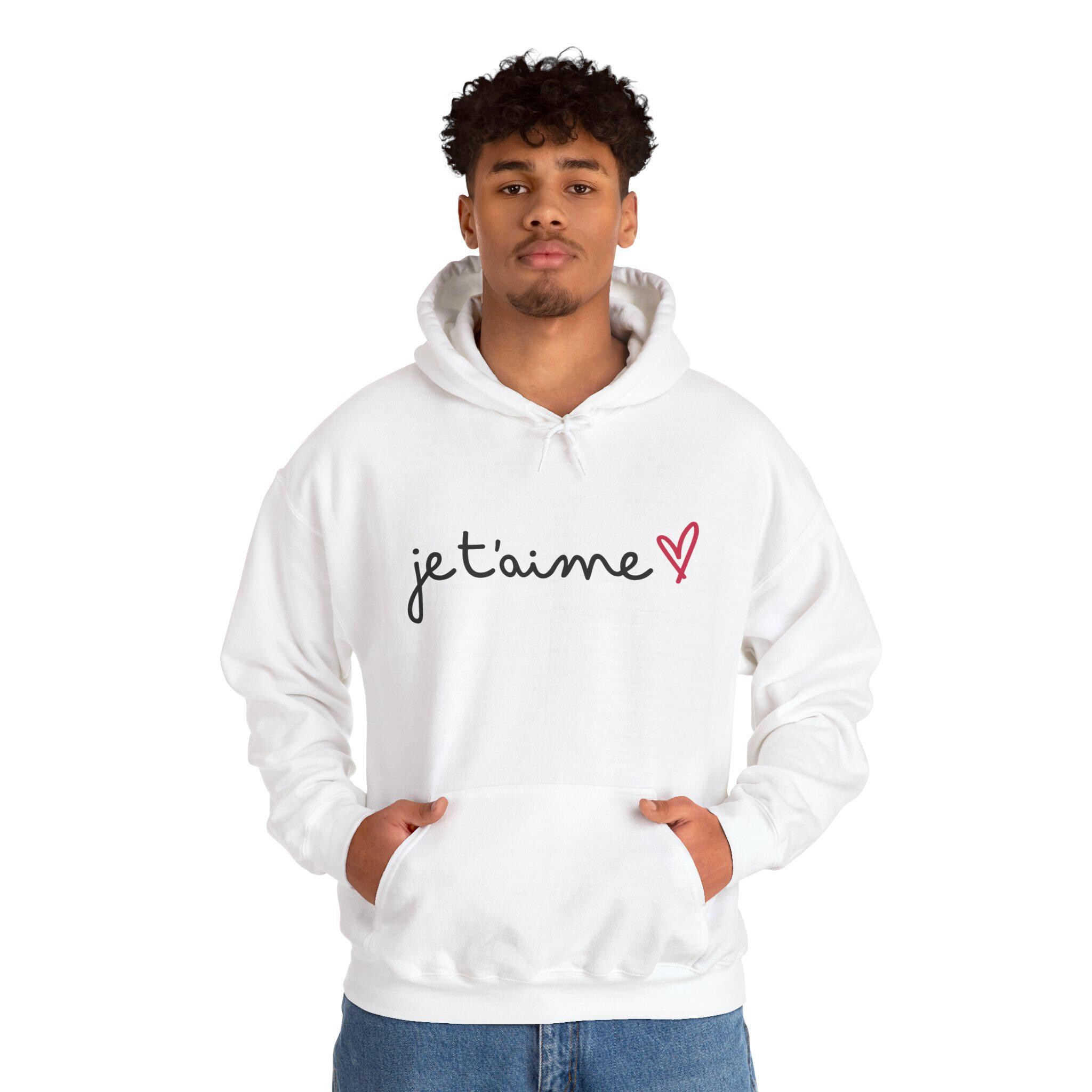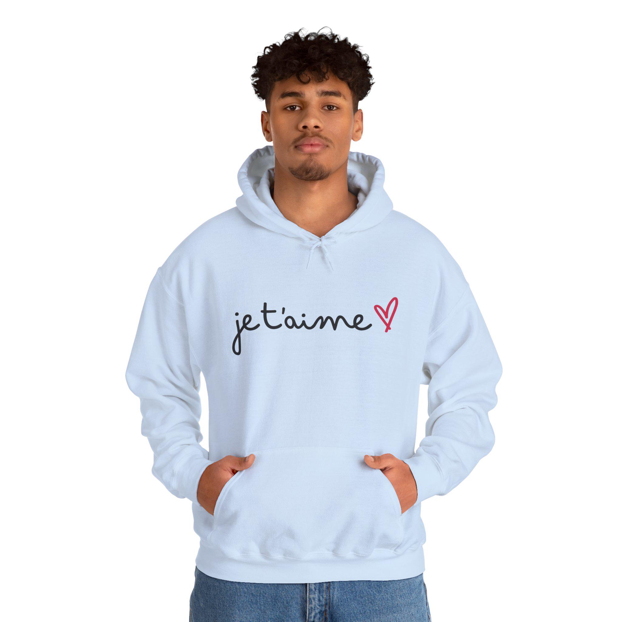 Soft, cozy, and quietly romantic — this hooded sweatshirt carries a handwritten "je t'aime" with a tiny pink heart across the chest. The clean, minimalist script feels like a sweet note slipped into a pocket: intimate, effortless, and easy to wear. Built from a medium-heavy 50/50 cotton-poly blend, the hoodie offers warmth without weight. The kangaroo pouch, double-lined hood, and color-matched drawcord make it both practical and polished. Wear it on slow mornings with coffee, on chilly evening walks, or layered under a coat for a date night that leans casual and sincere.
