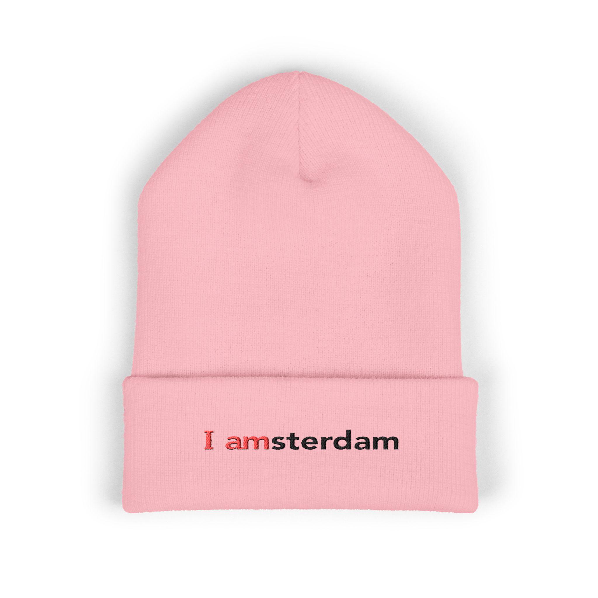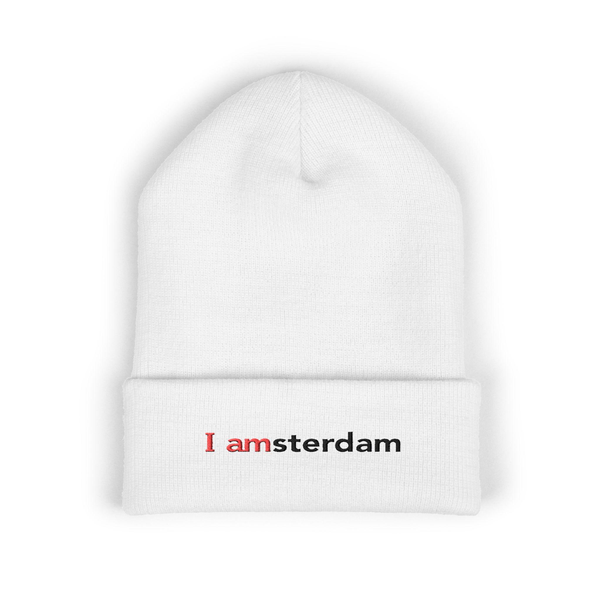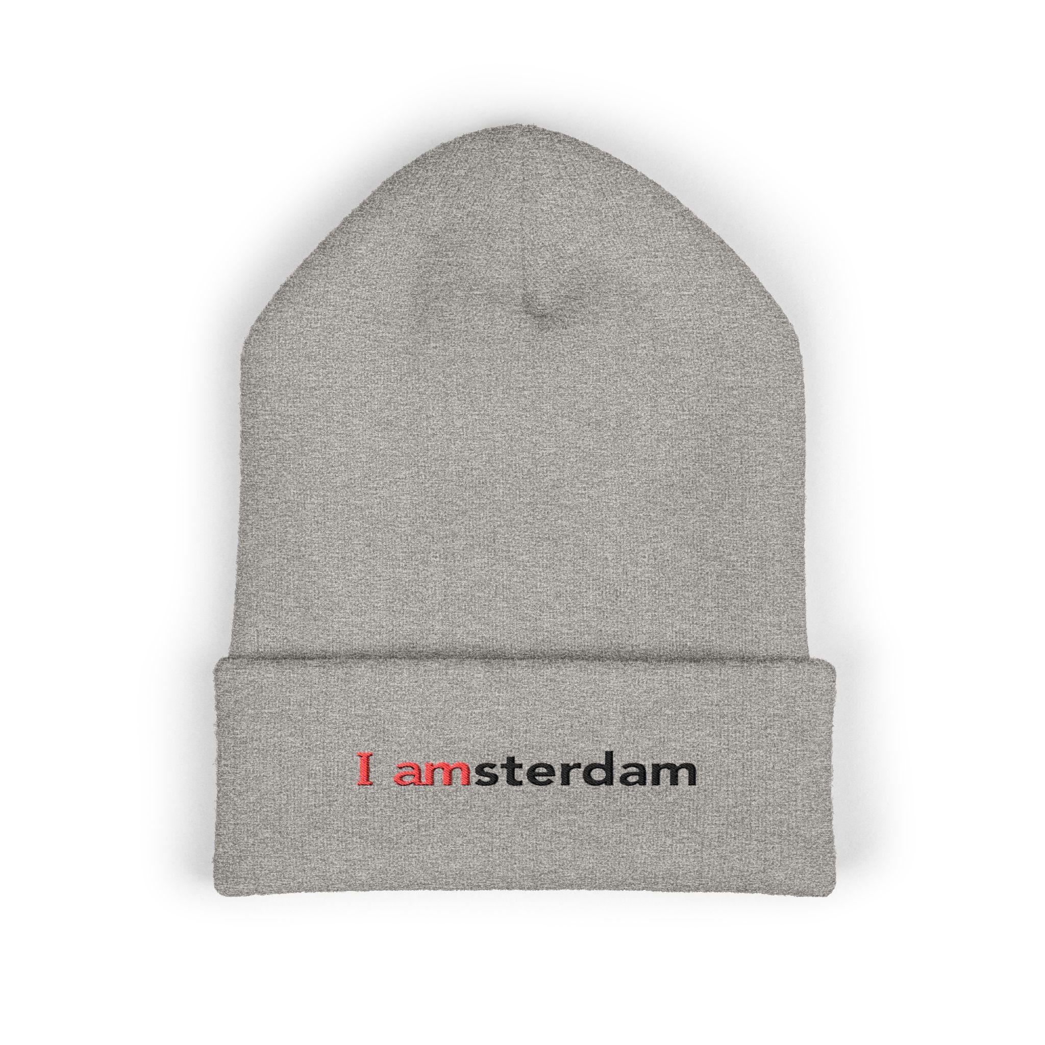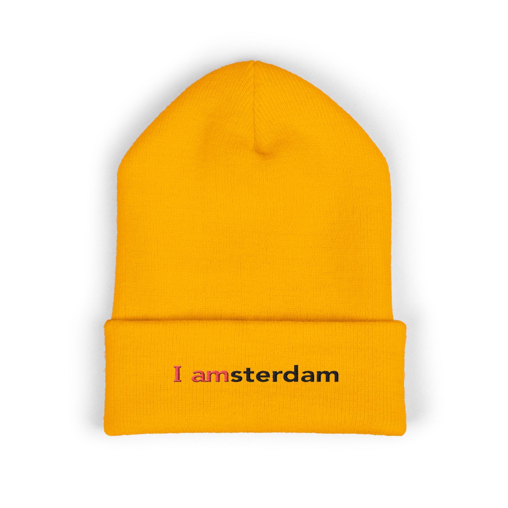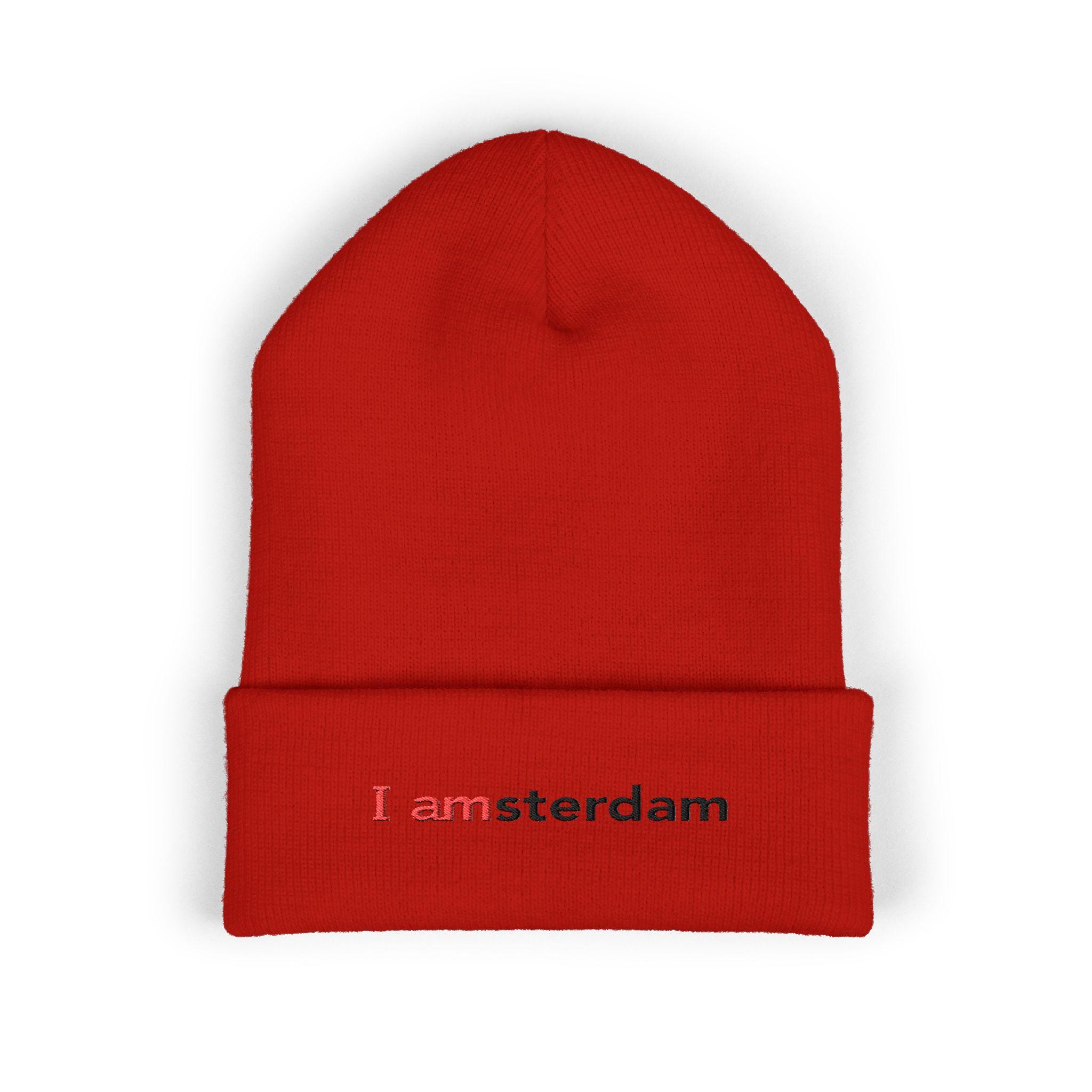 Soft, cuffed warmth with a quiet, clever twist. This embroidered beanie folds low over your ears and carries a small, typographic nod to Amsterdam — subtle in black with a touch of red for contrast. It's the kind of knit you pull on for early-morning walks, late-night subway rides, or when you want a calm, urban accent that says more by saying less. Lightweight but insulating, the acrylic yarn feels gentle against skin and resists common irritants, so it stays comfortable during long days outdoors or layered under a hood. Wear it cuffed or unfolded; Either way it settles into your rhythm and adds a considered detail to casual outfits.