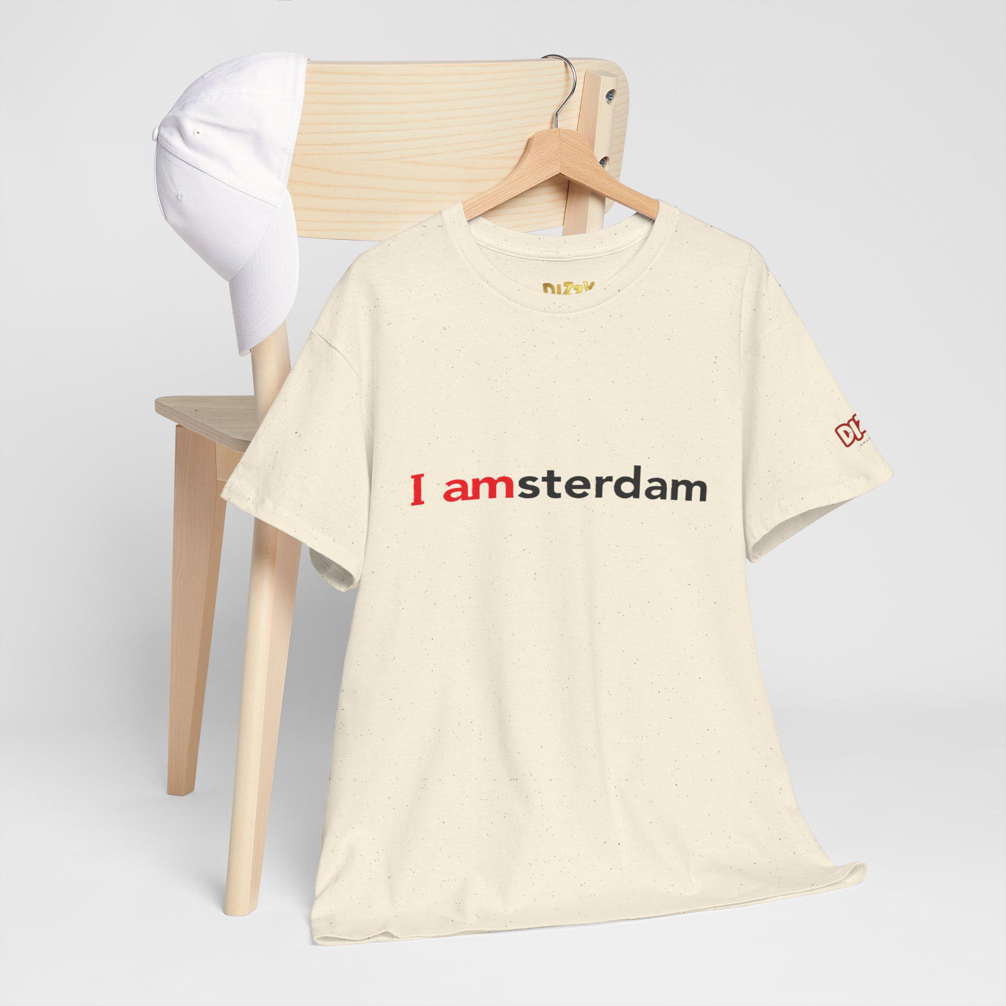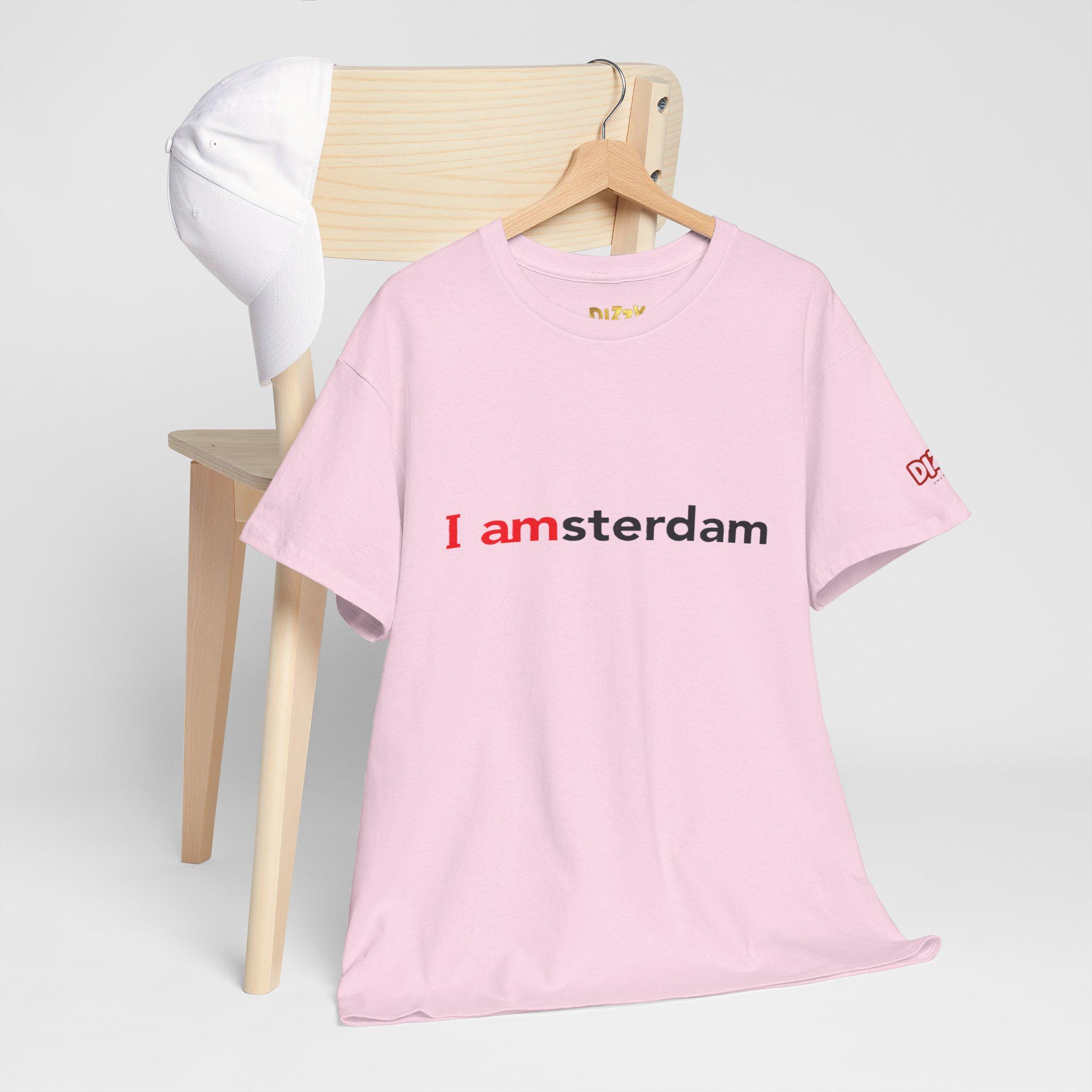 A stylish and comfortable T-Shirt featuring the iconic 'I amsterdam' design in DizzyAmsterdam style, perfect as a city souvenir. This unisex heavy cotton tee is made from specially spun fibers for a strong and smooth fabric, suitable for printing. The classic fit and crew neckline make it versatile for any occasion, casual or semi-formal. Ideal for adults and those looking for a unique and trendy shirt to commemorate their visit to Amsterdam or as a gift for city enthusiasts.