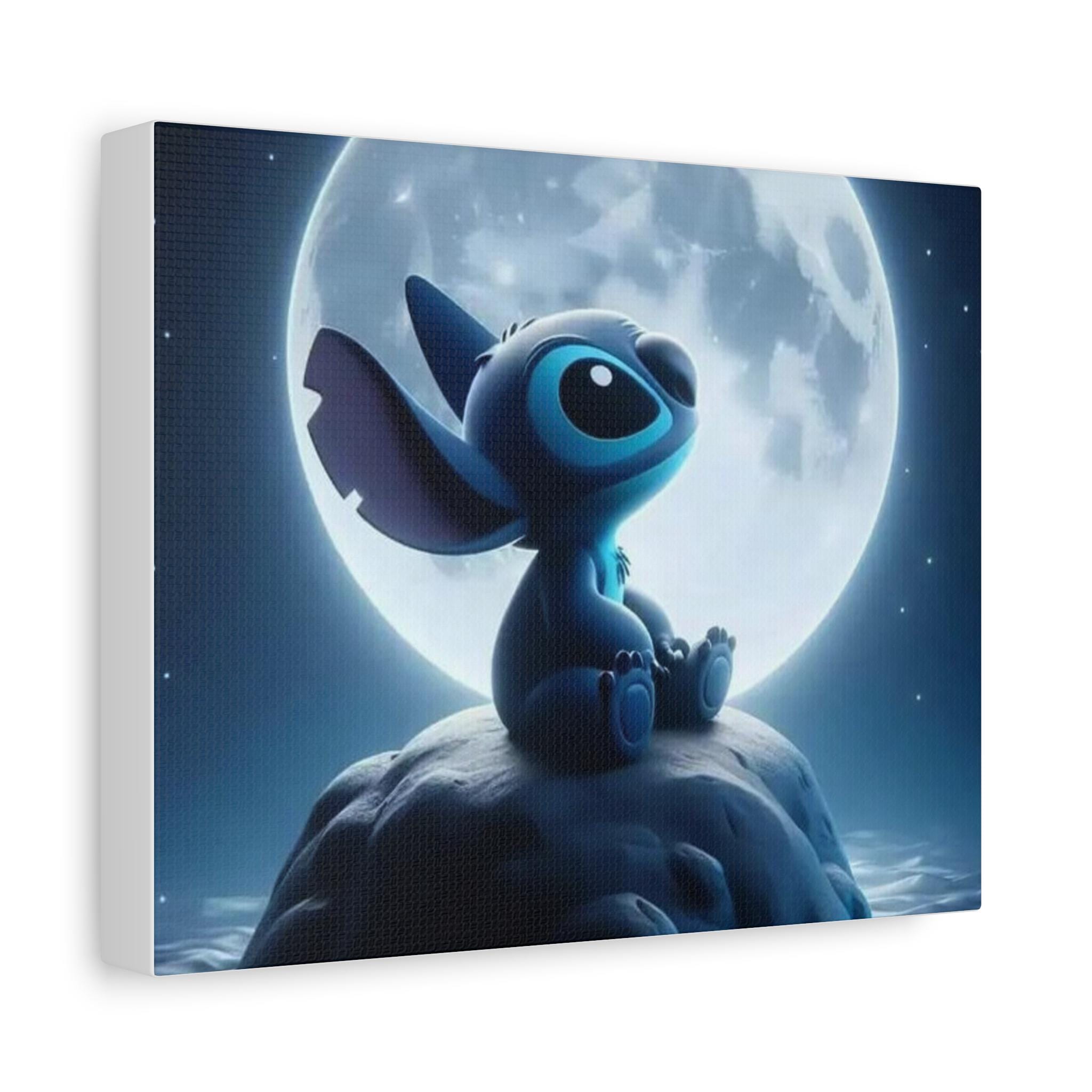 A matte stretched canvas print that brings quiet wonder to any room. This gallery-style canvas shows a small, wide-eyed character bathed in moonlight, sitting on a rocky outcrop beneath a luminous full moon. The deep blues and soft glows create a serene, bedtime-story atmosphere—perfect for nurseries, cozy corners, or fans of whimsical, celestial art. The image is printed with UL-certified Greenguard Gold latex inks on a cotton-poly canvas and stretched over a slim 1.25" pine frame for a clean, modern profile. Soft rubber dots on the back keep the canvas steady when displayed, and the included hanging hardware makes placement simple. Each piece is responsibly made with FSC-sourced inner frames and durable coatings that preserve detail and color for years.