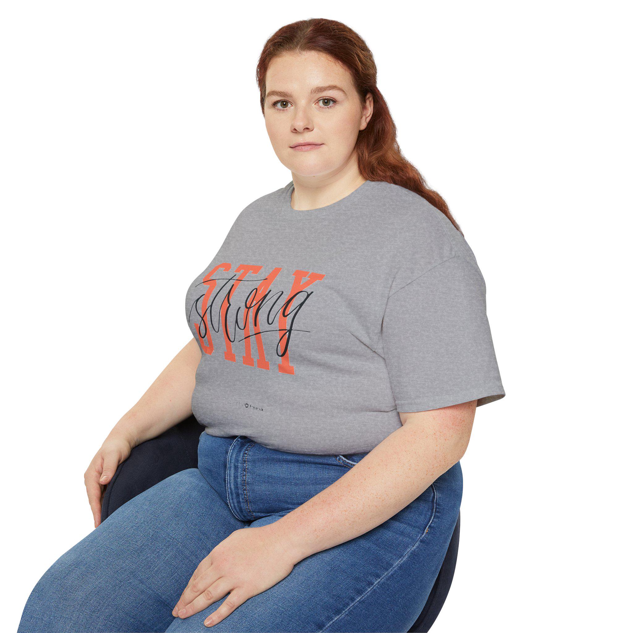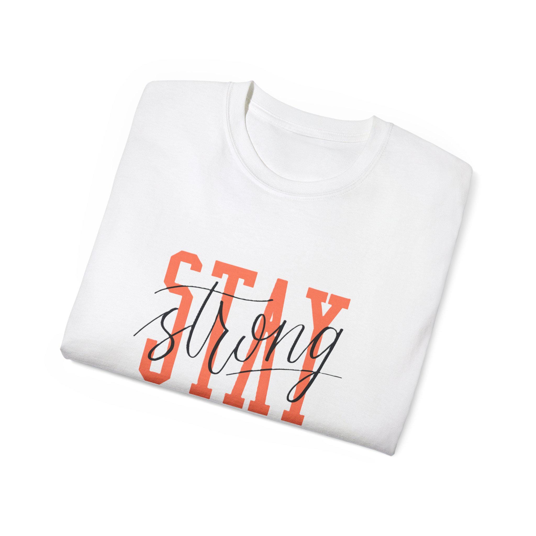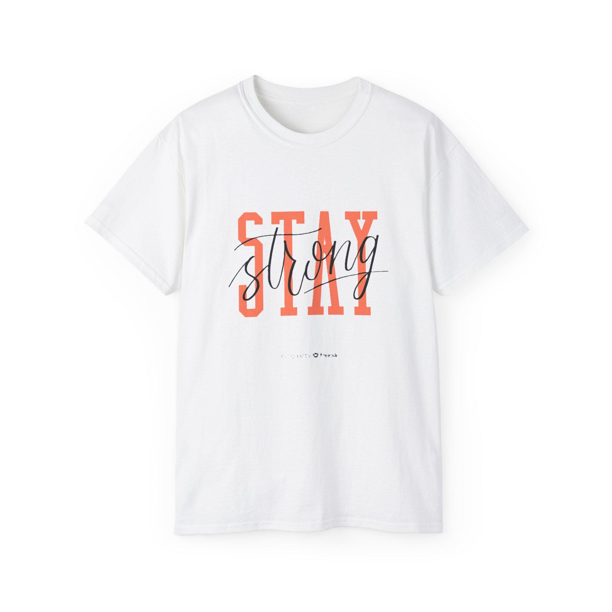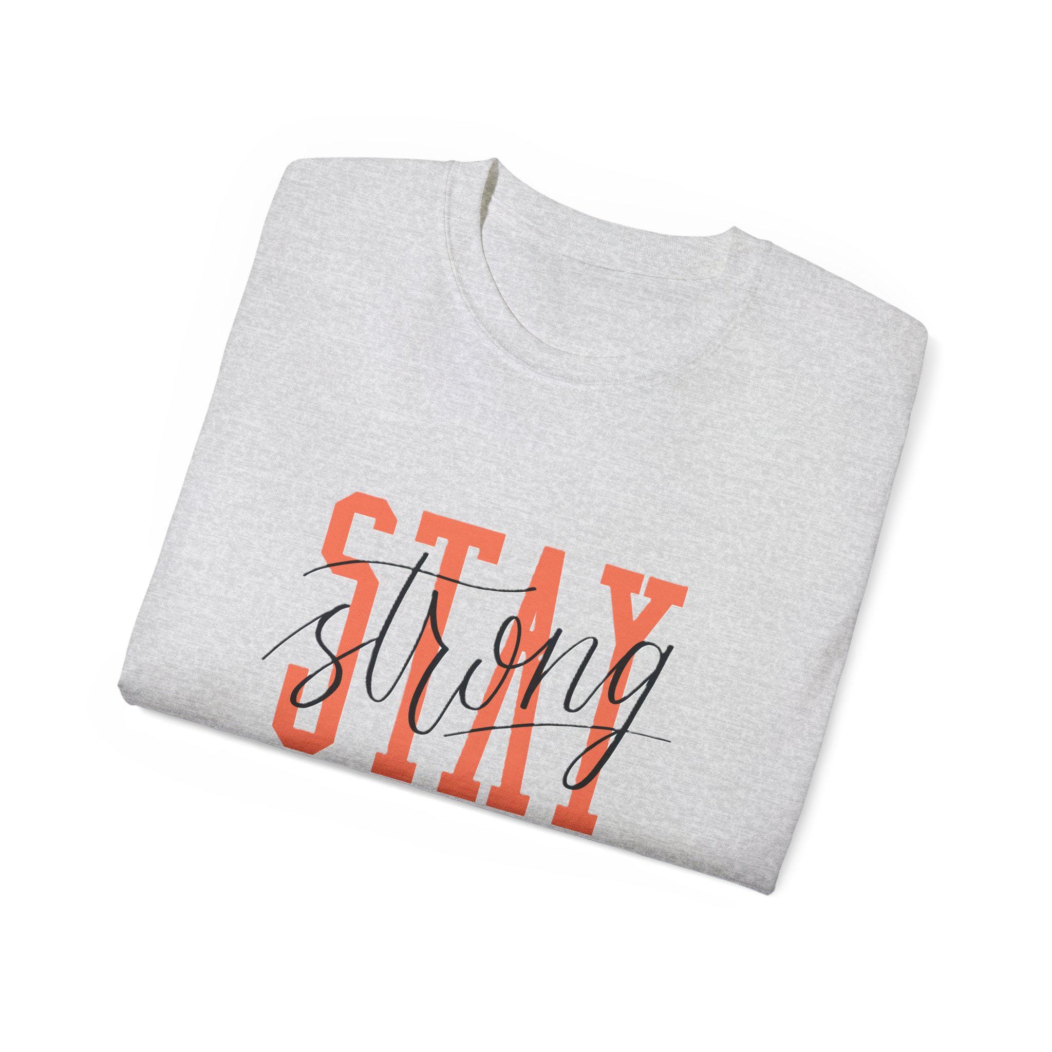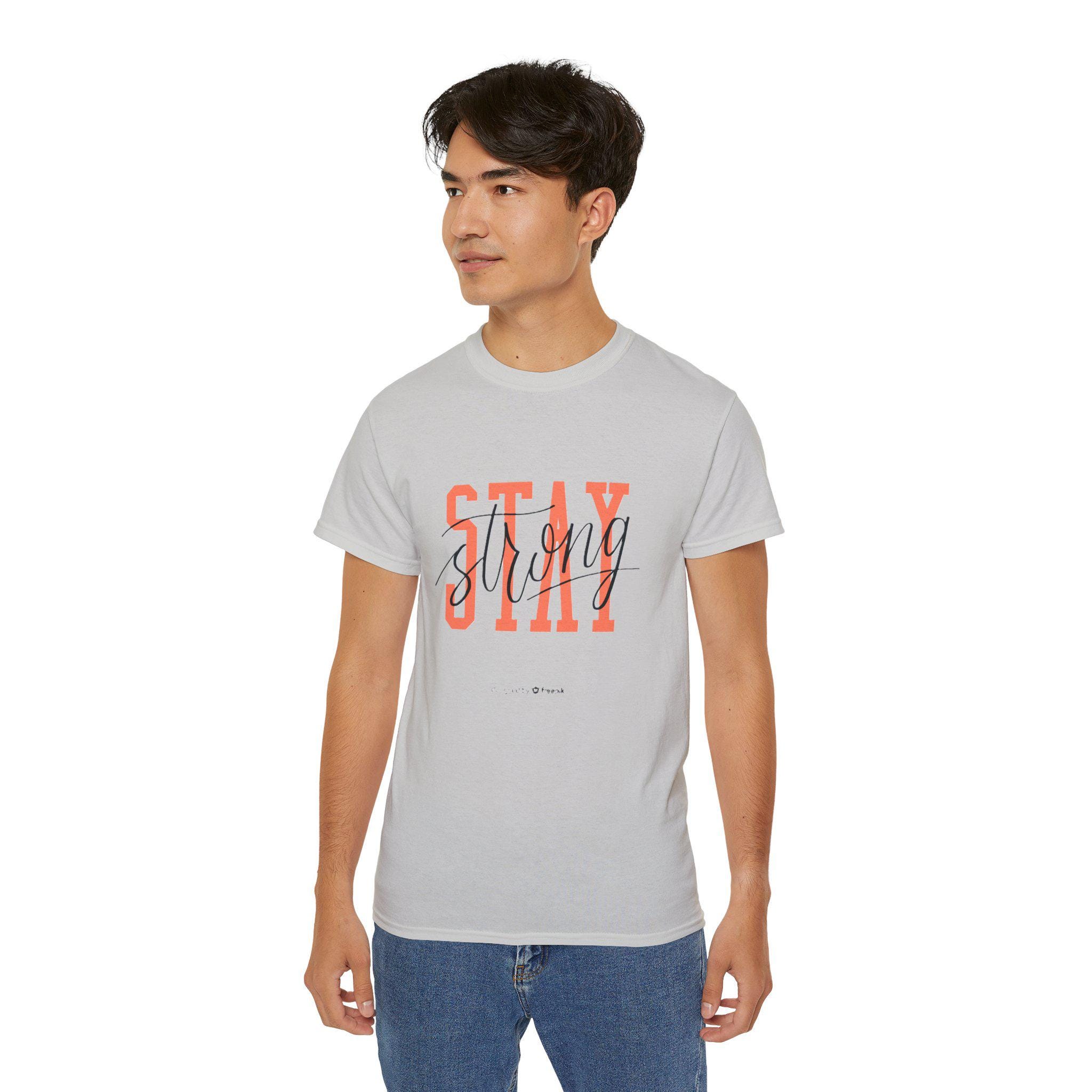 Stay Strong graphic tee with inspirational typography design. This T-Shirt gives a positive and motivational vibe, perfect for anyone seeking encouragement and strength. Ideal for everyday wear and can be worn by adults for various casual and semi-formal occasions. Relevant for holidays, celebrations, and events focused on positivity and self-motivation.
